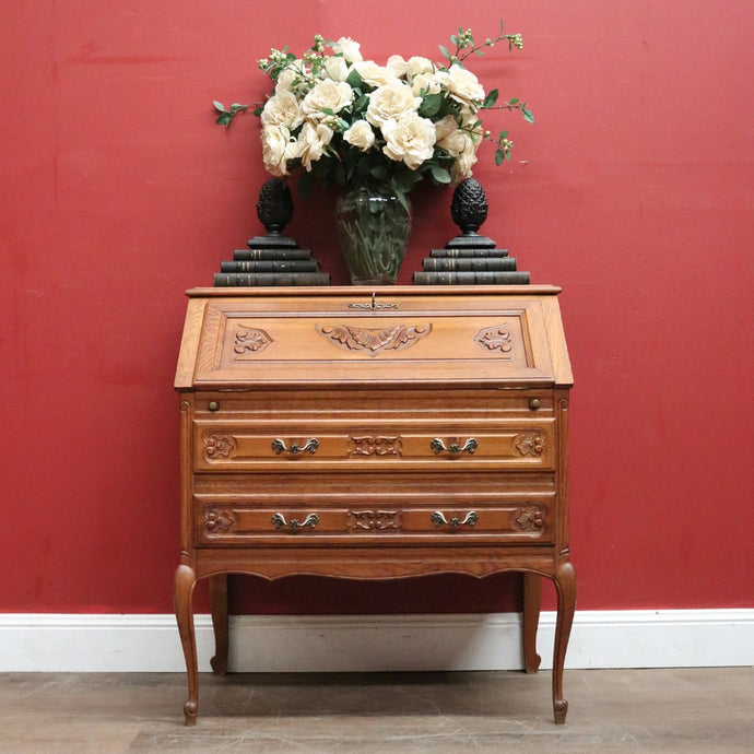 x SOLD French Oak Writing Bureau – Drop Front, Carved Detail, Brass Handles, Key. B12311