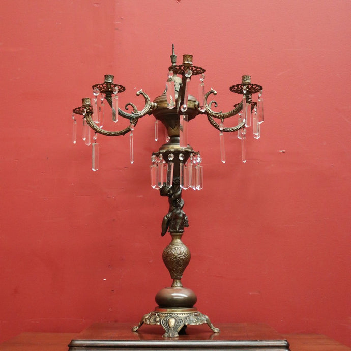 x SOLD Antique French Brass and Copper Six-Branch Candelabra, Glass Lustre Drops. B12369