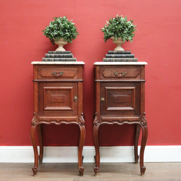 x SOLD A Pair of Antique French Oak and Marble Bedside Cabinets or Bedside Tables. B12091