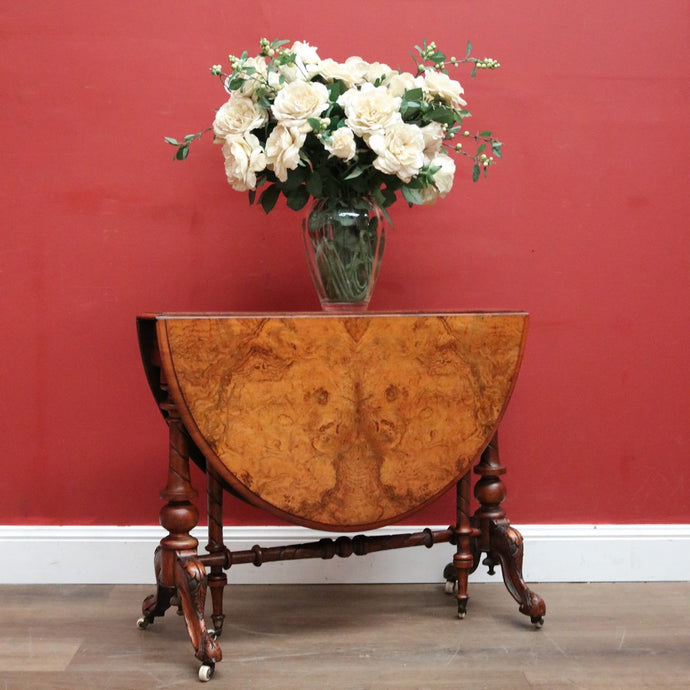 x SOLD Antique English Burr Walnut Drop Leaf Table, Wine, Side, Sutherland Table. B11810