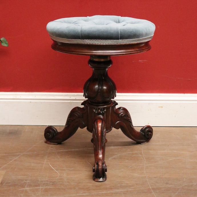 SOLD Antique Australian Cedar Piano Stool, Button Seated Blue Velvet Swivel Stool. B11770