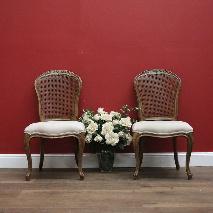 x SOLD Pair of Vintage French Oak and Cane Hall Chairs or Bedroom Chairs. Linen Fabric. B11267