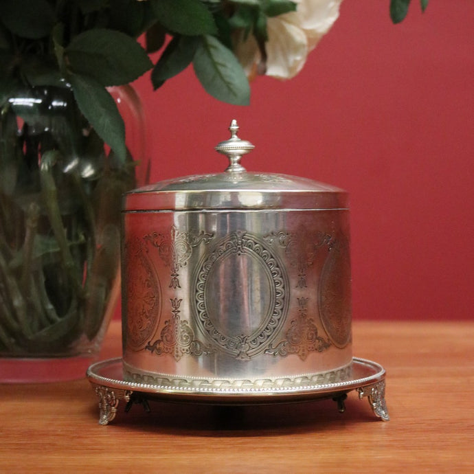 x SOLD Antique Silver Plate Biscuit Barrel Lift Lid Embossed Body Antique Lidded Vessel. B11244