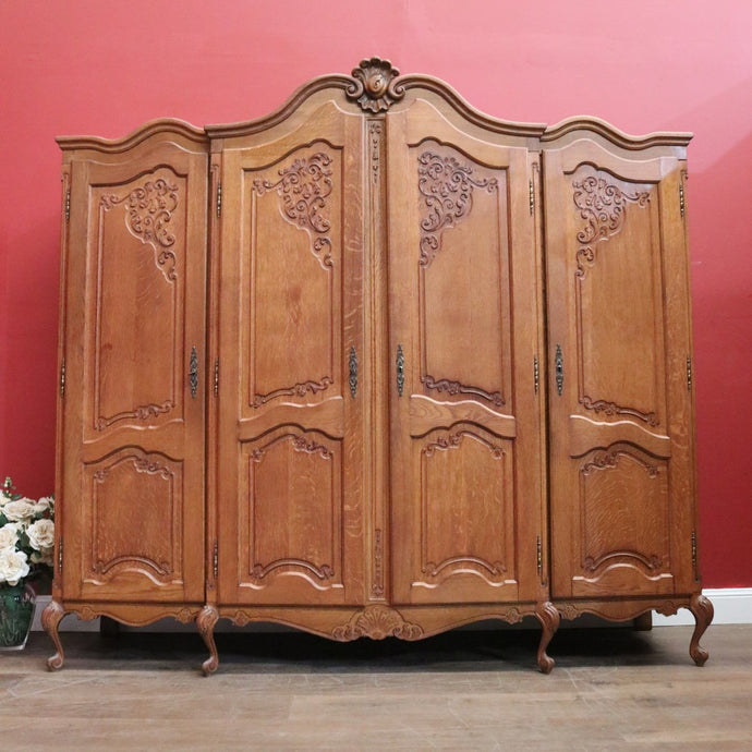 x SOLD Antique French Oak Breakfront Wardrobe, Four-Door with Carved Detail & Storage. B12307