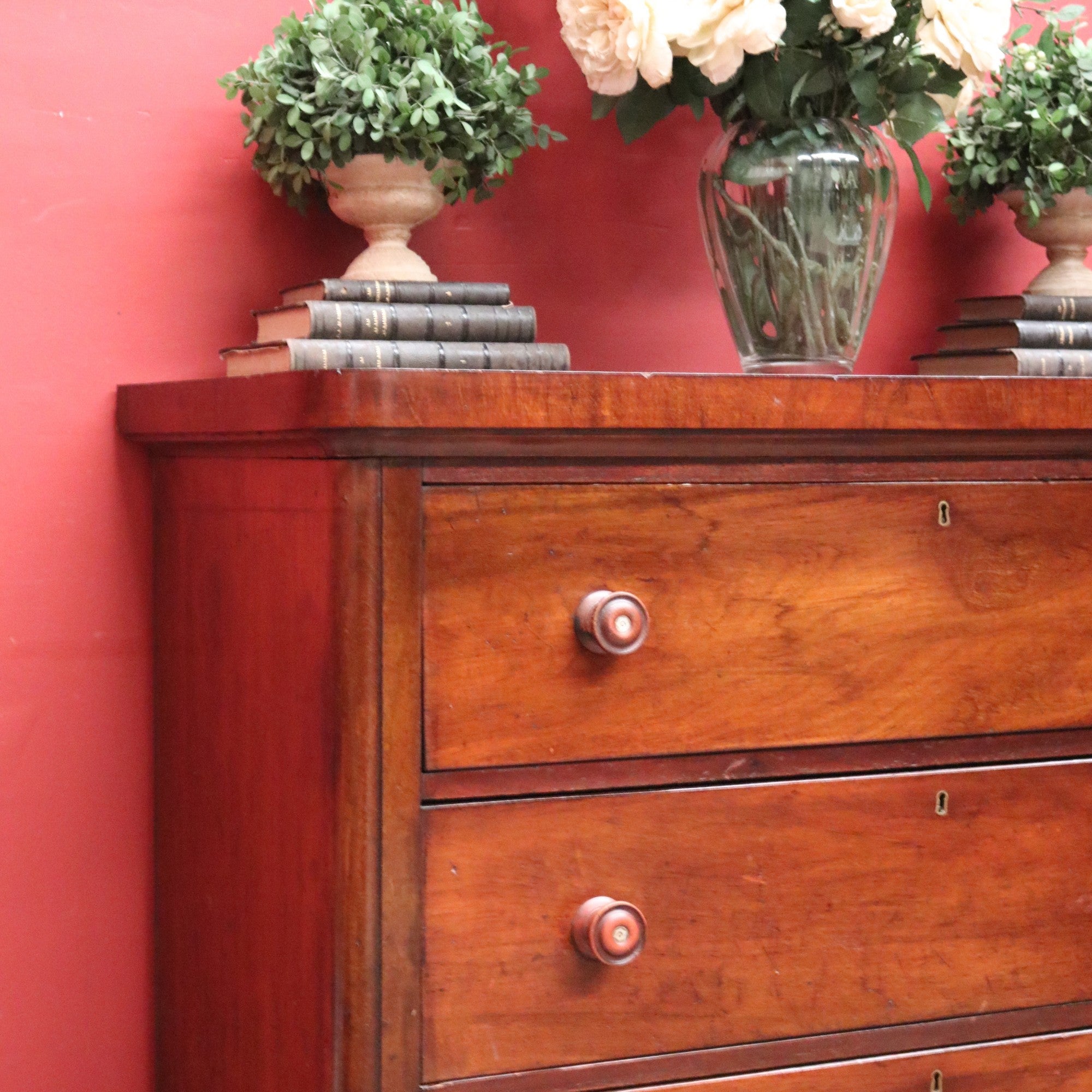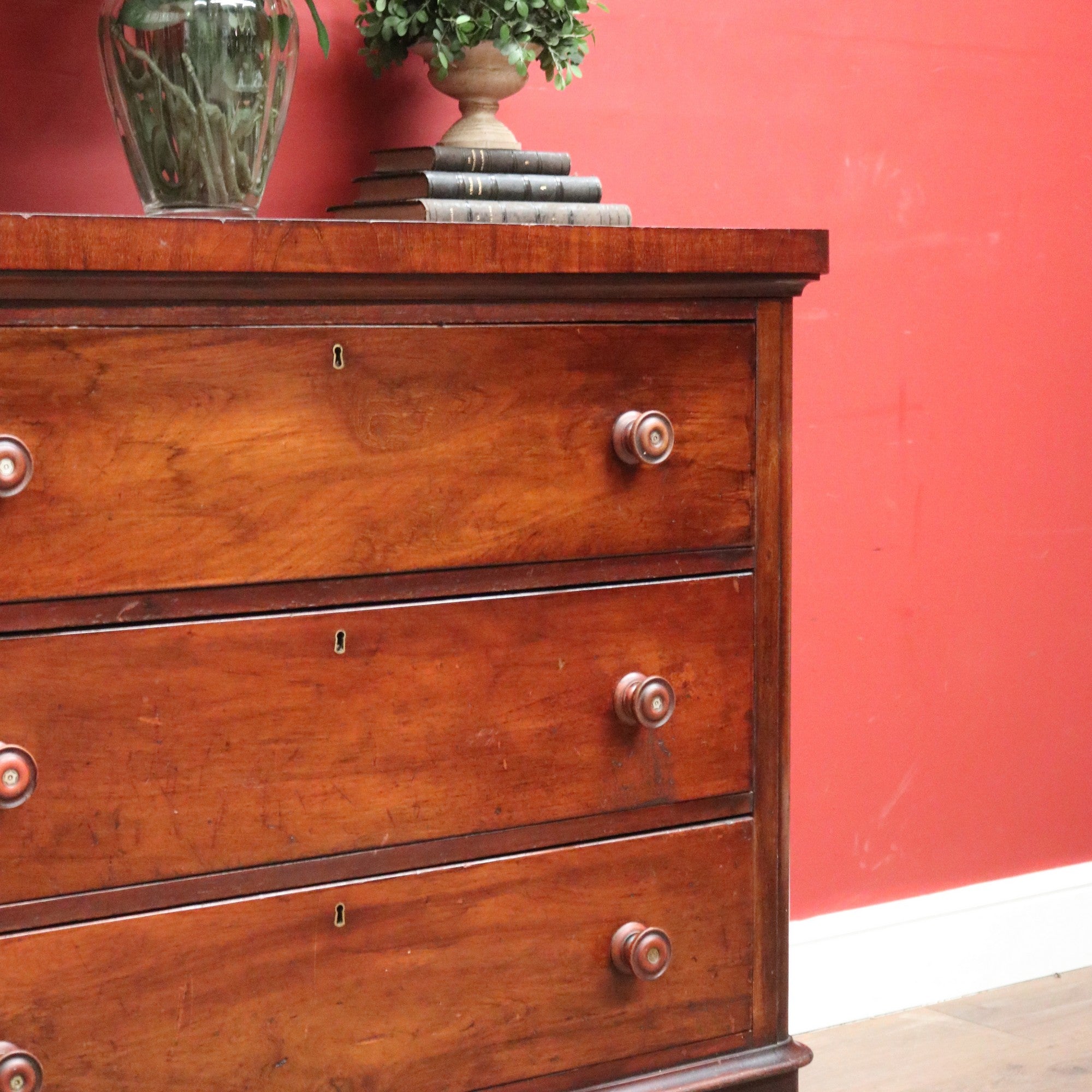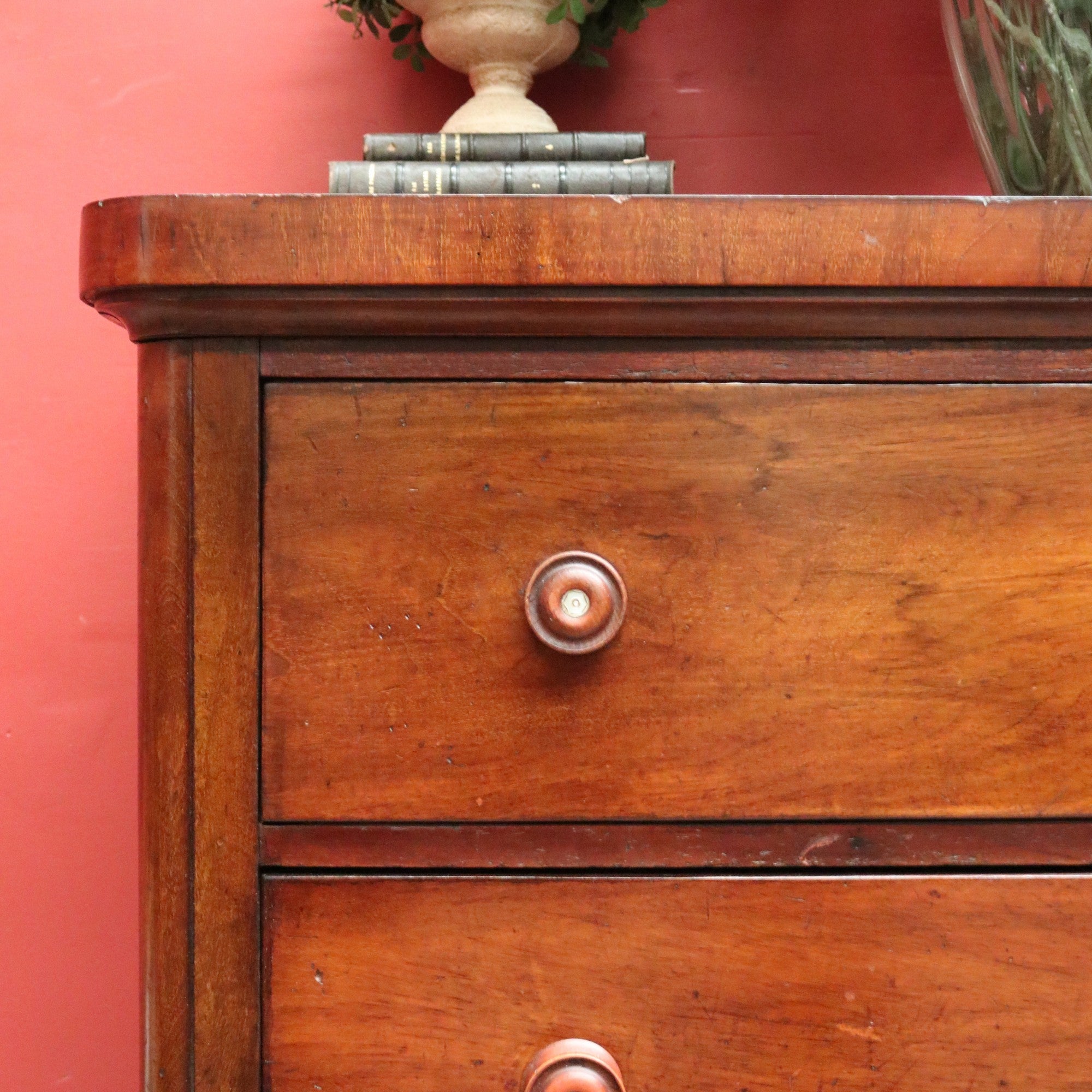 Description: A fine example of Australian craftsmanship, this antique cedar chest of drawers combines practicality with elegant detailing. Comprising three full cedar drawers constructed with traditional handmade dovetail joints and cedar backboards, it showcases quality from every angle. The drawer fronts, sides, backs, and bases are all made of cedar, reflecting careful and authentic workmanship.