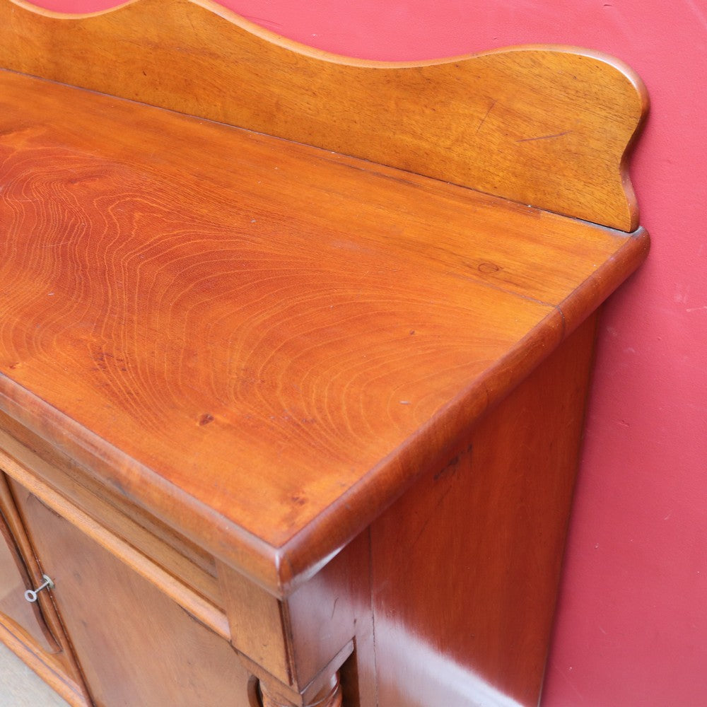 Description: Antique Australian cedar chiffonier featuring two shield-front doors with a single long drawer above. Constructed entirely from cedar, showcasing warm tone and fine grain. Includes key and small backboard, with elegant cotton reel columns to each side. A well-proportioned and beautifully made piece offering both character and storage.