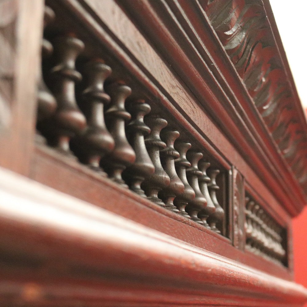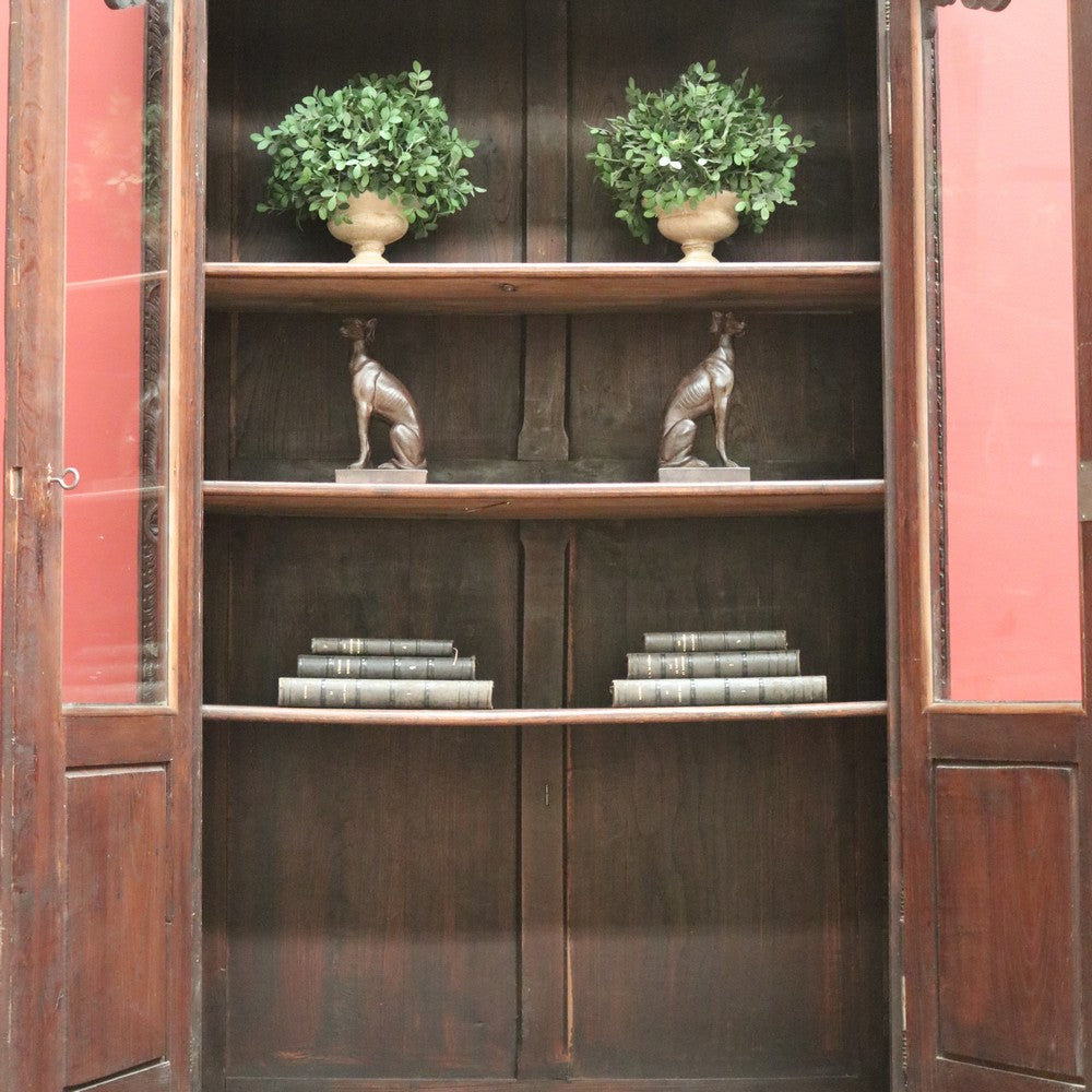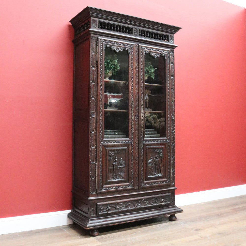 Description This cabinet has three adjustable shelves, original glass to the doors, carved scenes to the doors, a key and a single drawer to the base.