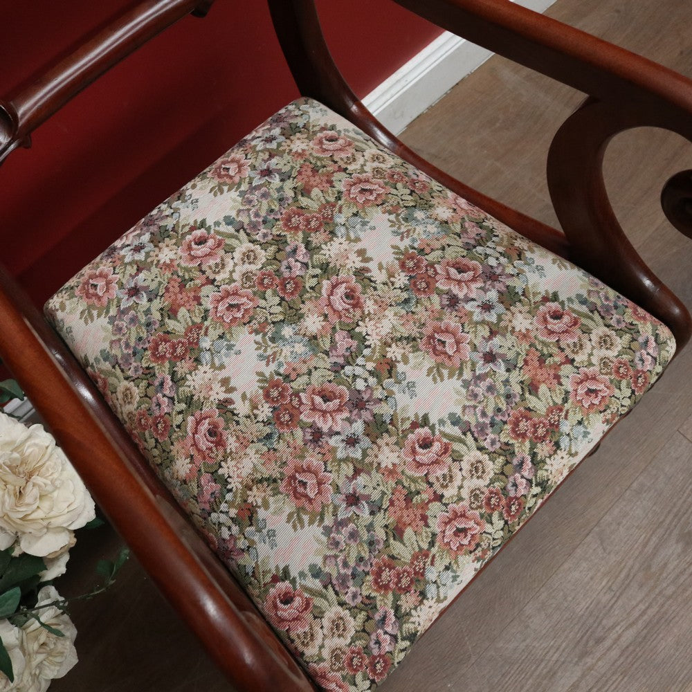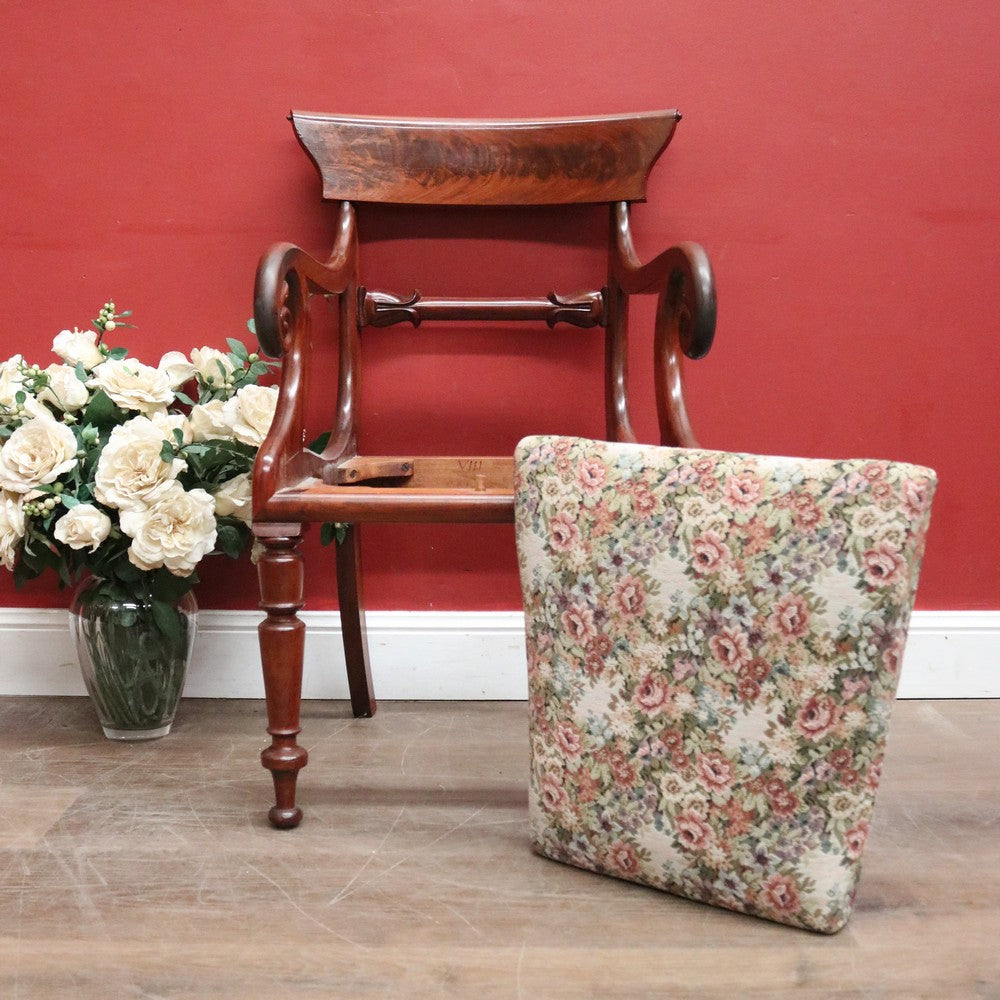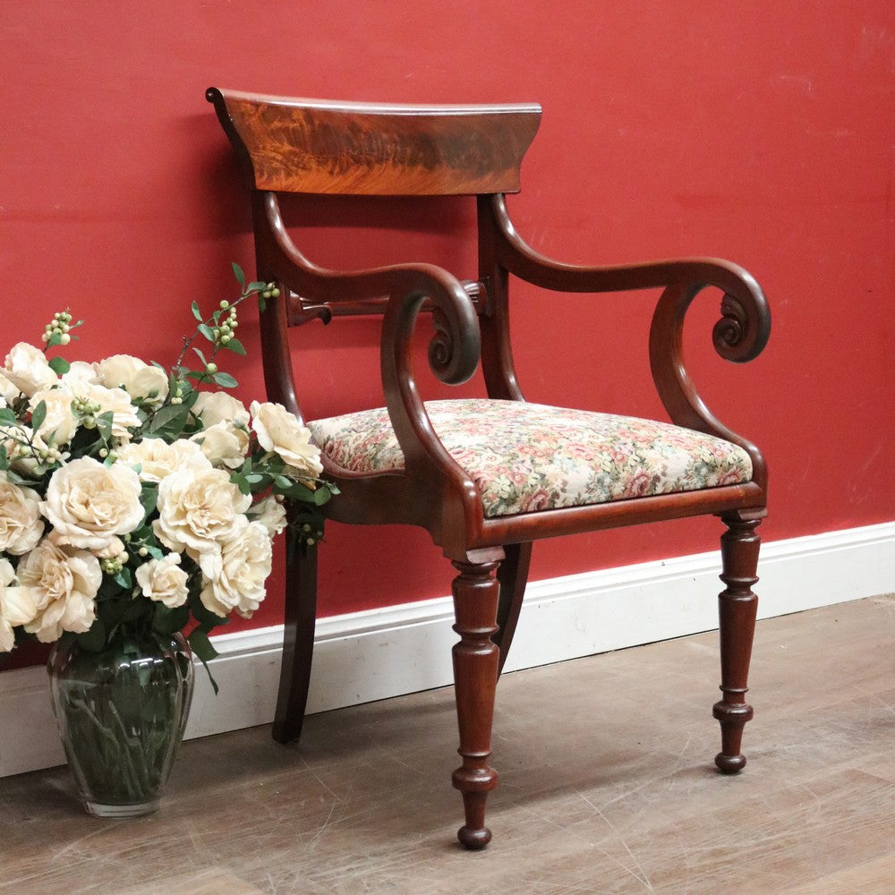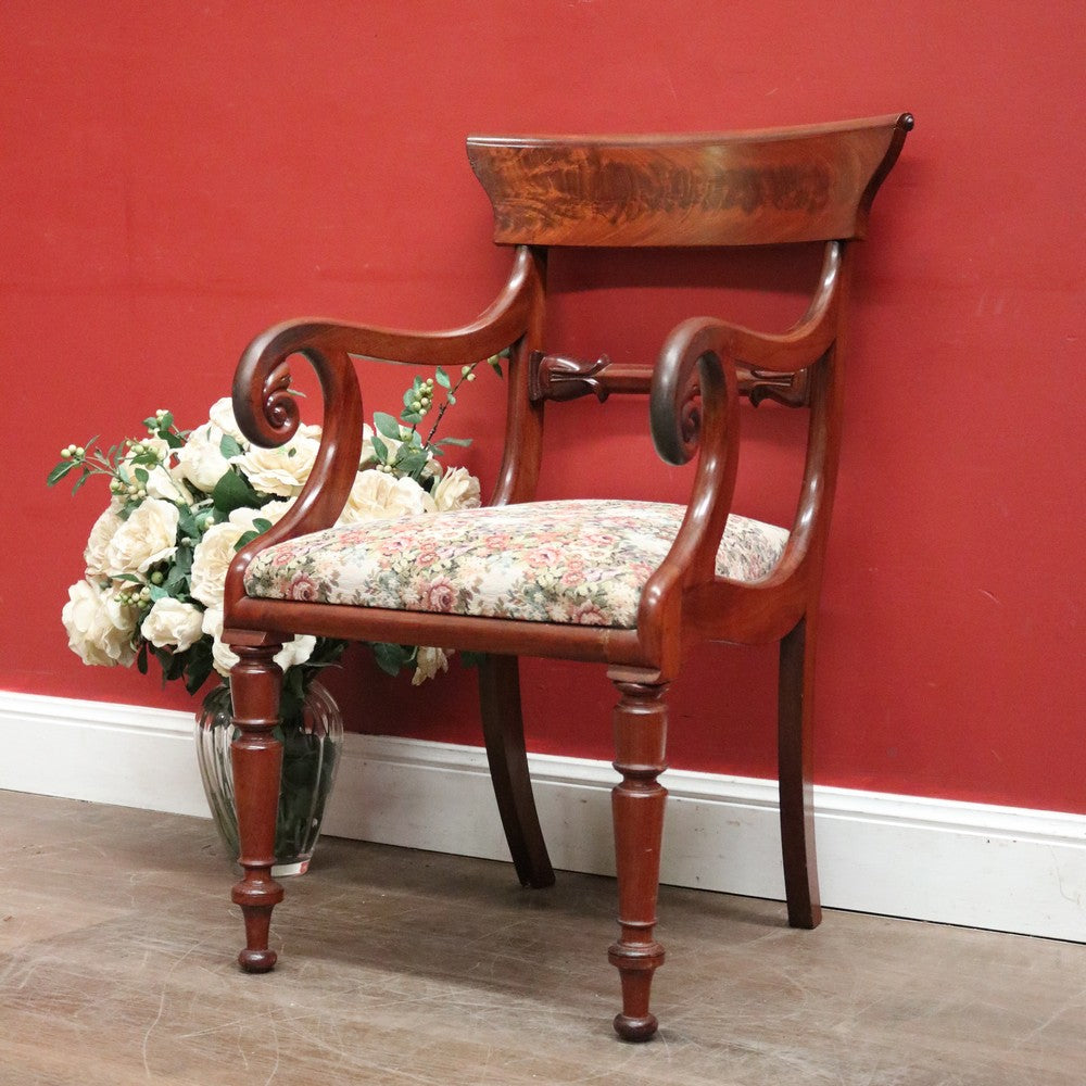 Description: An elegant antique English mahogany armchair with scroll arms and finely turned legs. Features a padded, removable seat, ideal for reupholstering to match your décor, though the current fabric remains in excellent condition.