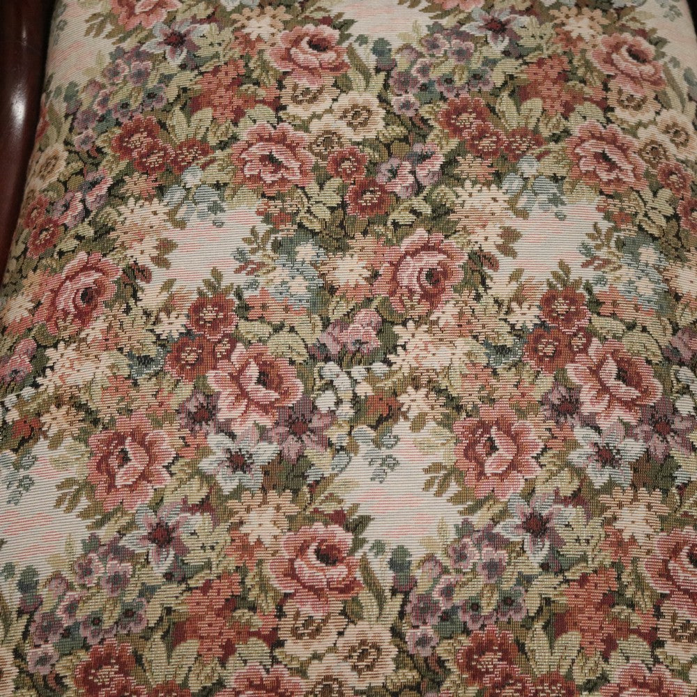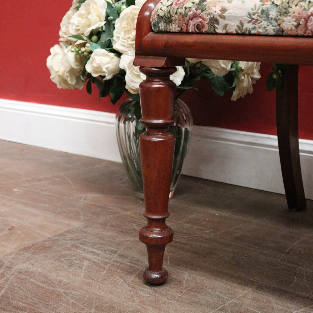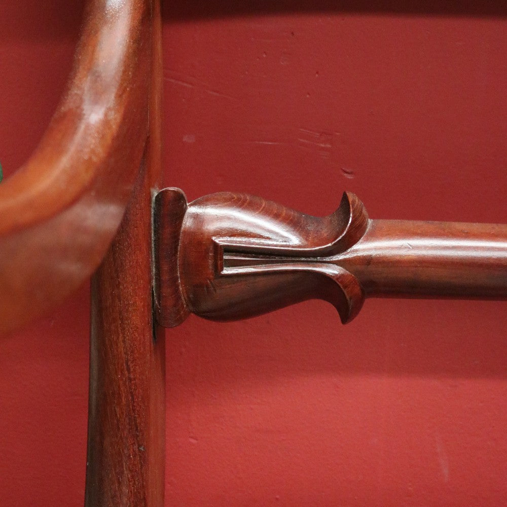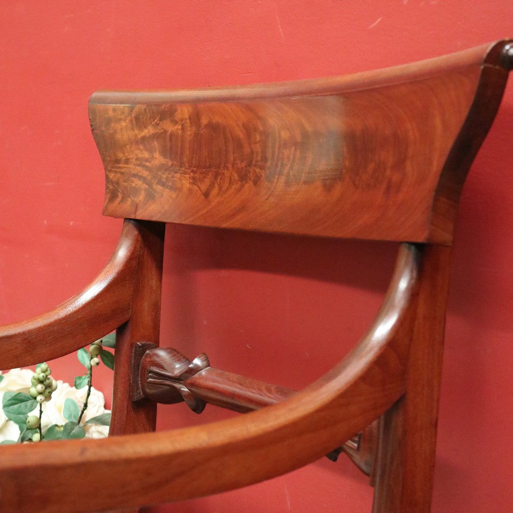 Description: An elegant antique English mahogany armchair with scroll arms and finely turned legs. Features a padded, removable seat, ideal for reupholstering to match your décor, though the current fabric remains in excellent condition.