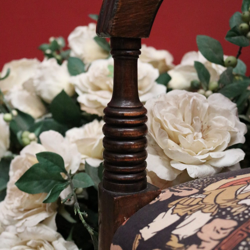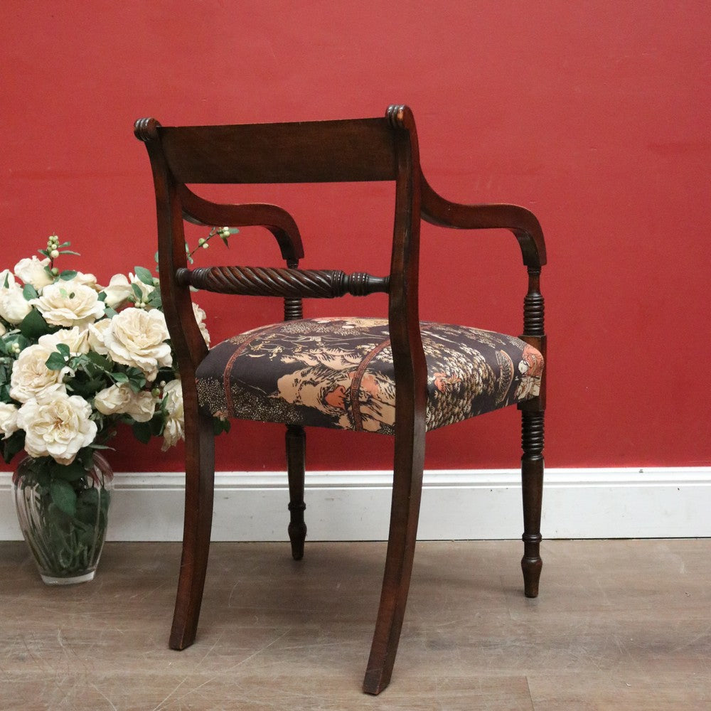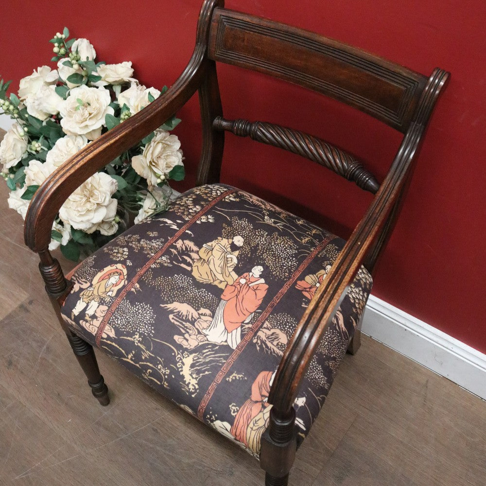 Description: A simple, elegant, and comfortable antique English mahogany armchair, perfect for any room. The lift-out seat is upholstered in a stunning Japanese-themed fabric that beautifully complements the rich timber. Features include turned legs, reeded arms and top back rail, and a middle rail with a flat turned spiral pattern. Sturdy and stylish, this chair comes with a loose cushion. While this listing is for one chair, a very similar second chair is also available—see our other listings if you’re looking for a matching pair.