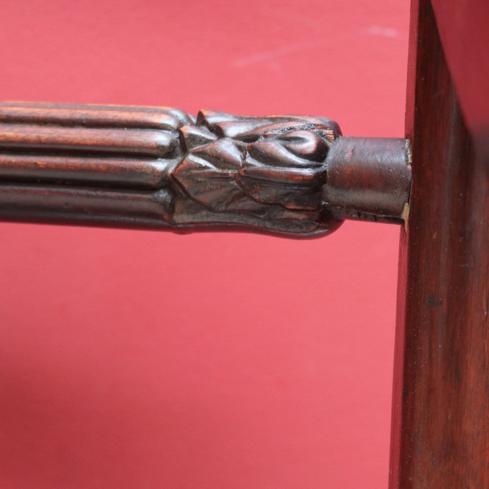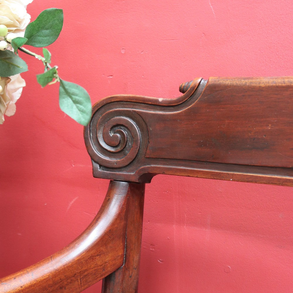 Description: Antique English mahogany armchair featuring elegant scroll arms and carved detail to the mid and top back rails. Upholstered in an earth-toned floral fabric with medallion pattern that complements the rich timber tones. The chair stands on sturdy sabre legs and offers both comfort and classic style. A solid and well-proportioned piece, ideal for a reading corner, bedroom, or study.