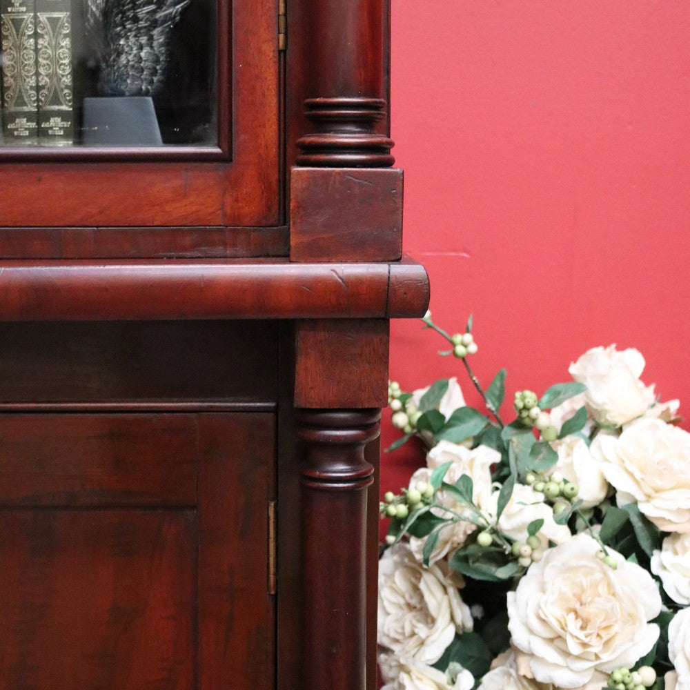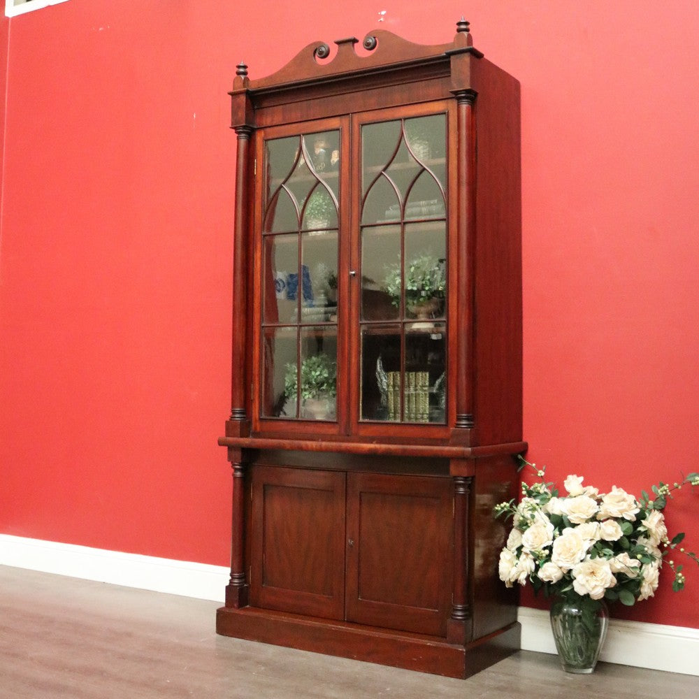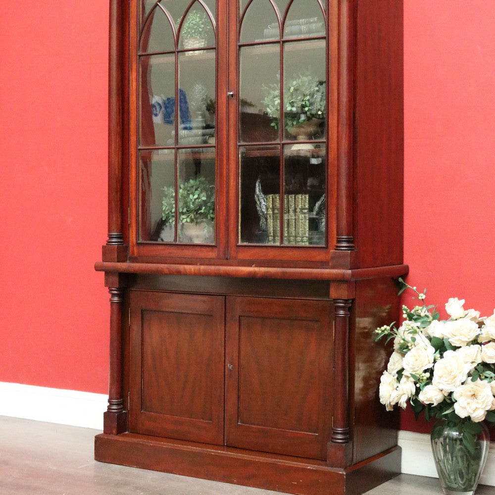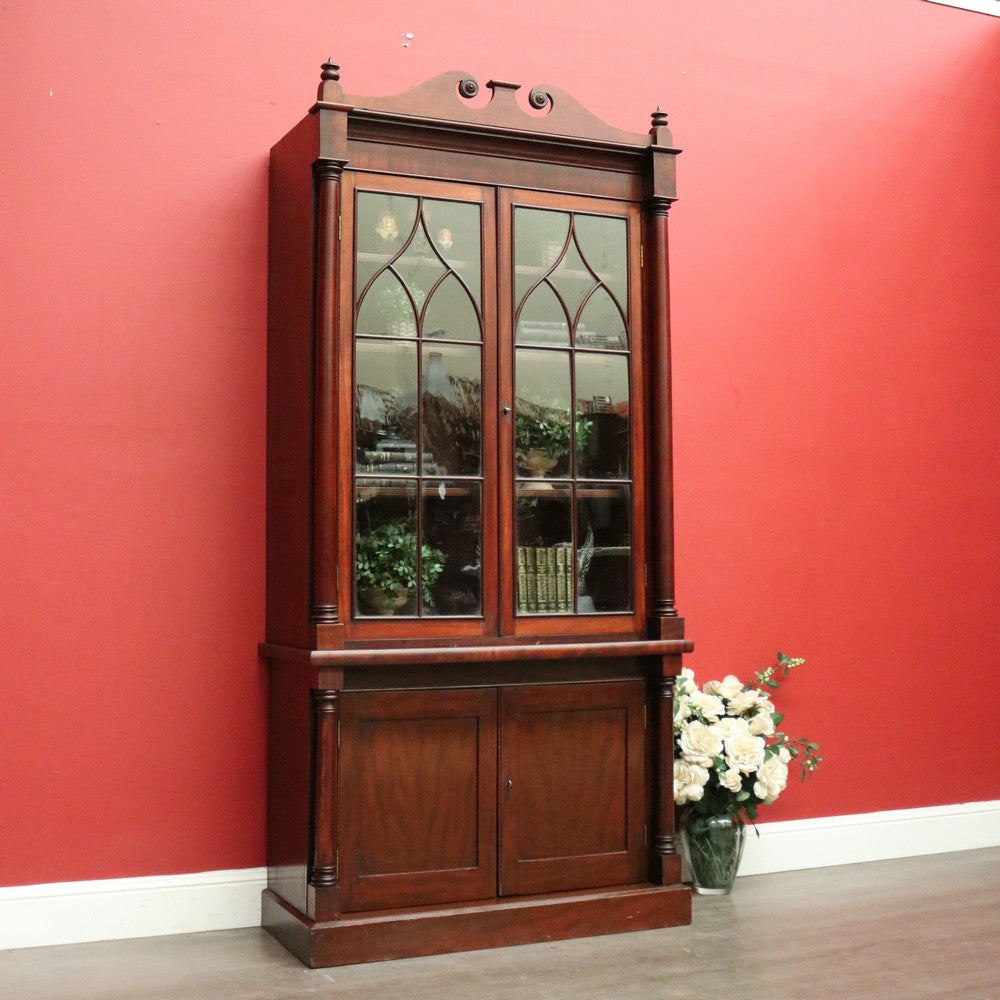 Description Cathedral glass doors and swan neck pediment, 2 keys and turned columns, there are 3 original adjustable shelves.