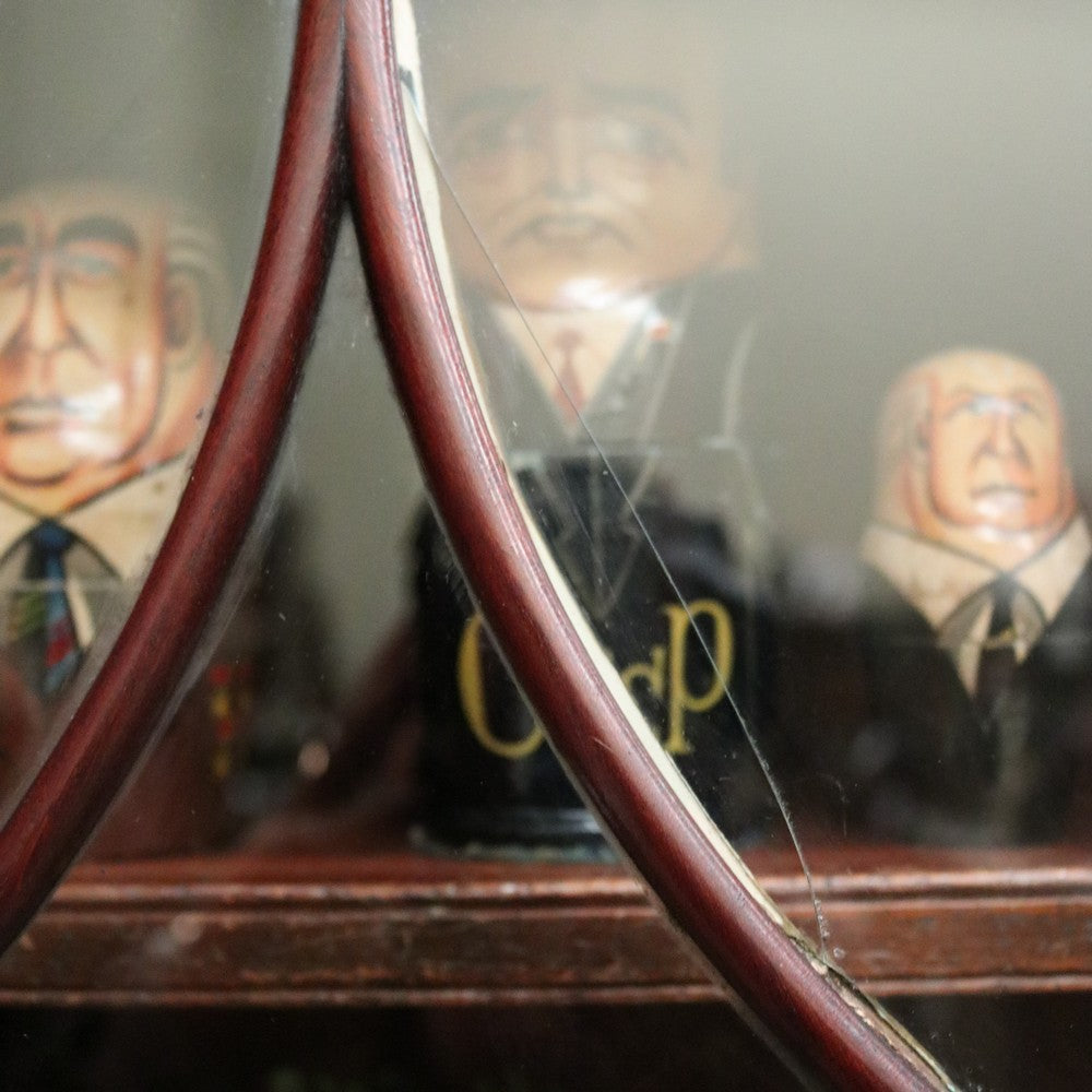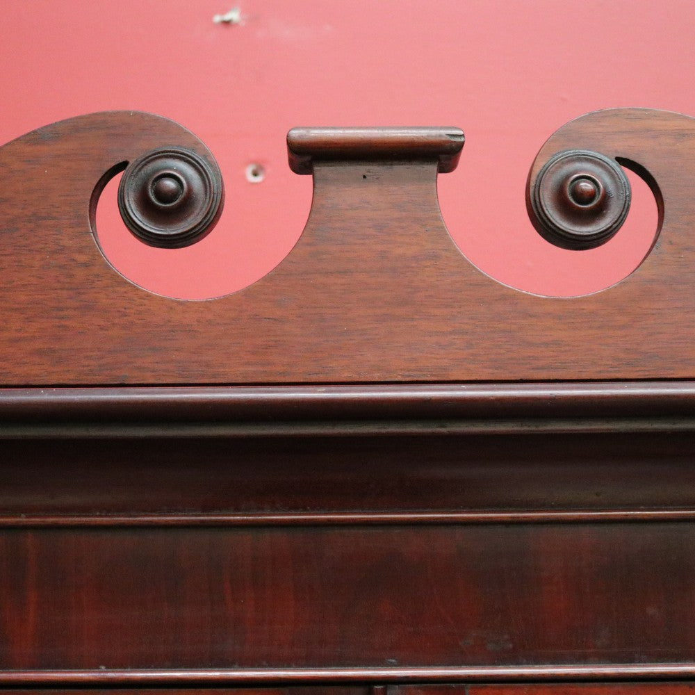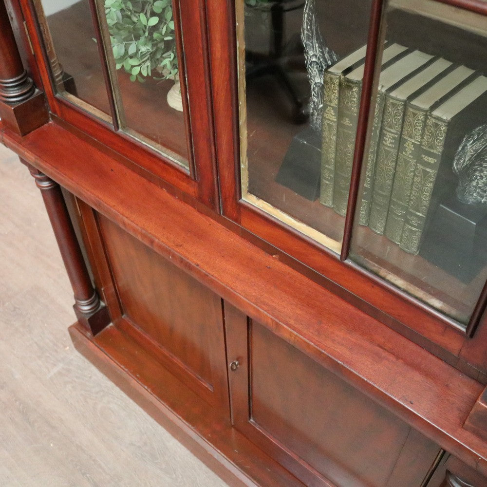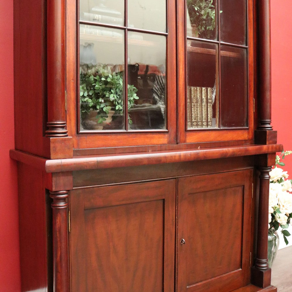 Description Cathedral glass doors and swan neck pediment, 2 keys and turned columns, there are 3 original adjustable shelves.