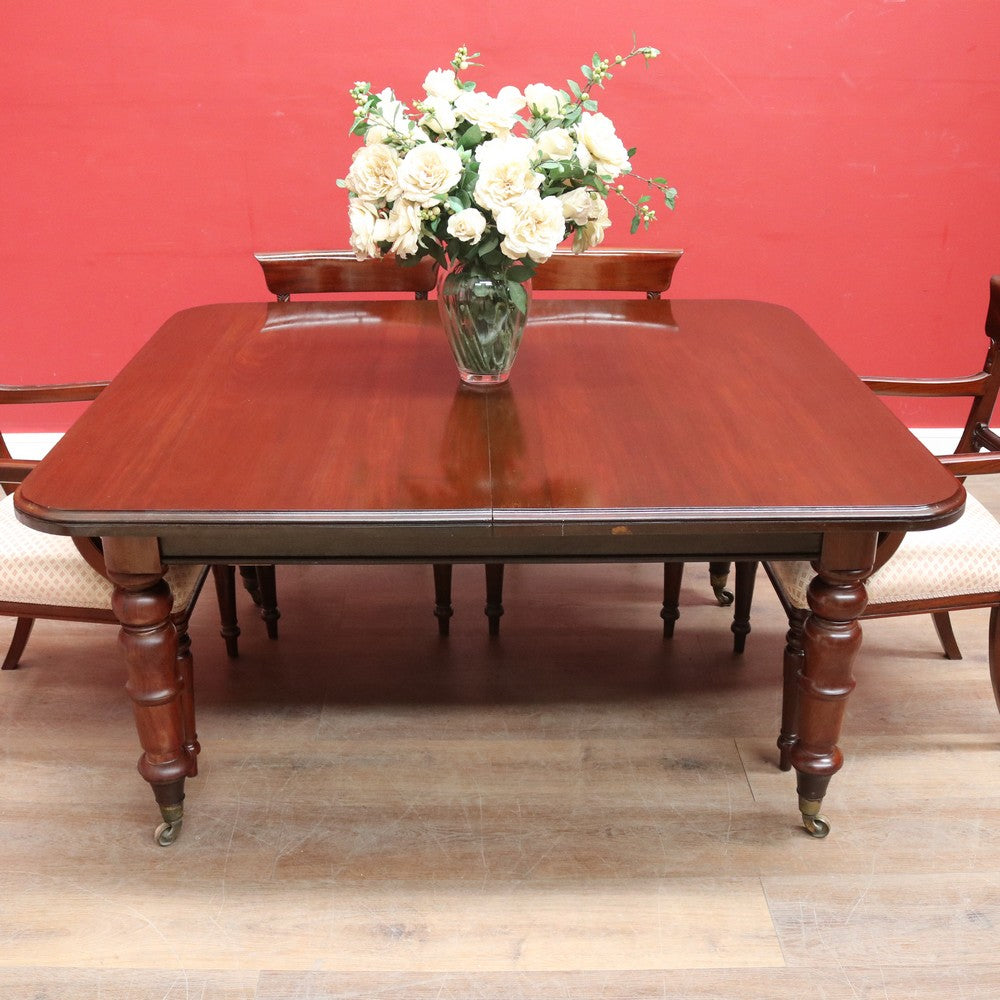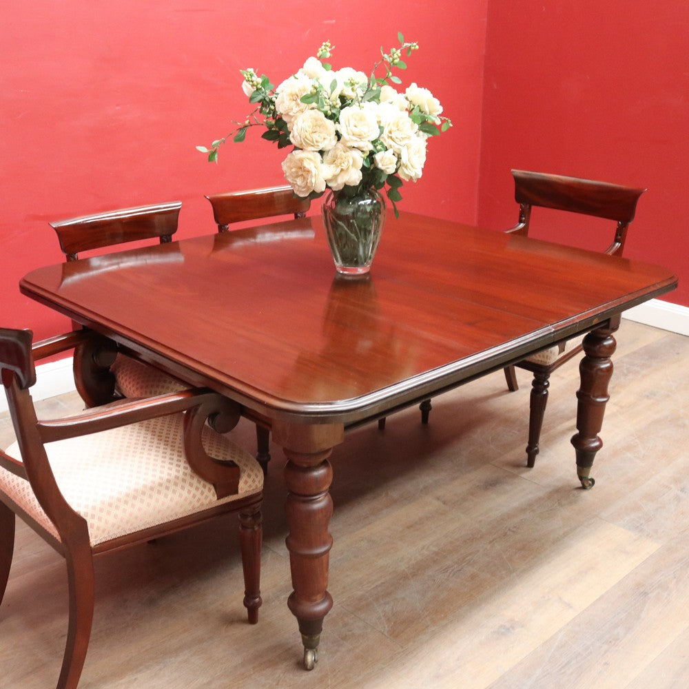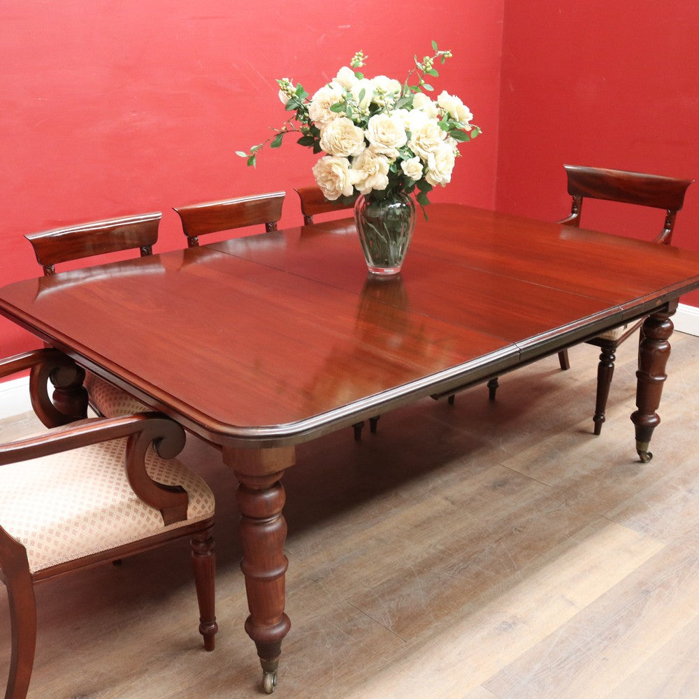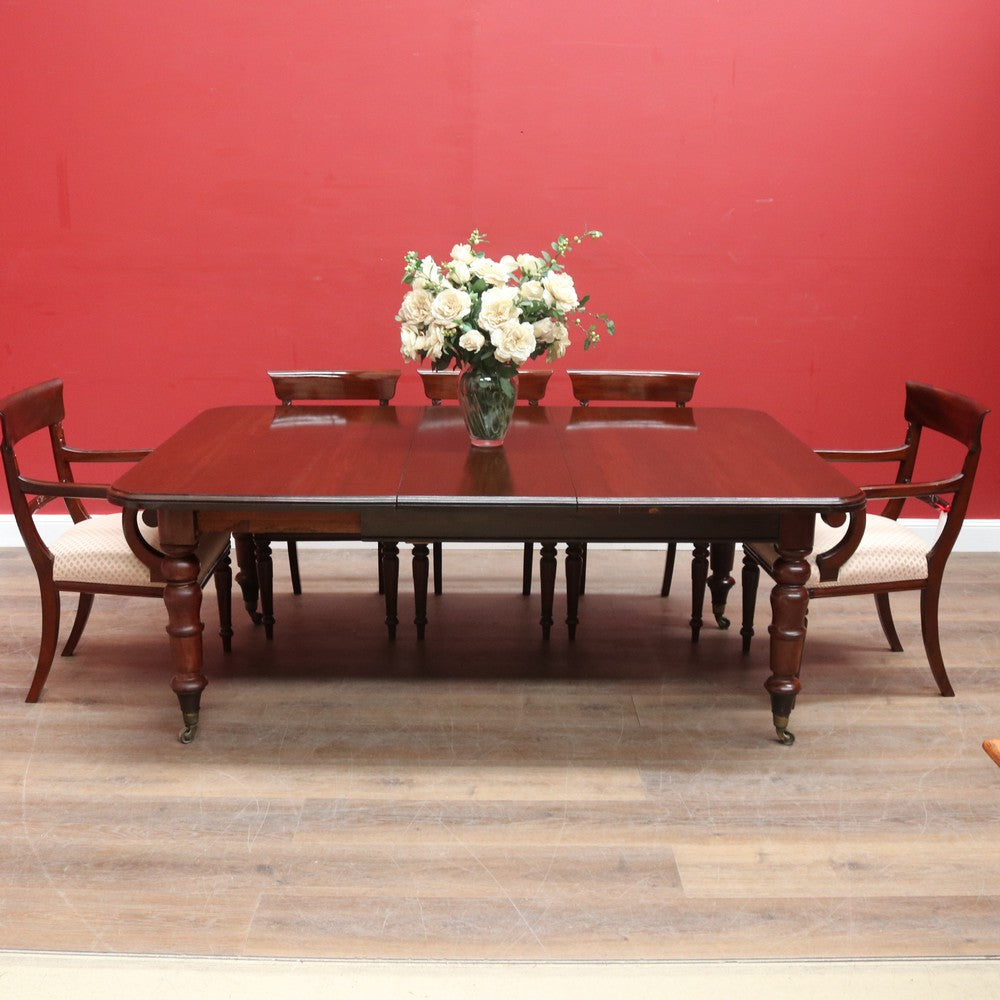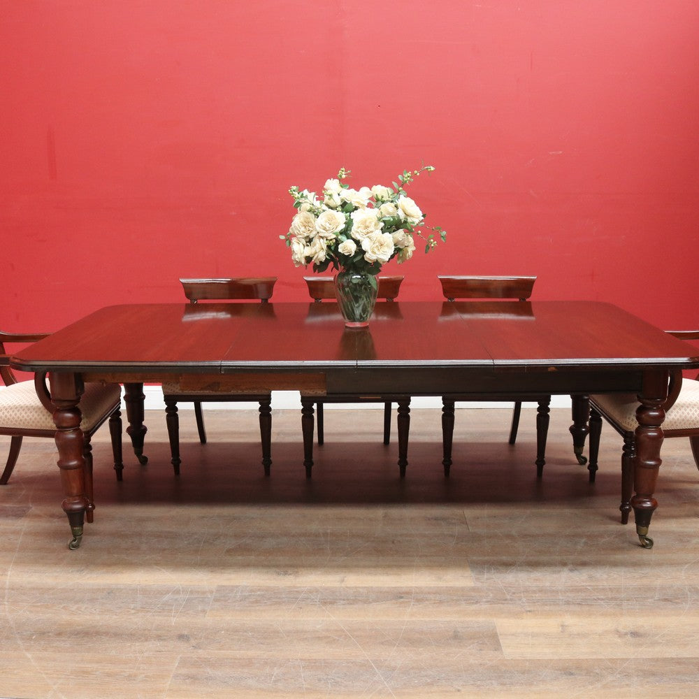 Description: Antique English mahogany dining table with turned legs, brass cups, and castors. The table includes four extension leaves, making it highly adaptable — perfect for family meals, dinner parties, or large gatherings.