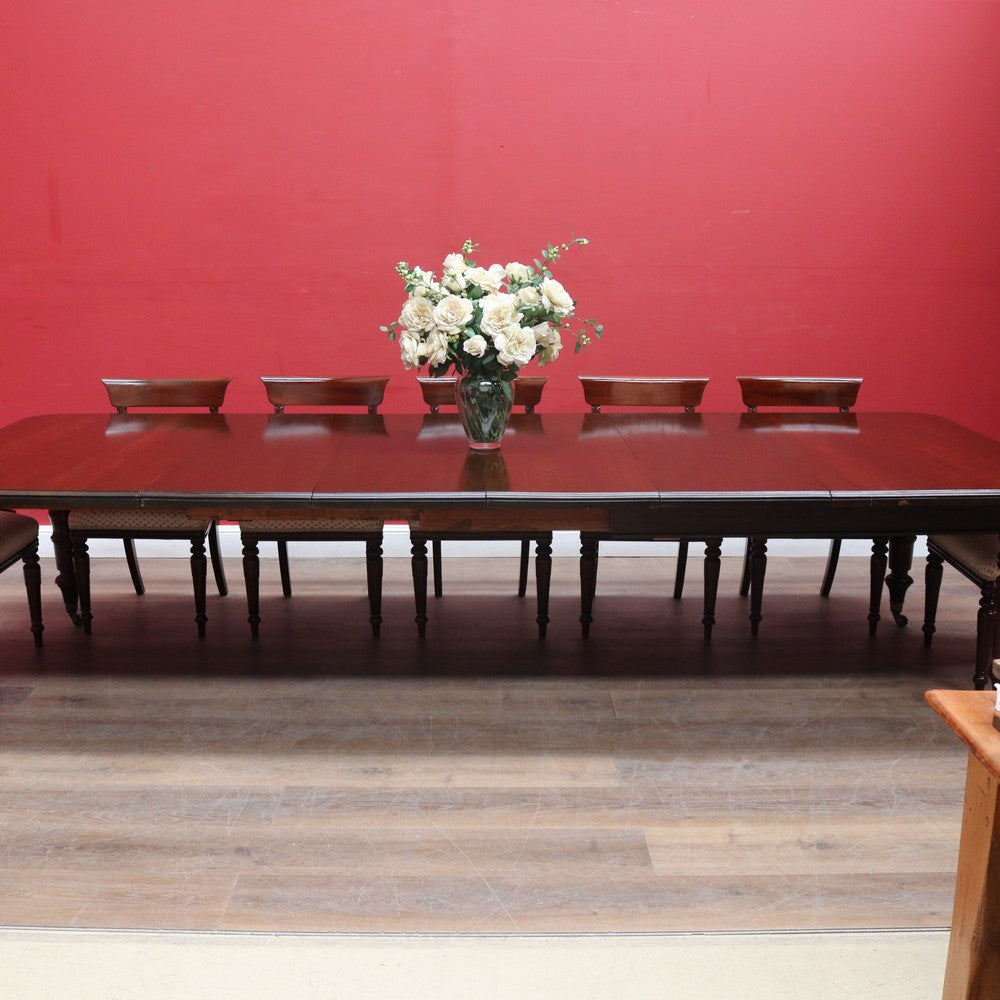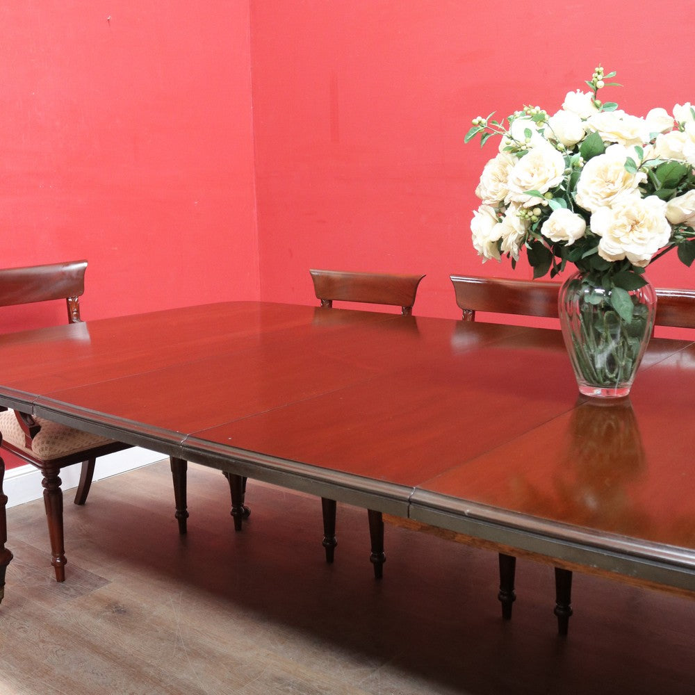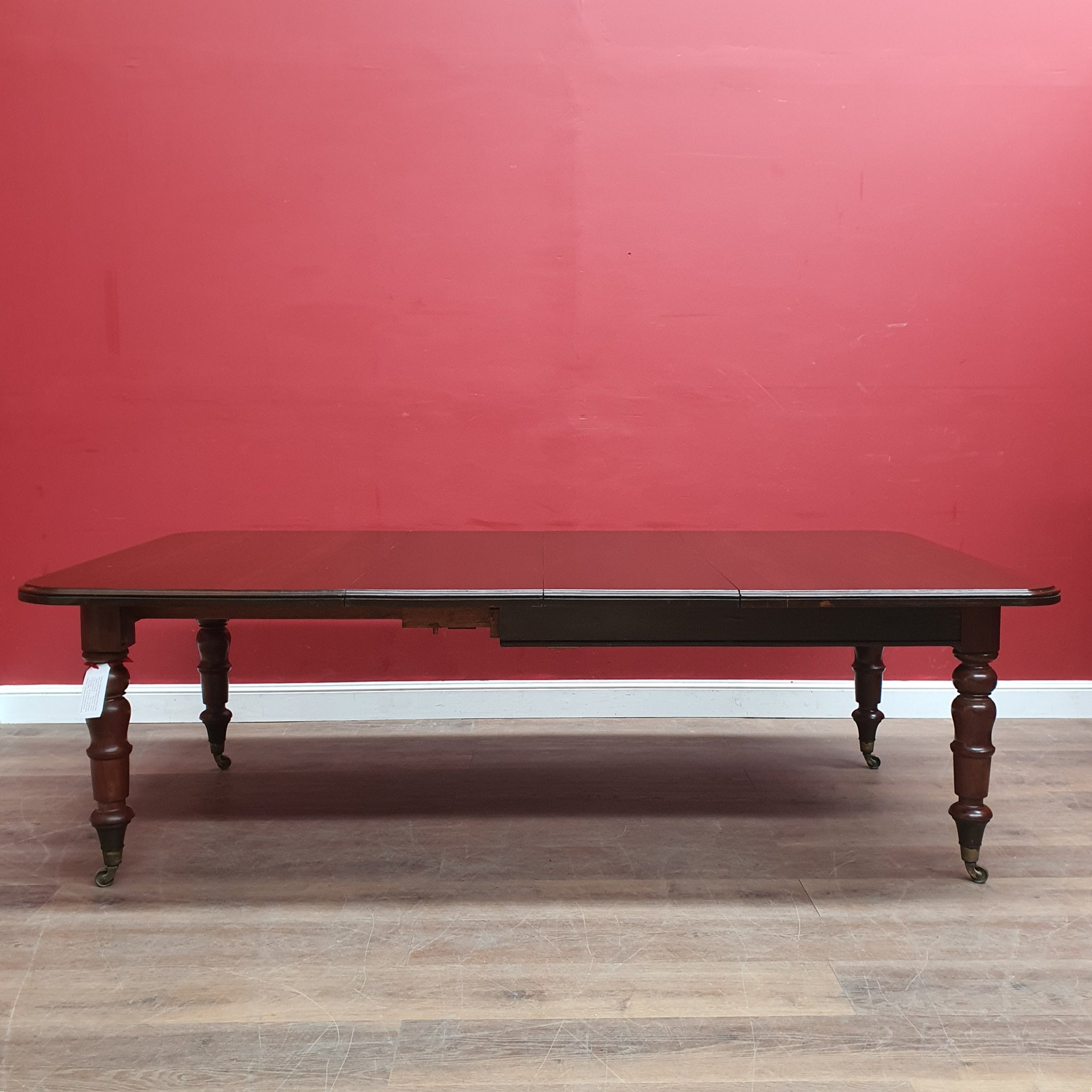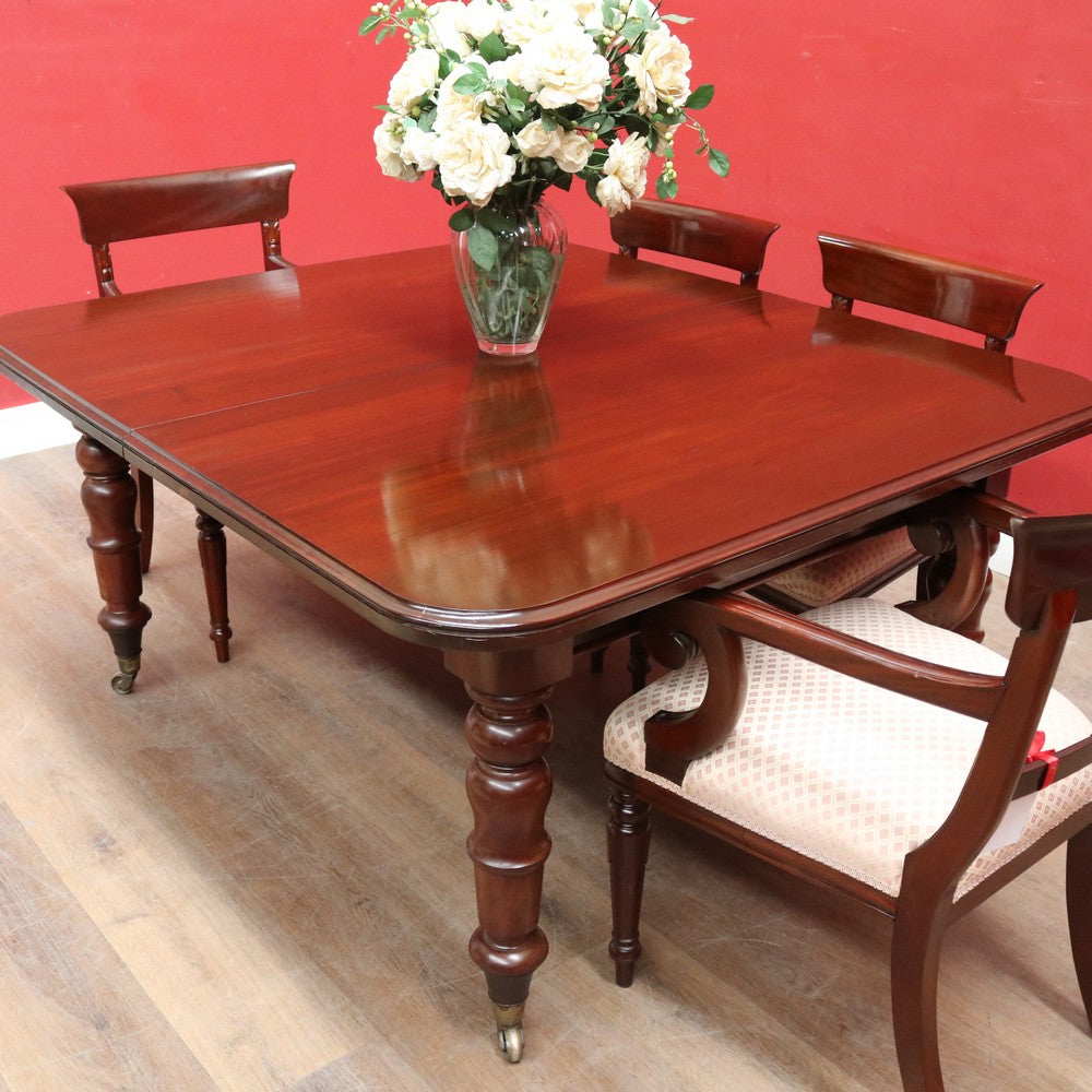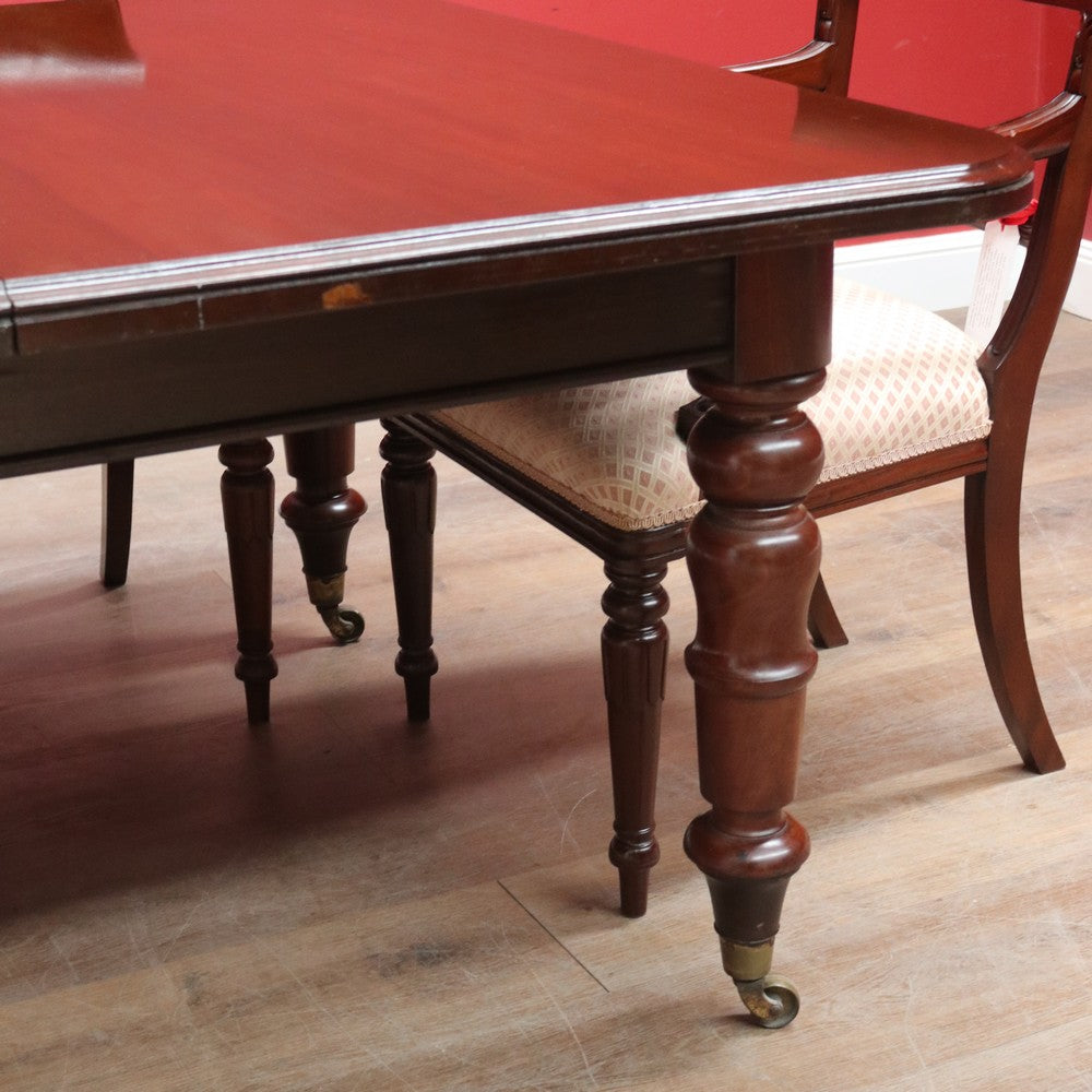 Description: Antique English mahogany dining table with turned legs, brass cups, and castors. The table includes four extension leaves, making it highly adaptable — perfect for family meals, dinner parties, or large gatherings.