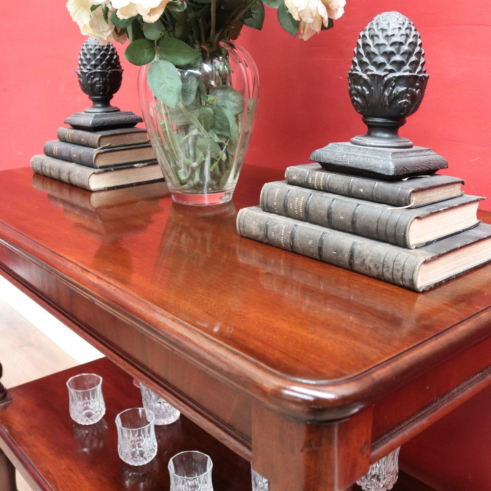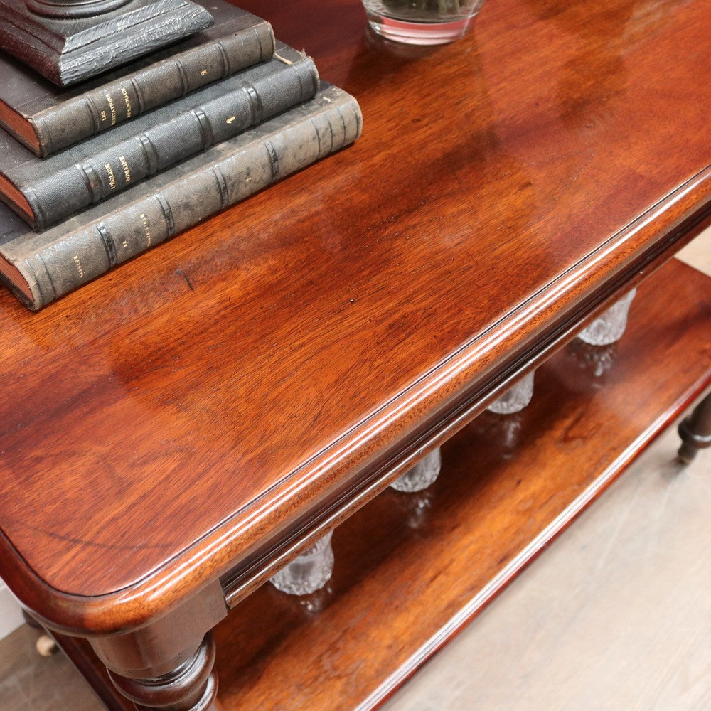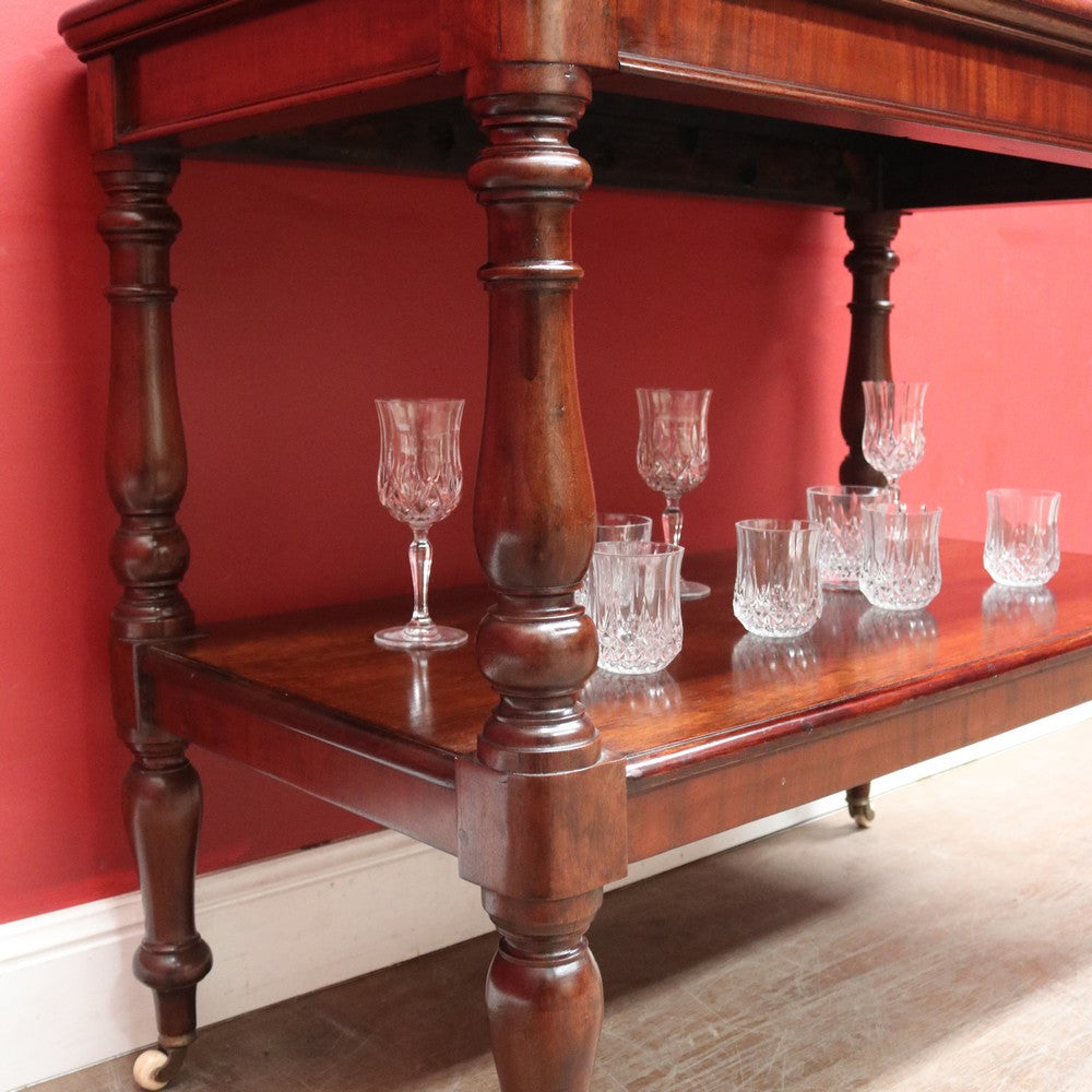 Description: Antique English mahogany servery, also known as a dumb waiter. Features thick turned legs with original white porcelain and brass castors. Includes a display tier with a height of 40 cm. A finely made and versatile antique suitable for many settings.