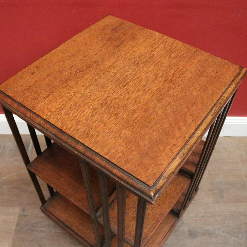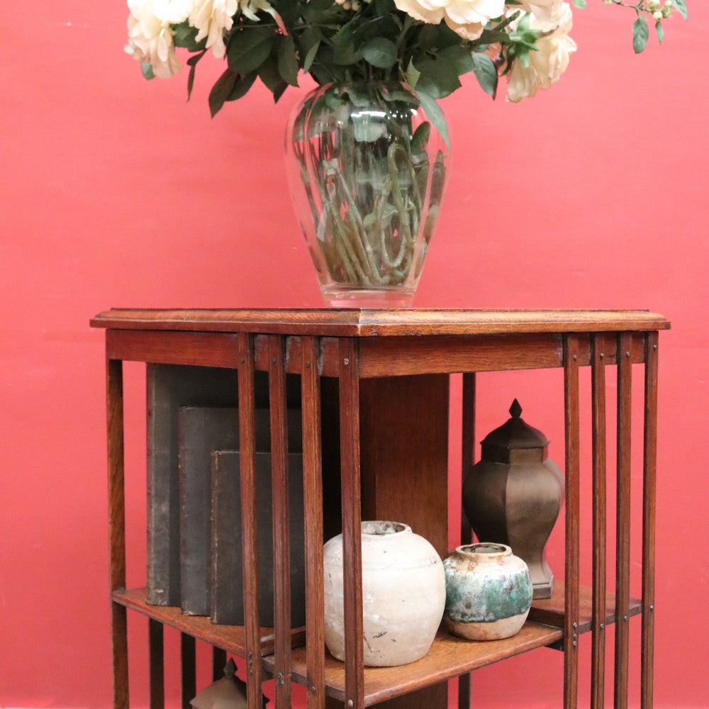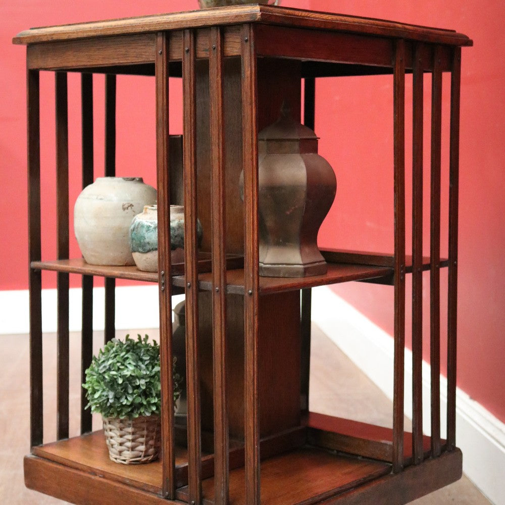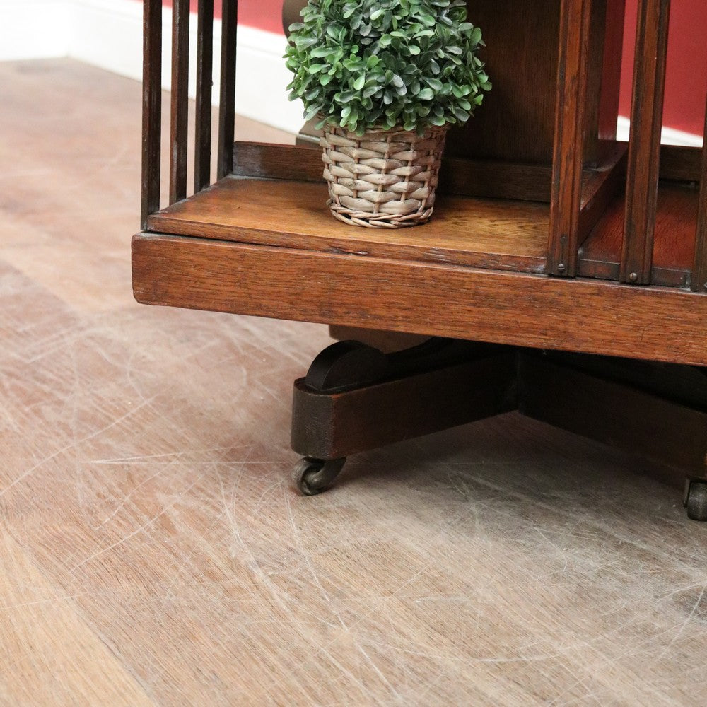 Description: Antique English oak revolving solicitors bookcase with eight sections for books or display. Stands on brass castors and swivels smoothly with ease, making it a rare and desirable piece that combines functionality with elegant craftsmanship.