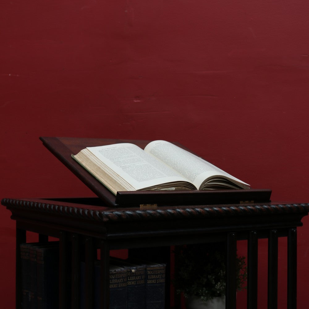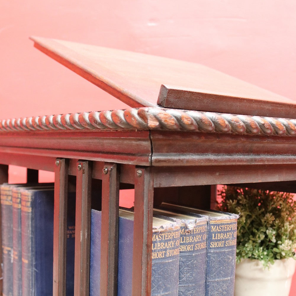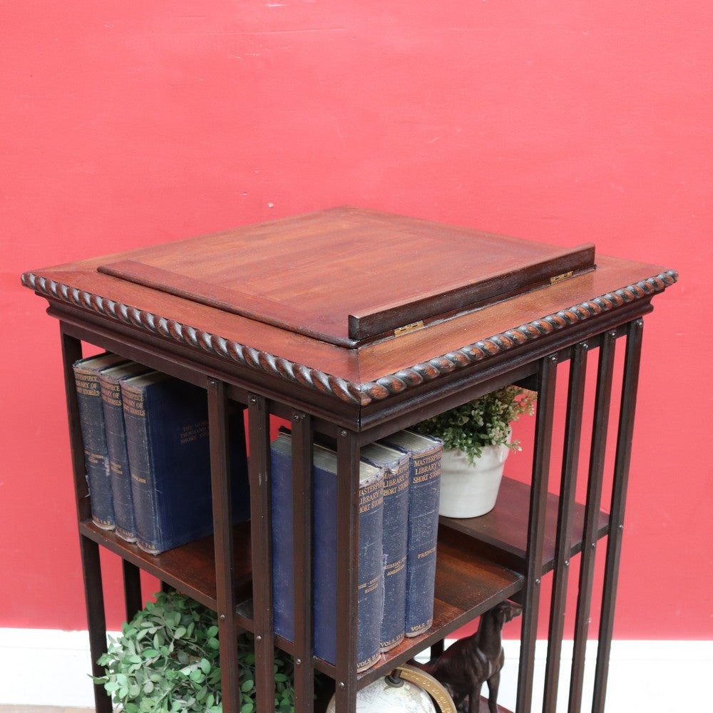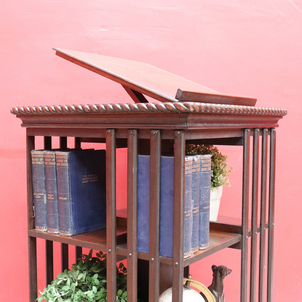 Description: Antique English revolving bookcase with cast iron base and eight individual book‐storage compartments. What makes this example particularly interesting and rare is the bookrest on the top tier, designed to hold a favourite open volume, sheet music, or display book. A design feature seen in early 20th-century library furniture, it elevates this piece beyond the standard revolving bookcase.