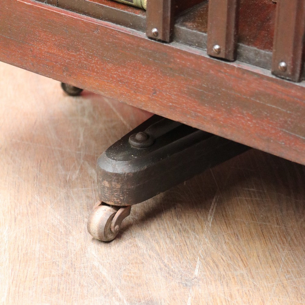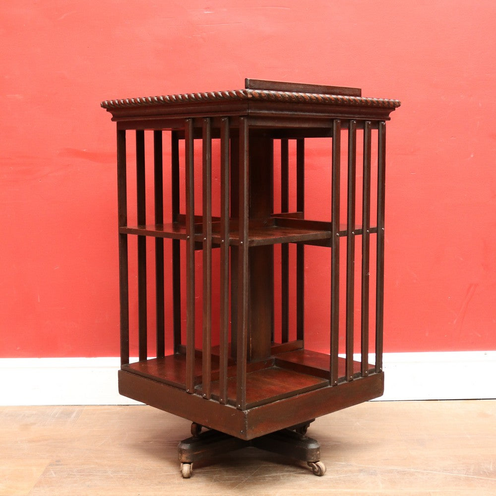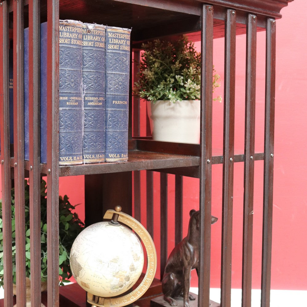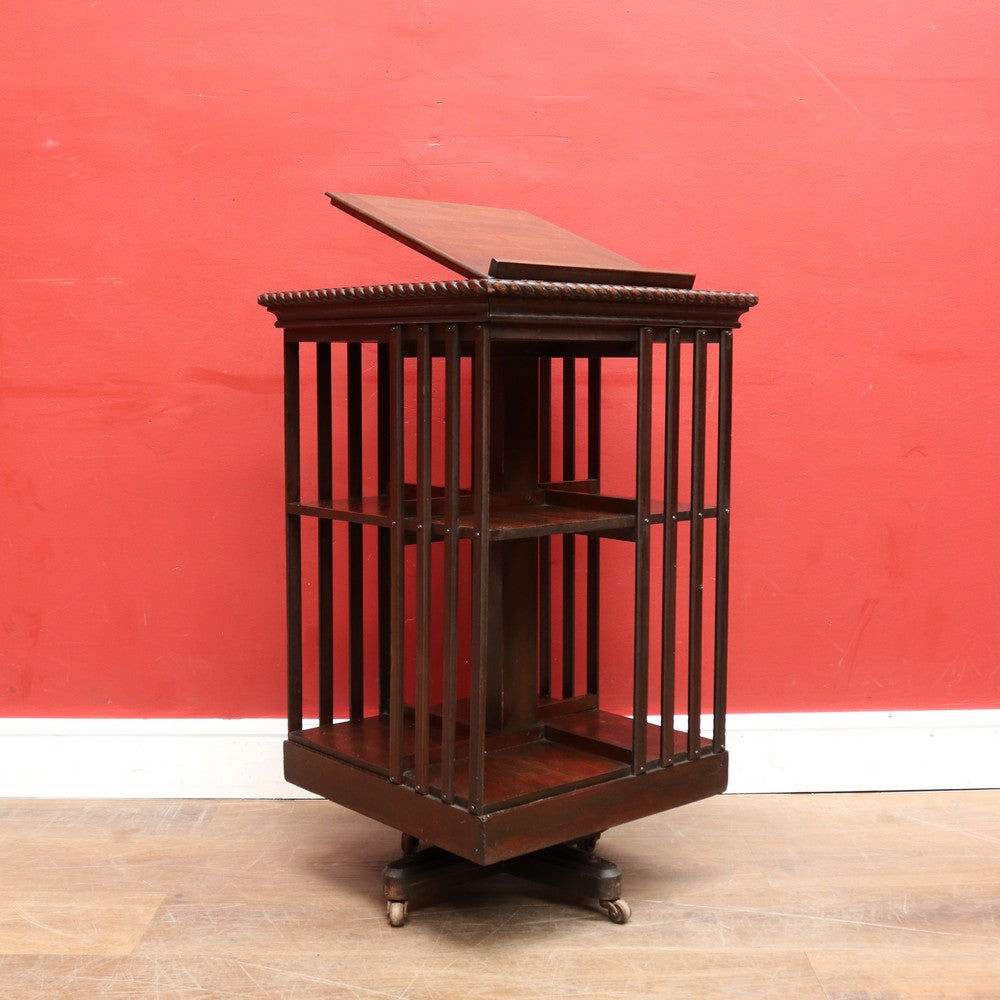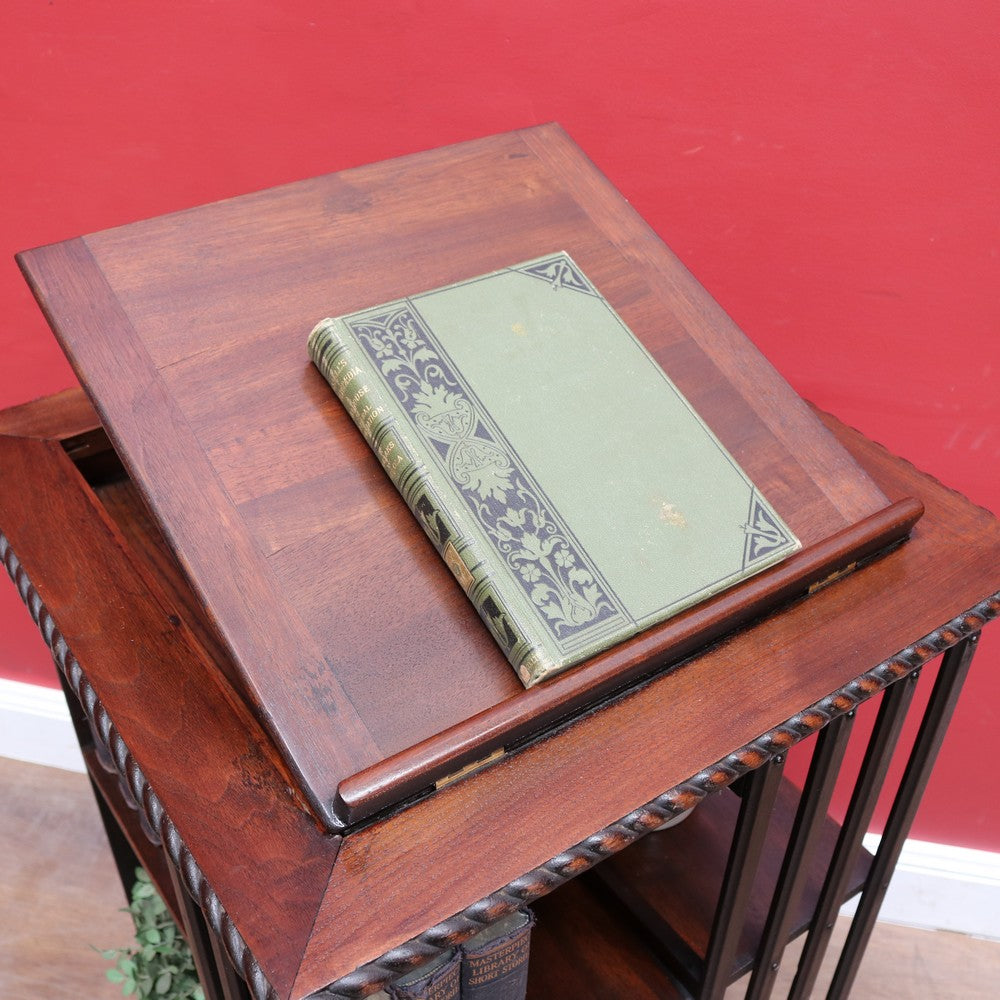 Description: Antique English revolving bookcase with cast iron base and eight individual book‐storage compartments. What makes this example particularly interesting and rare is the bookrest on the top tier, designed to hold a favourite open volume, sheet music, or display book. A design feature seen in early 20th-century library furniture, it elevates this piece beyond the standard revolving bookcase.