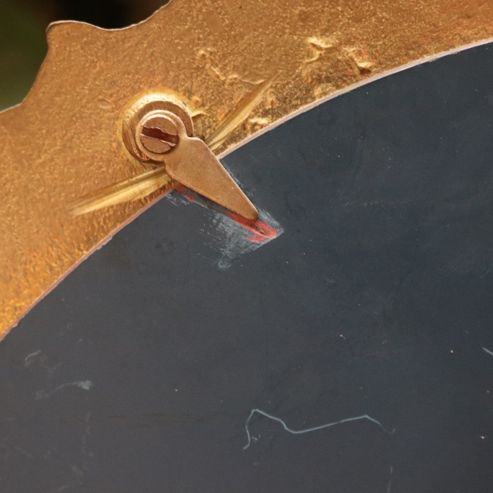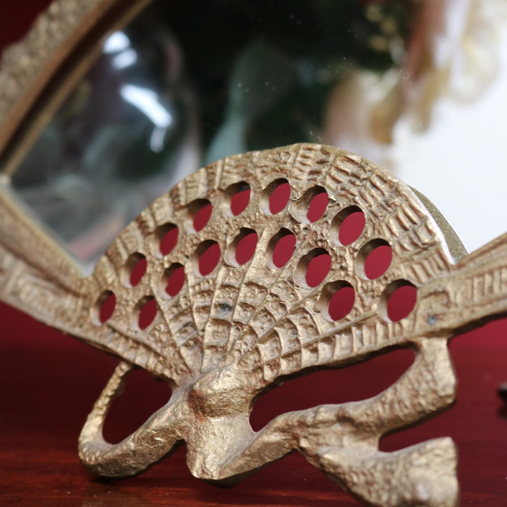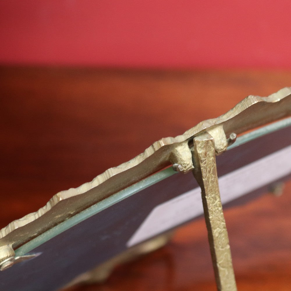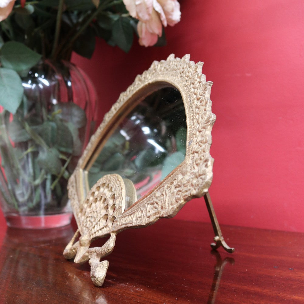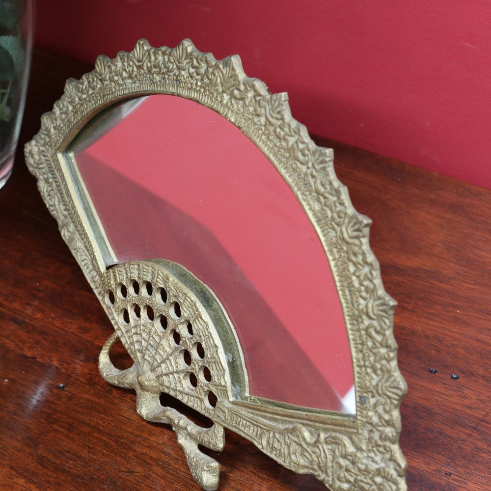 Description: An antique French vanity mirror from the Art Deco era featuring a stunning brass fan-shaped frame. The mirror includes a hinged stand at the back for freestanding use, making it versatile for placement on a sideboard, dressing table or hall table. The mirror has been replaced over the years and is in exceptional condition, offering a beautiful decorative feature for any room in the home. Price does not include postage; please request a postal quote for your area.