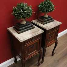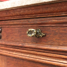 Description A stunning pair with fine carved detail, French scroll feet and routed edge to the fawn coloured marble tops. Brass handles and solid oak timbers