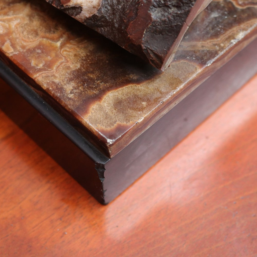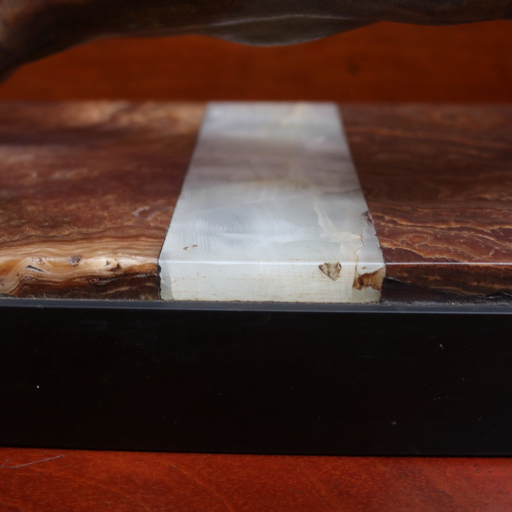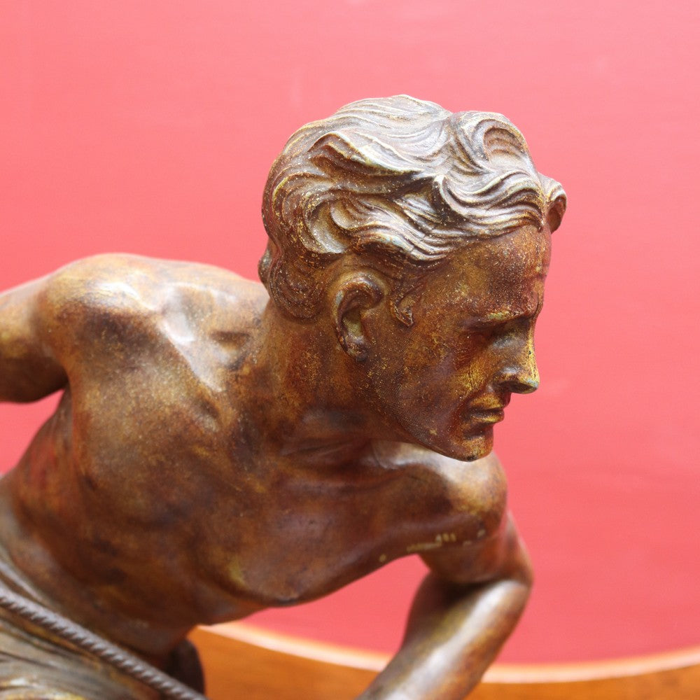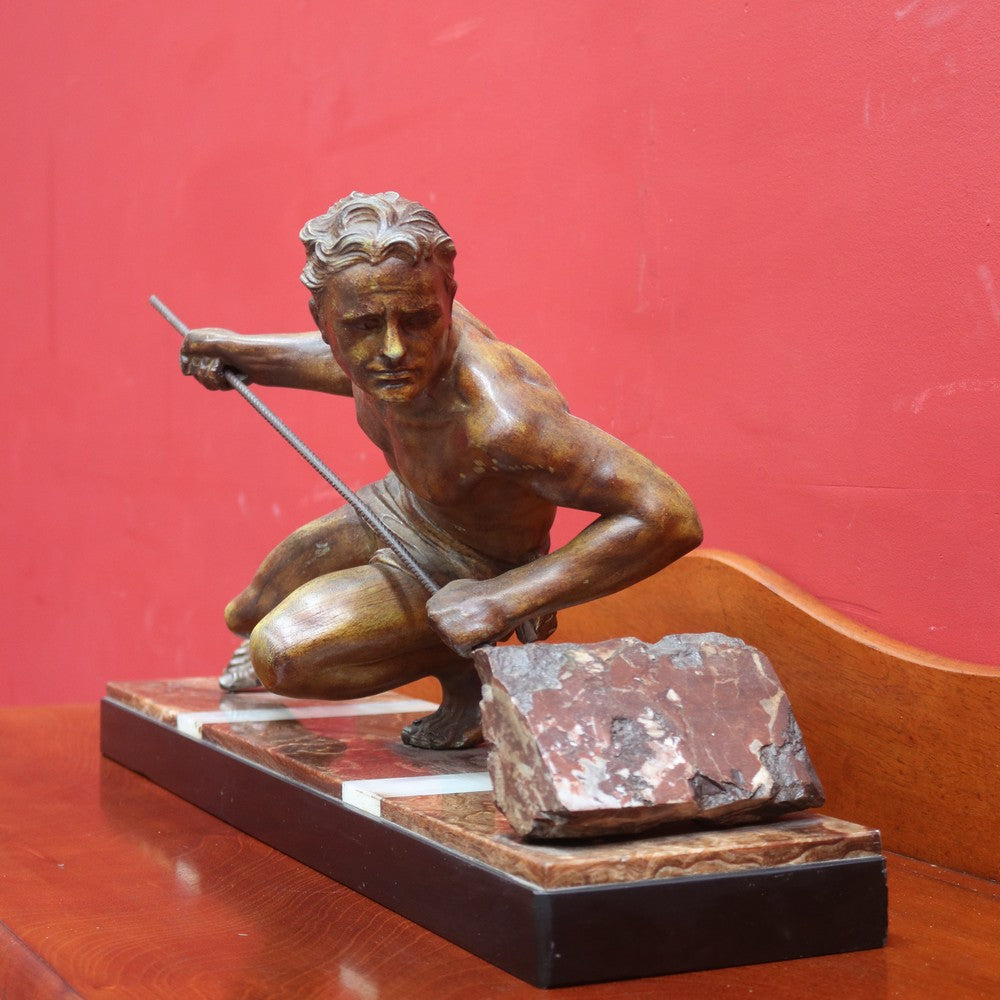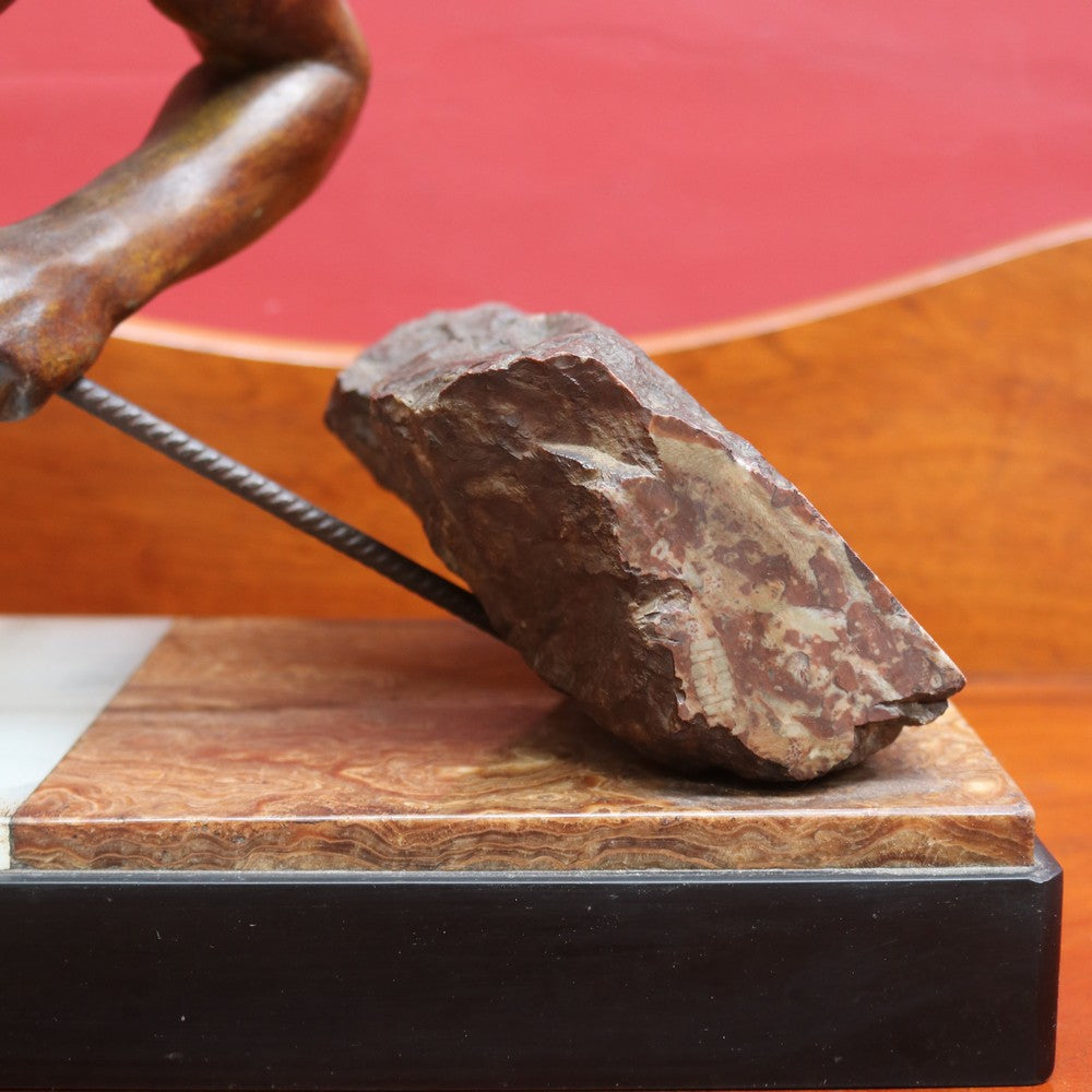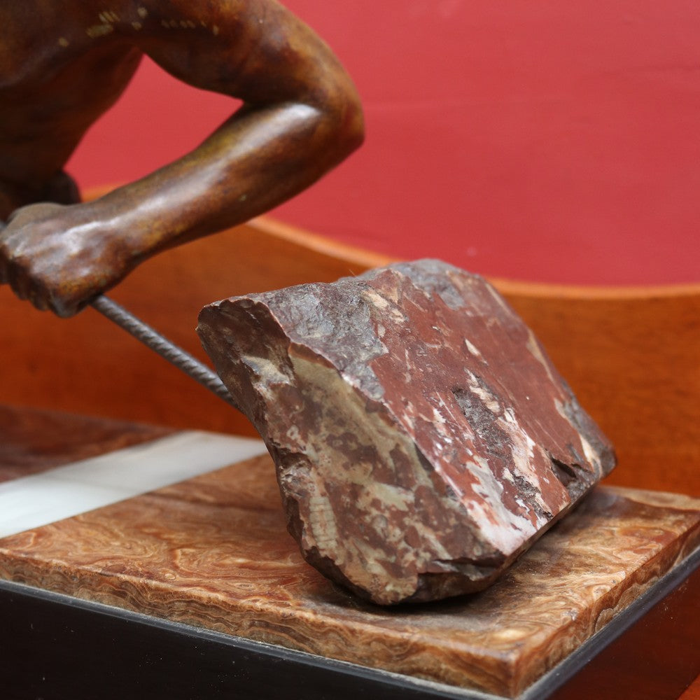 Description: Antique French bronze and marble statue attributed to Guislain, crafted in the Art Deco style during the 1930s. Features a matte-finished bronze figure of a man pushing a stone block, set on a polished black marble base. A finely detailed and elegant sculpture that captures the strength and refined style of the Art Deco era.