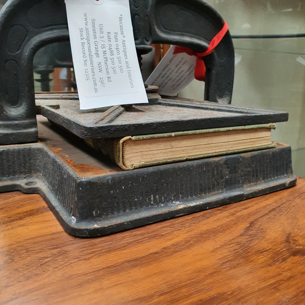 Description: An antique French cast iron book press with original handle, raising and lowering smoothly. Once used for bookbinding, it also serves beautifully as a decorative piece. Strong and functional, it can be used for pressing paper, flowers, or small craft projects.