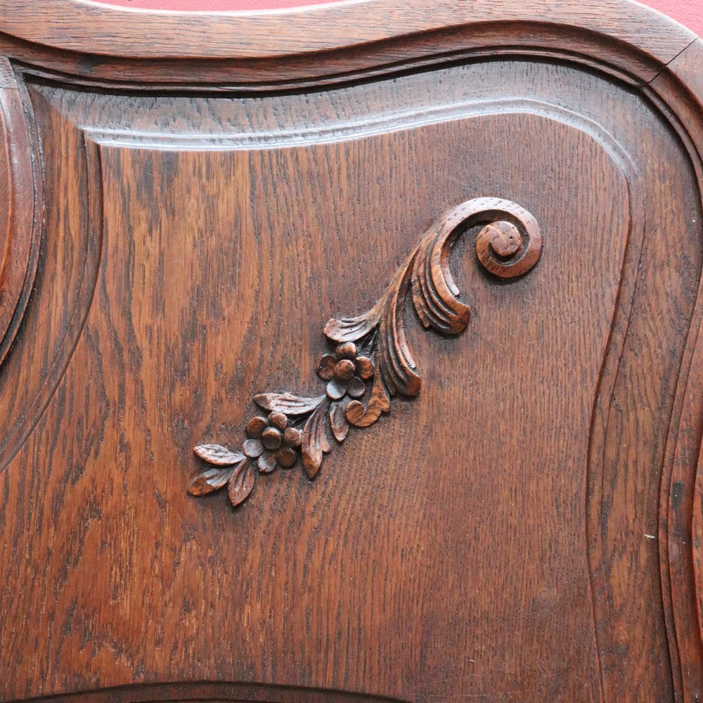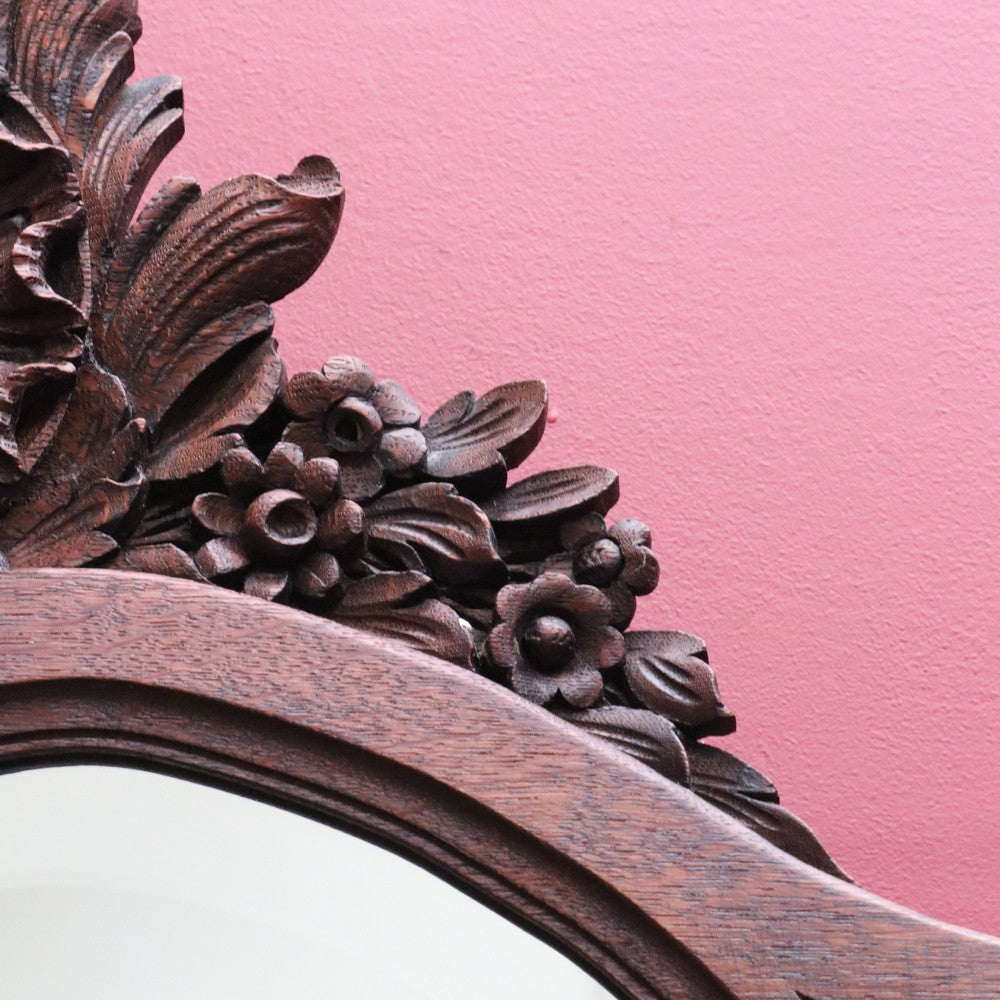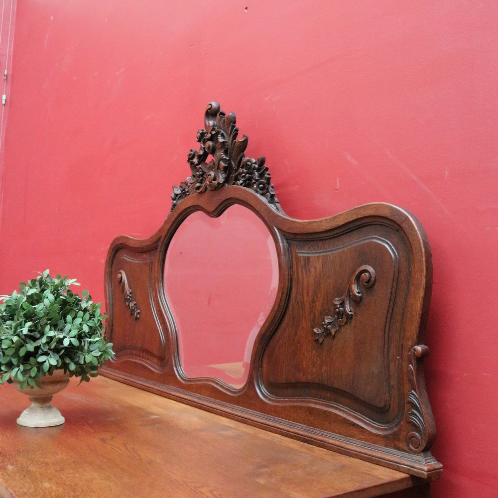 Description: This antique French hall mirror features a shaped central mirror with a bevelled edge, framed by attractive carved timber detail. A floral crown sits atop, adding a graceful decorative touch without overwhelming the form.