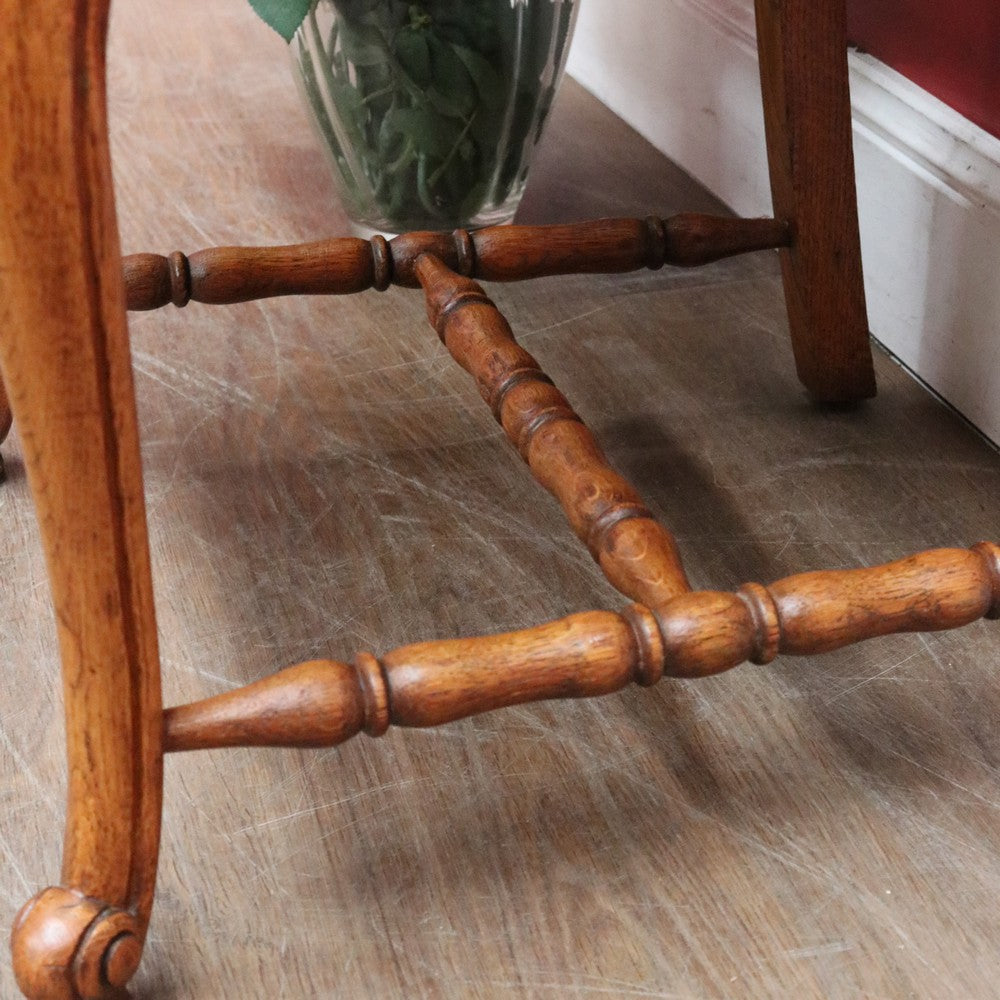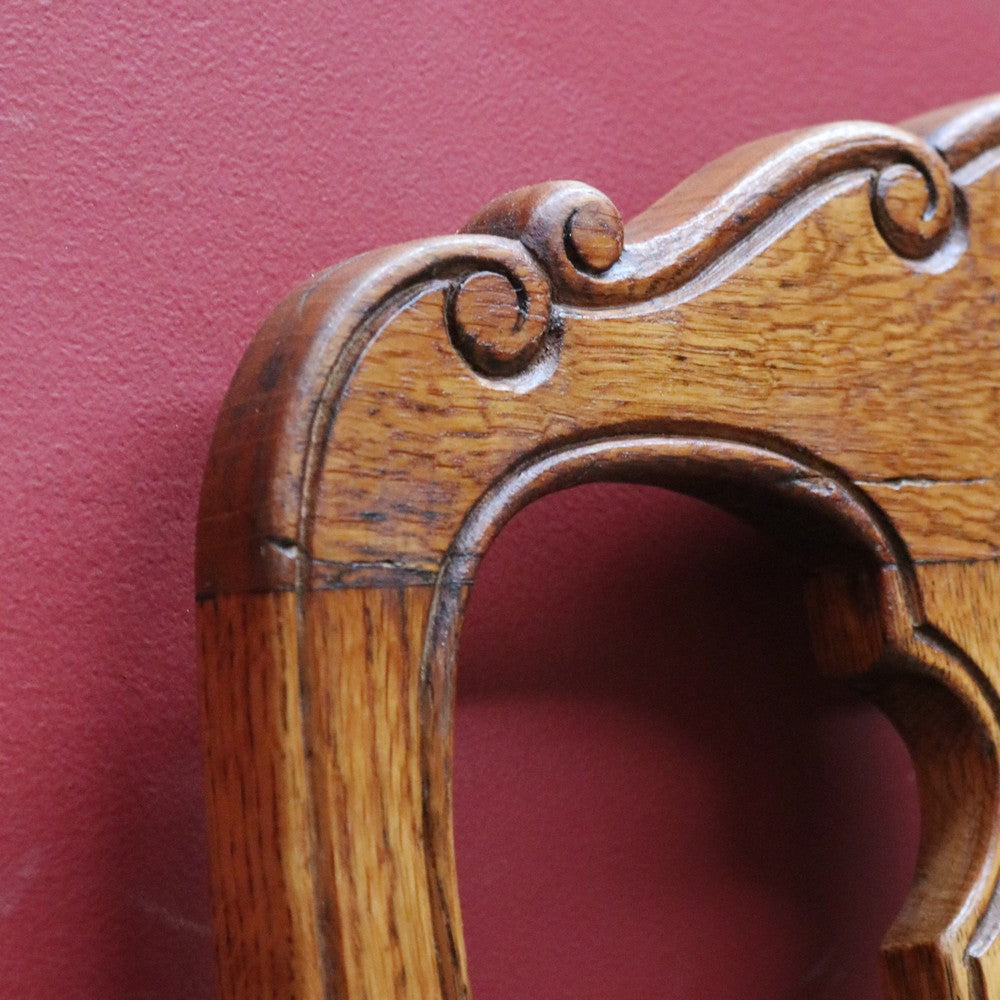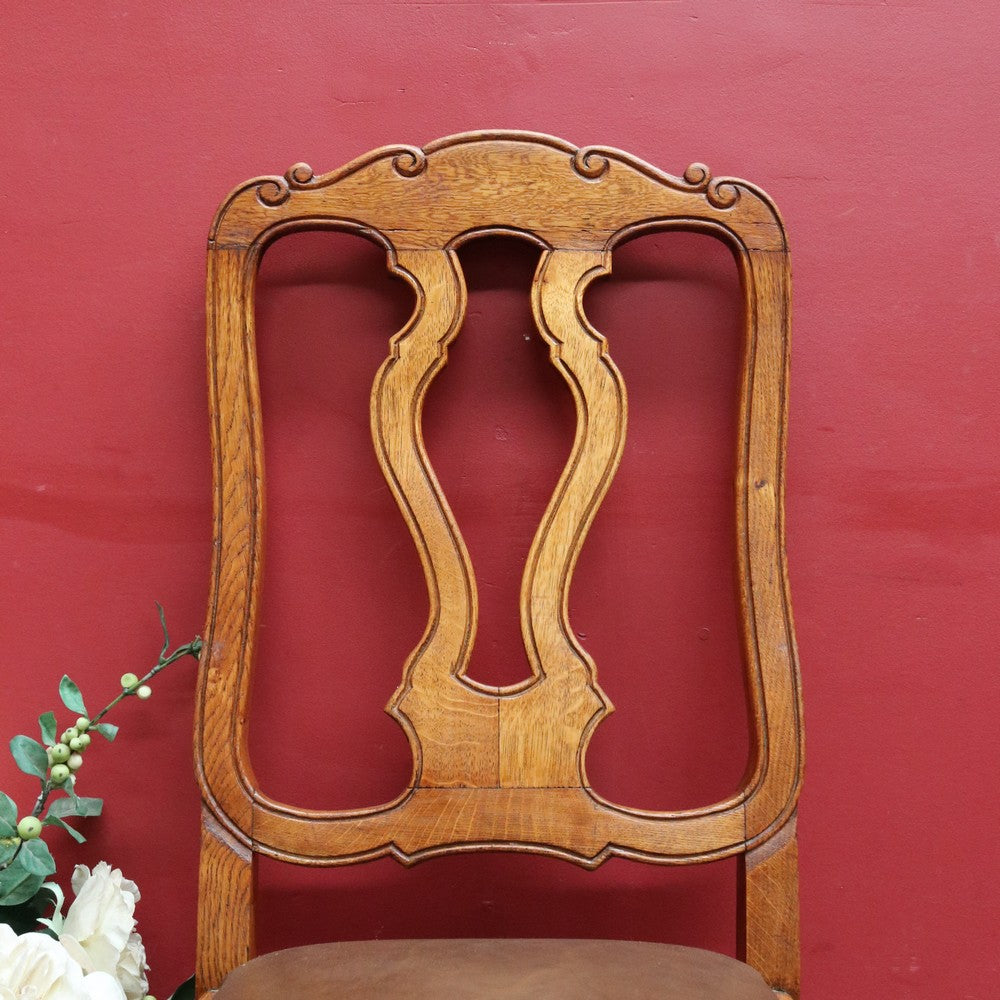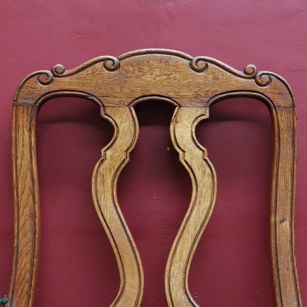 Description: This antique French hall or office chair is a pretty, solid piece with classic detailing. The tall splat back features ornate carving and a scalloped top rail, giving the chair an elegant profile. The turned H-stretcher adds stability and traditional craftsmanship, while the French scroll feet complete the design with refinement.
