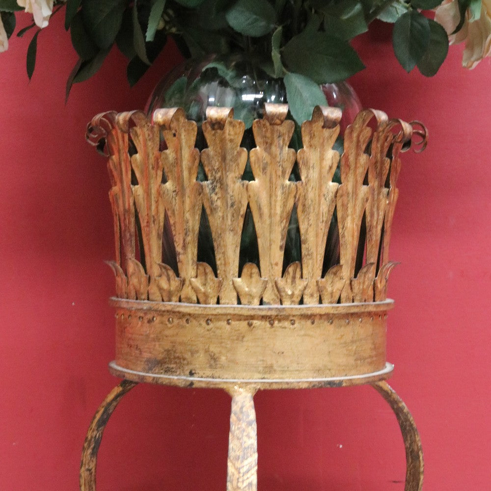 Description: An antique French jardinière holder featuring a hand-hammered gilt metal bowl with a leaf motif rim that curves gently outward at the top. The stand is raised on curved tripod legs with a plait pattern, giving the piece elegance and visual interest.