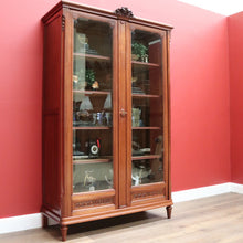 Description Made from French Mahogany this 2 large Bevelled glass door Bookcase stands on turned legs. Carved details to bottom of the door panels and small carvings to top makes this elegant and simple bookcase highly suitable for many homes and styles. Fully fitted with adjustable timber shelves this Bookcase china cabinet is ready to go.