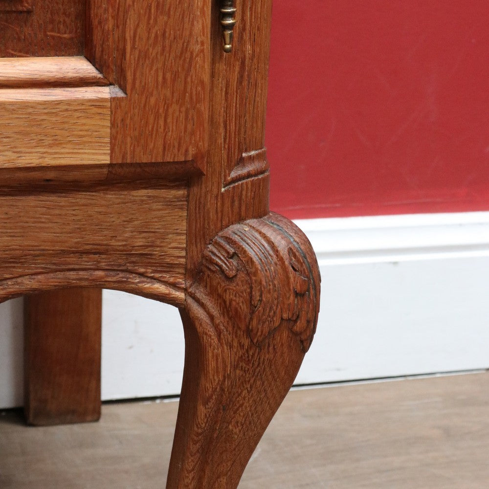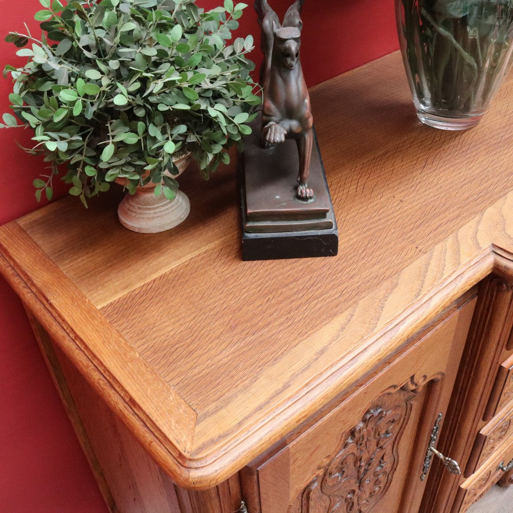 Description: An antique French oak breakfront sideboard designed with a narrow depth, making it perfect for smaller dining rooms, hallways or living spaces. The piece features four drawers ideal for cutlery, linen or smaller household items, while the outer cupboard sections provide generous storage for larger pieces.