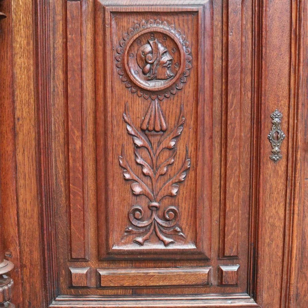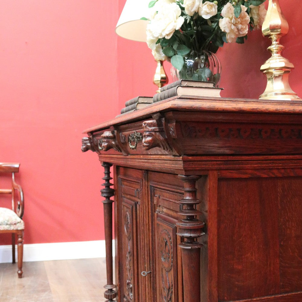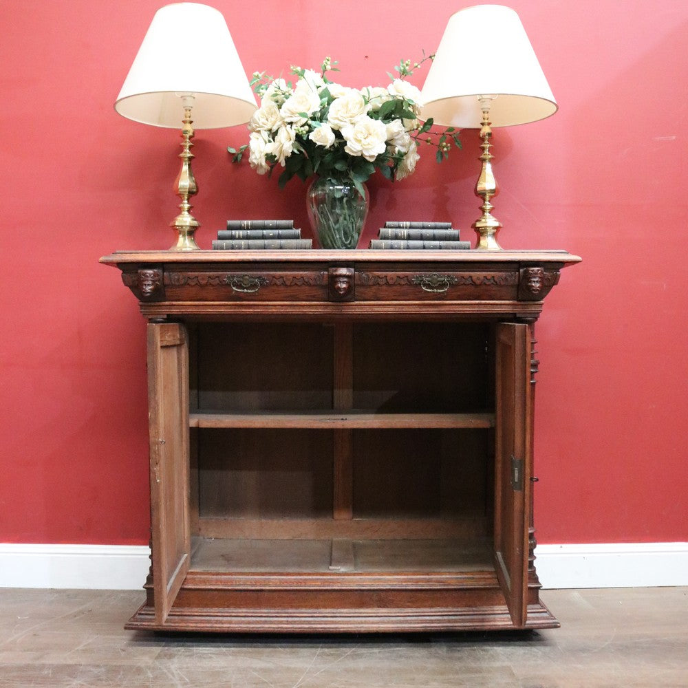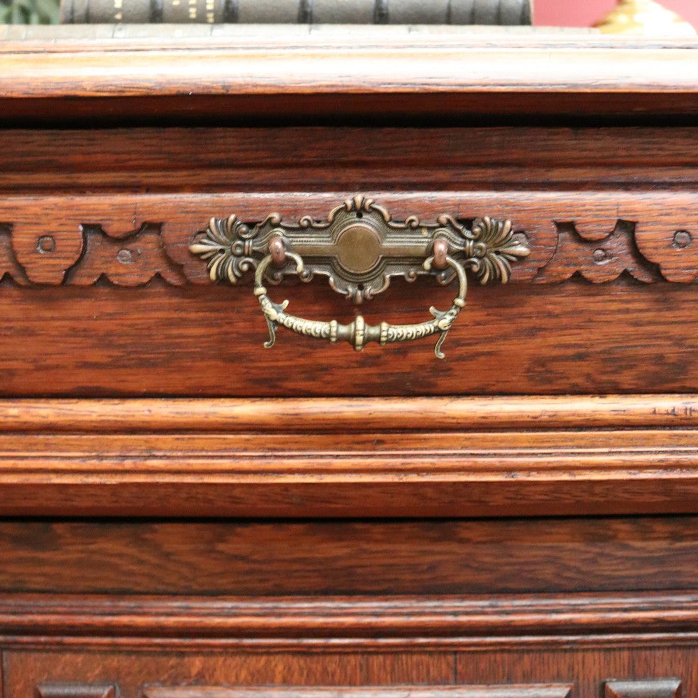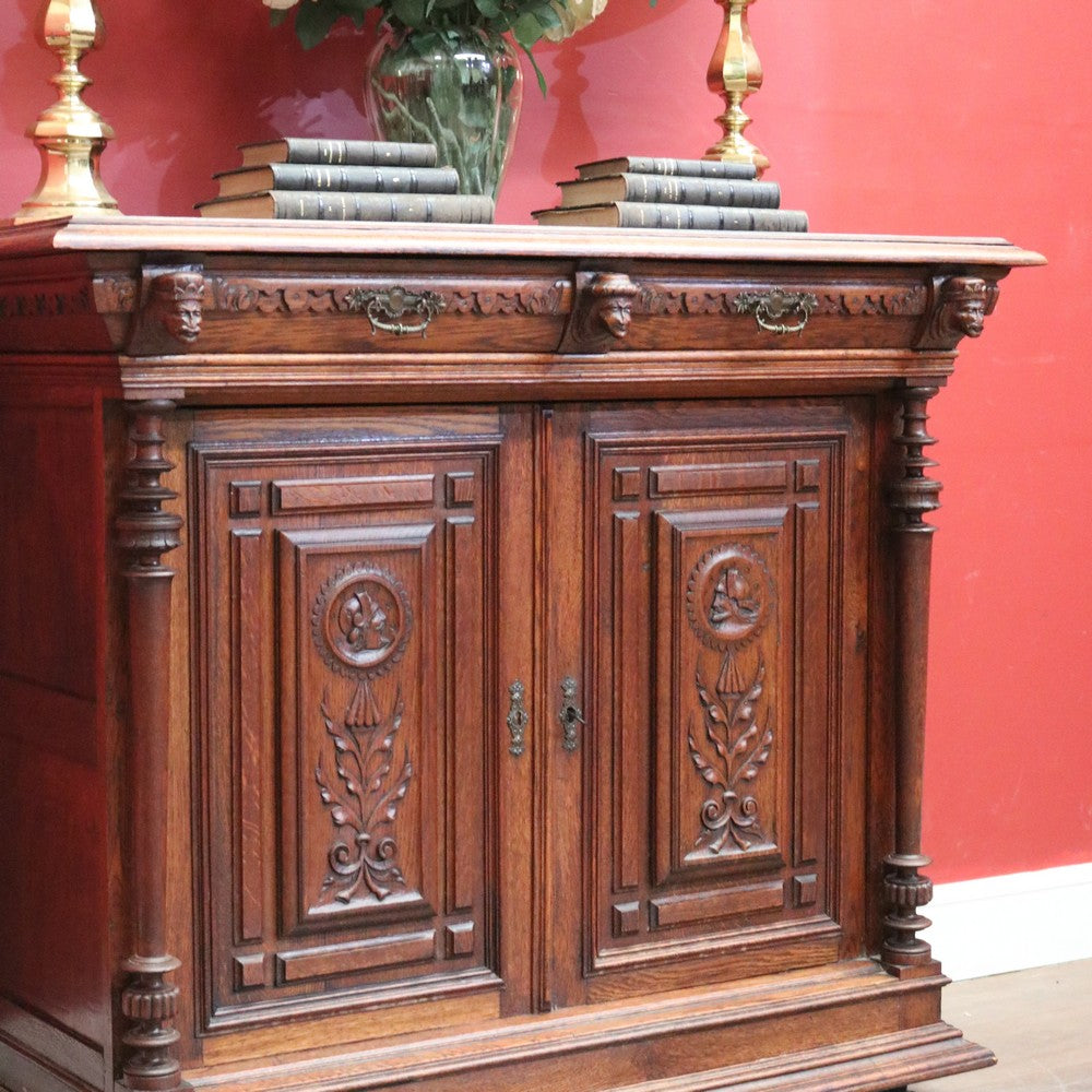 Description: A charming antique French oak cabinet featuring two drawers and two carved panelled doors with delicate floral details. Complete with brass handles and original key. Inside offers practical storage with 26 cm (top) and 39 cm (bottom) spaces. Elegant and full of character, a beautiful piece for any home.