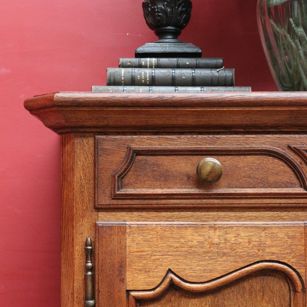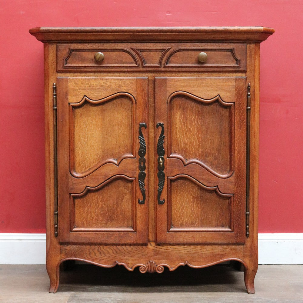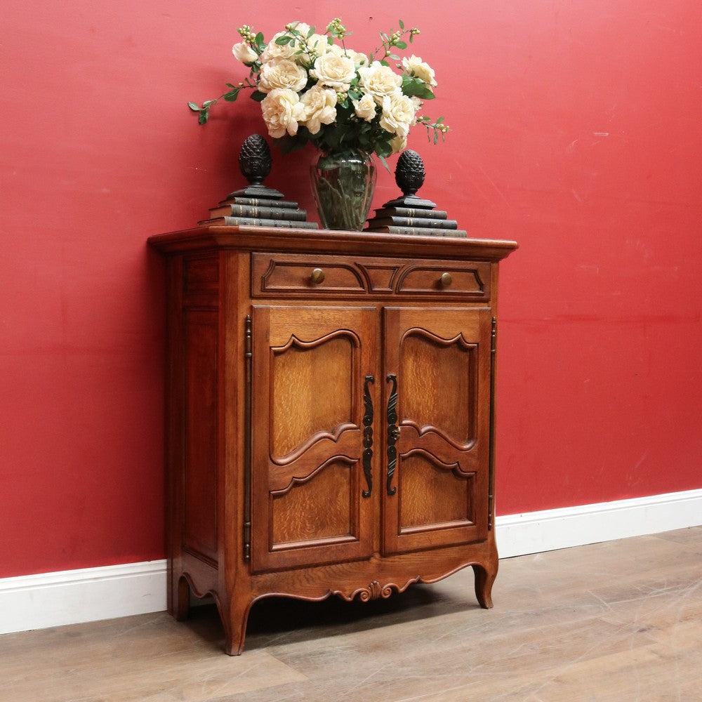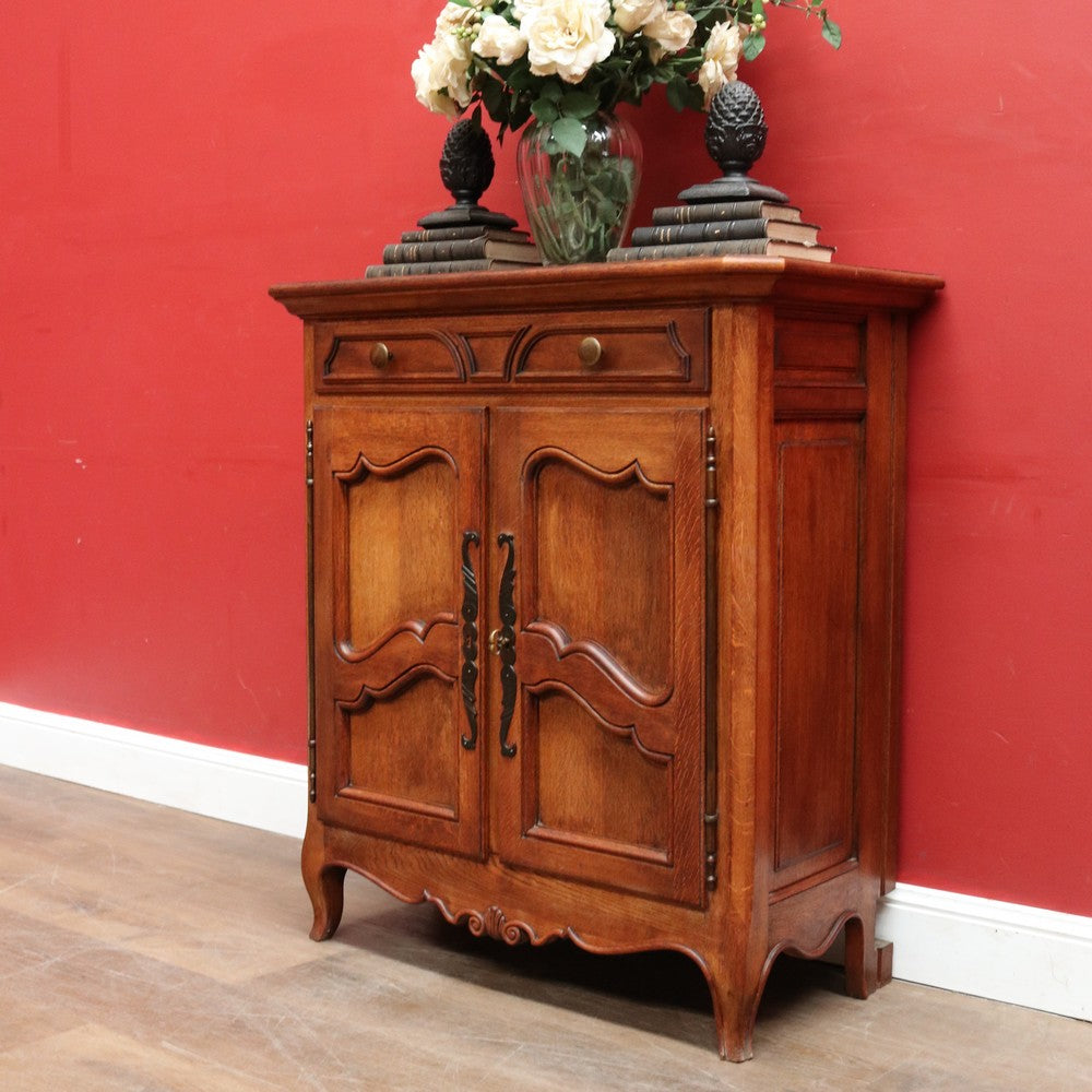 Description: This antique French oak two-door hall cabinet offers practical storage with attractive detailing. The long single drawer sits above two panelled doors, creating a balanced façade with classic French styling. The cabinet features external hinges, brass handles and a fixed internal shelf. The upper shelf space is approximately 30 cm high, and the lower space is approximately 31 cm high, providing generous room for household items, books, or display pieces.