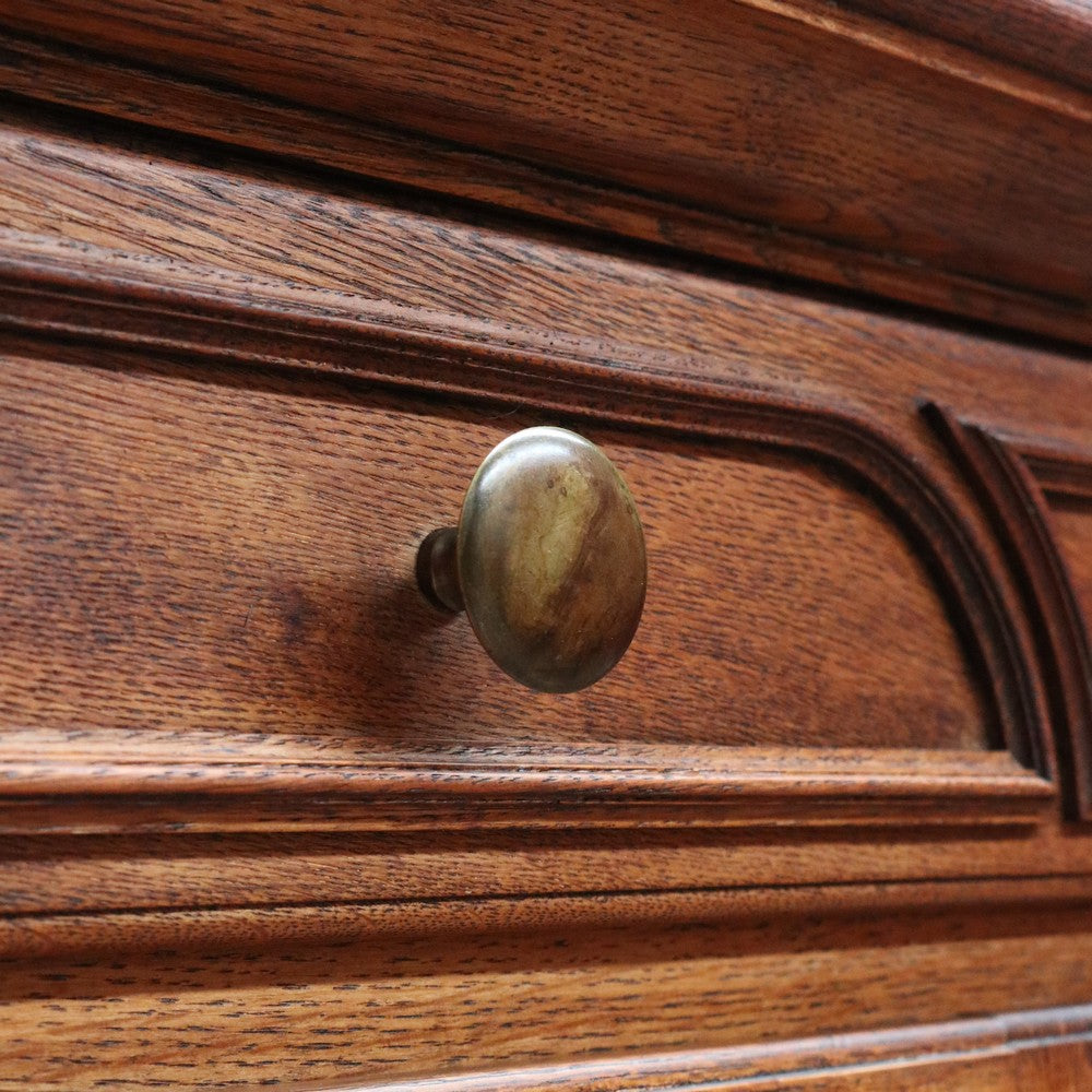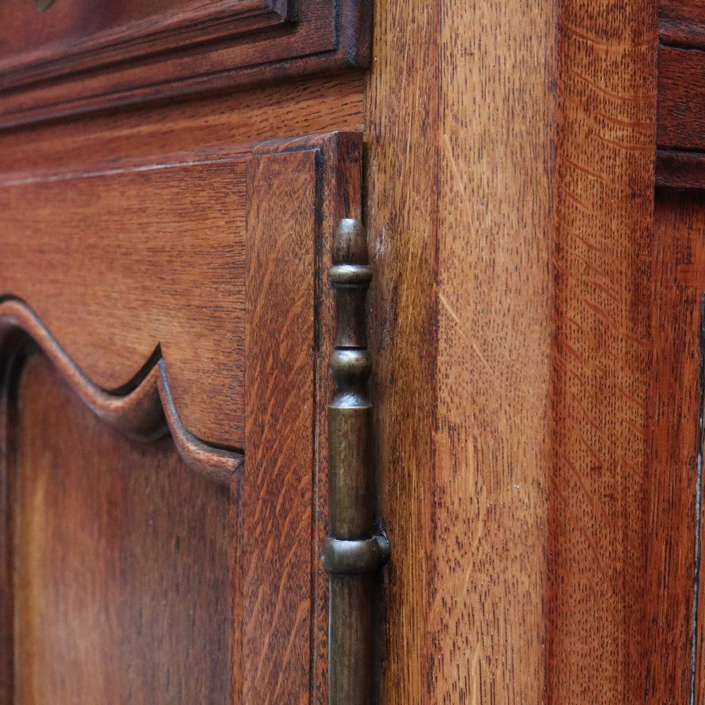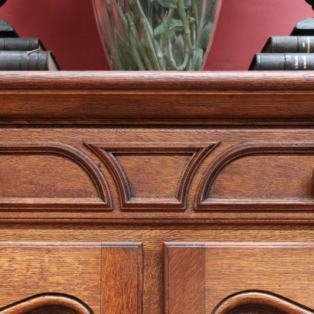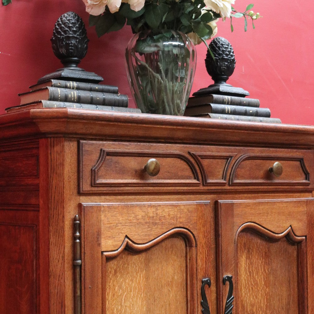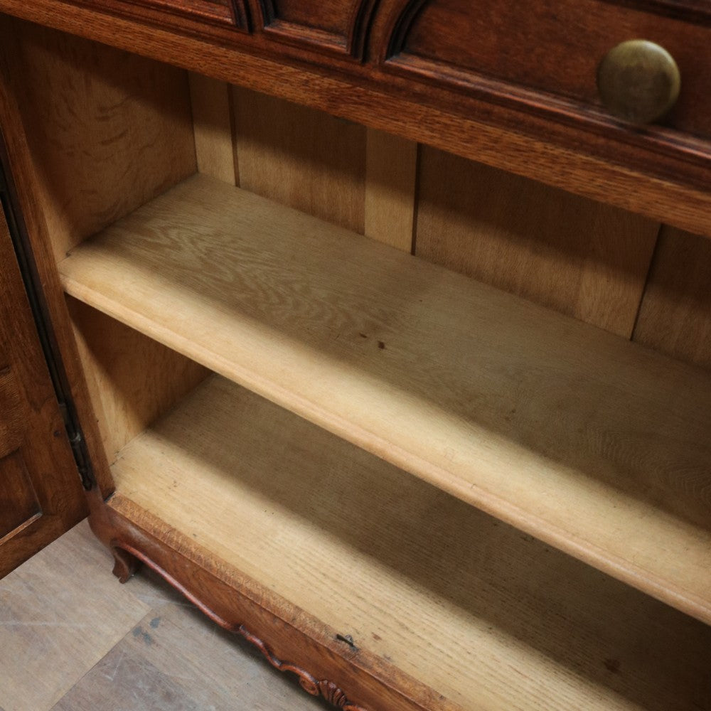 Description: This antique French oak two-door hall cabinet offers practical storage with attractive detailing. The long single drawer sits above two panelled doors, creating a balanced façade with classic French styling. The cabinet features external hinges, brass handles and a fixed internal shelf. The upper shelf space is approximately 30 cm high, and the lower space is approximately 31 cm high, providing generous room for household items, books, or display pieces.