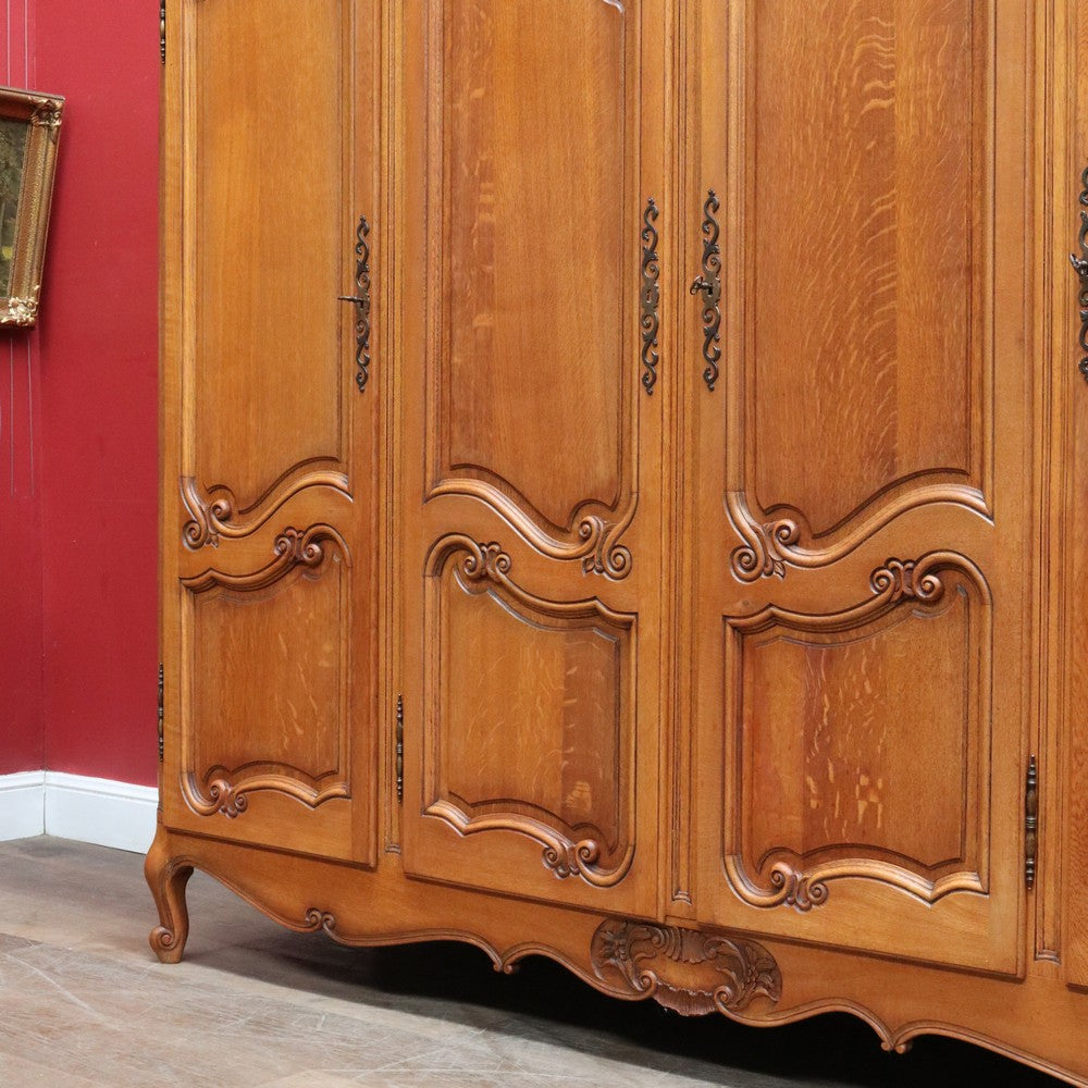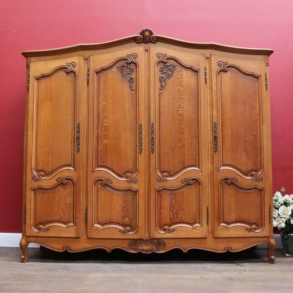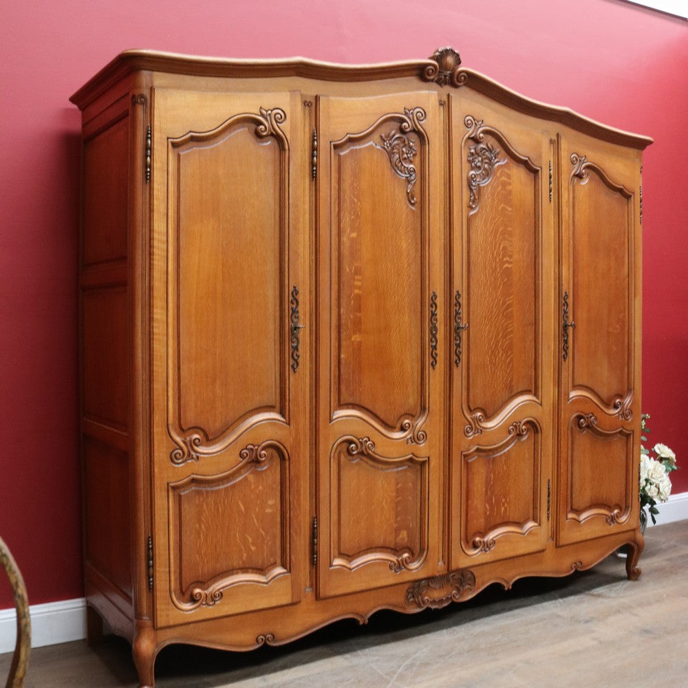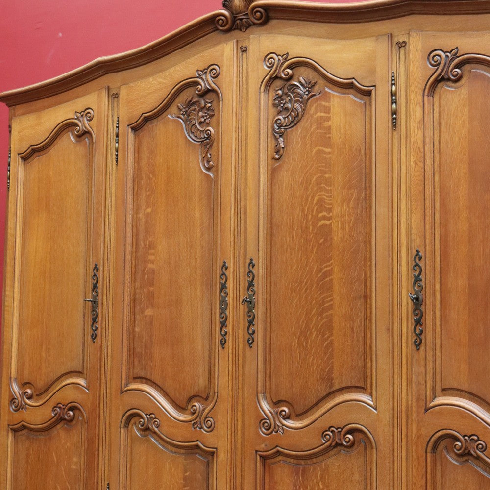 Description: An antique French oak wardrobe or armoire with four doors and beautifully carved detail throughout. The central double doors open to reveal a complete hanging section with a depth of approximately 52 cm and a width of 106 cm. Behind the left-hand door is an additional hanging area, also 52 cm deep and 52 cm wide, providing generous, practical storage.