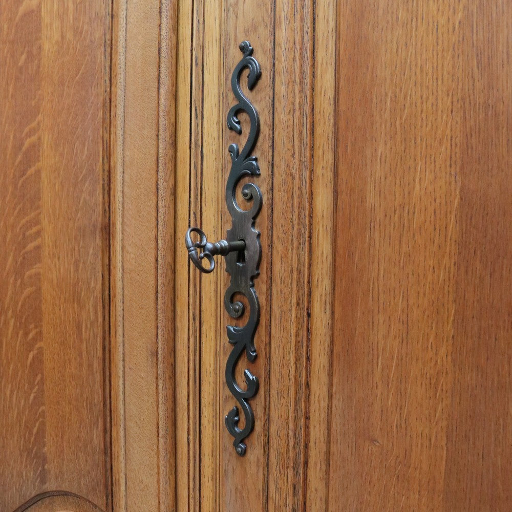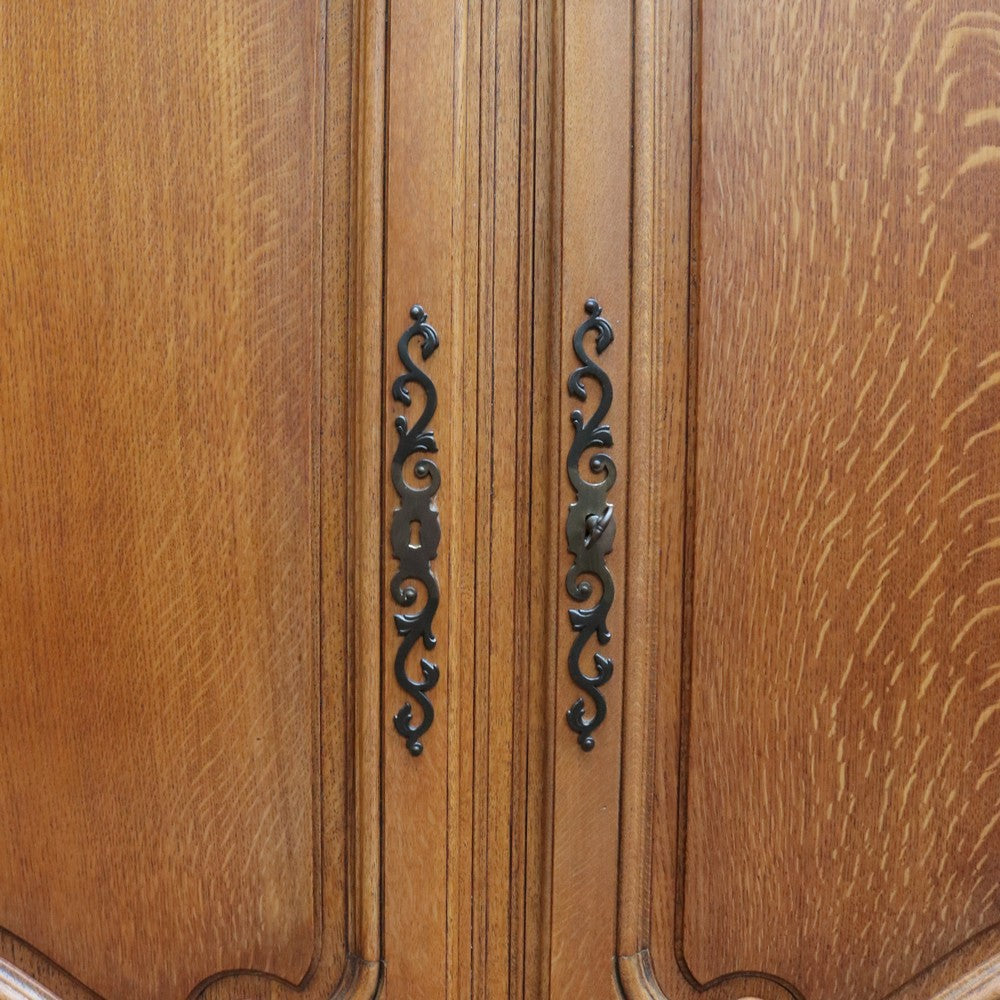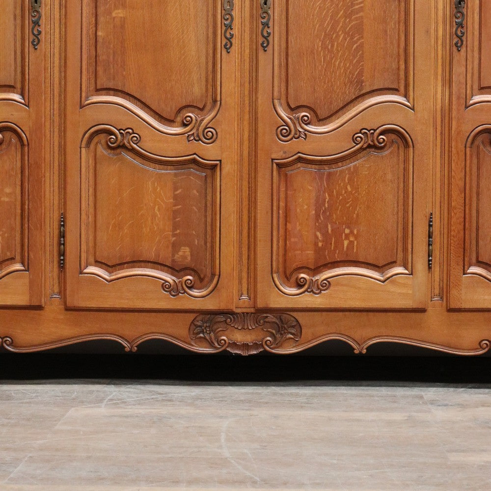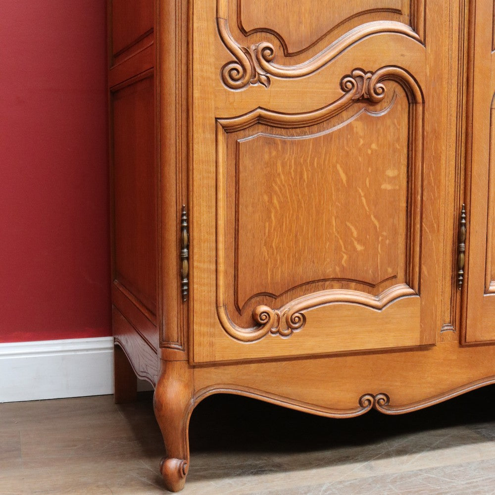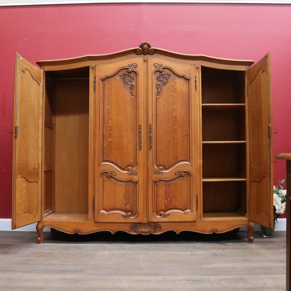 Description: An antique French oak wardrobe or armoire with four doors and beautifully carved detail throughout. The central double doors open to reveal a complete hanging section with a depth of approximately 52 cm and a width of 106 cm. Behind the left-hand door is an additional hanging area, also 52 cm deep and 52 cm wide, providing generous, practical storage.
