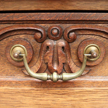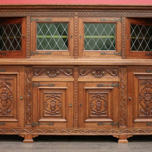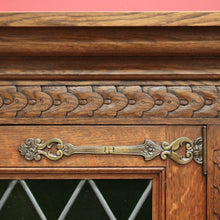 Description Leadlight doors to the top and carved doors to the base, Carved columns brass handles, escutcheons and hinges.