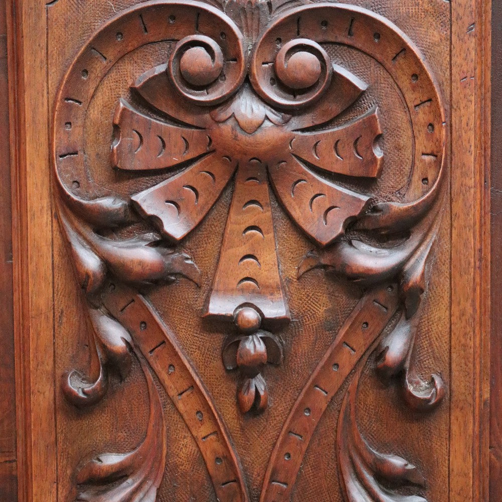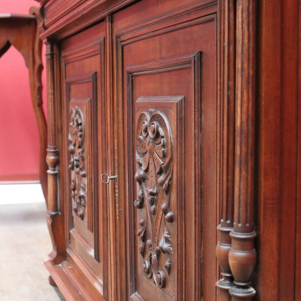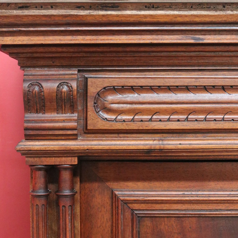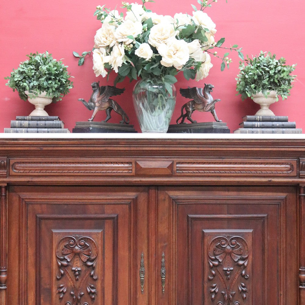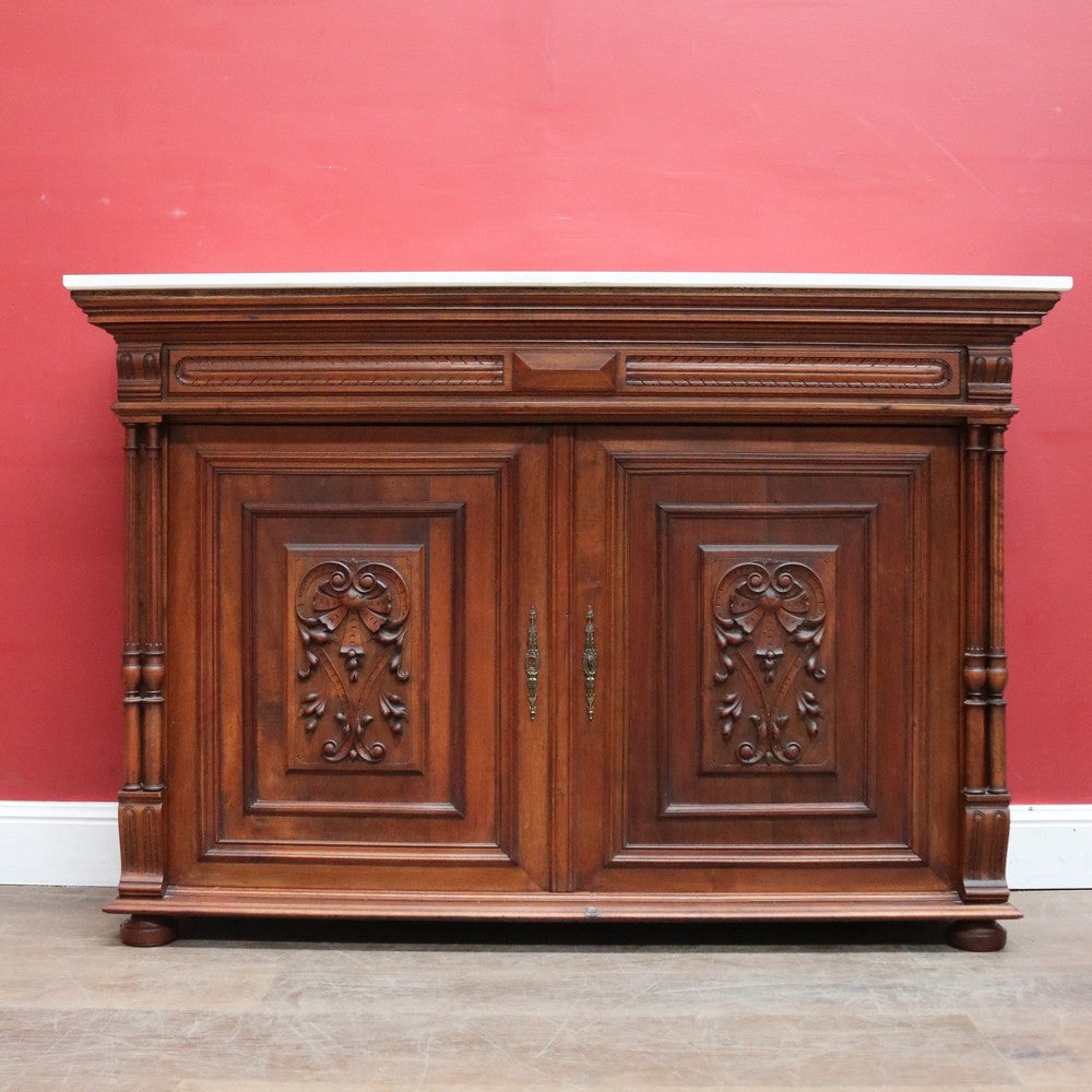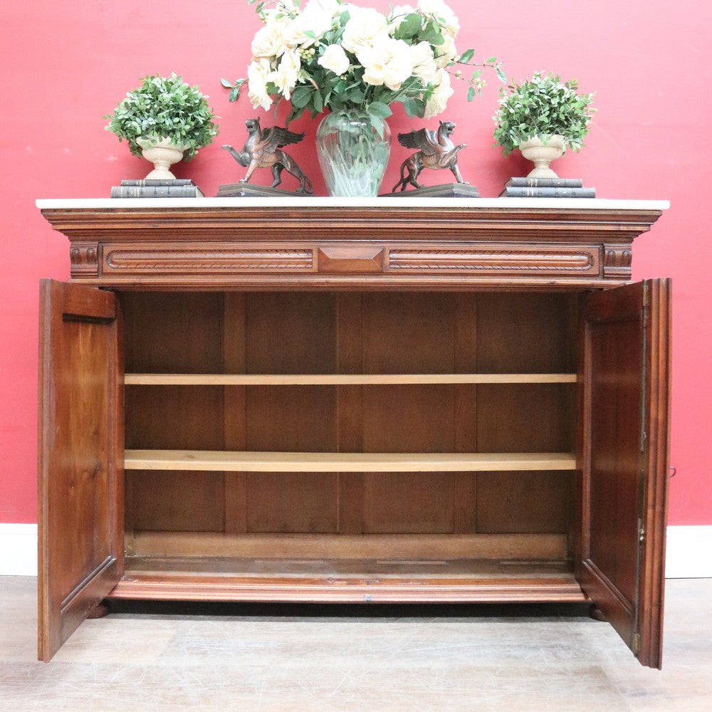Description: Antique French walnut and marble top hall cabinet that could also serve as a sideboard or cupboard. A beautifully proportioned piece featuring two carved doors with a working key and an internal shelf for storage. Twin columns frame the doors, adding balance and elegance.