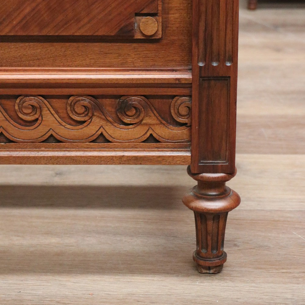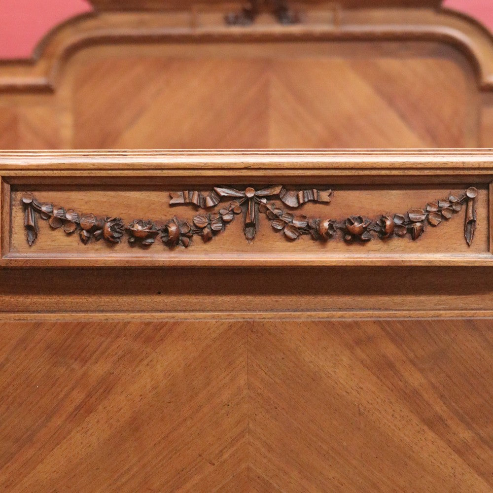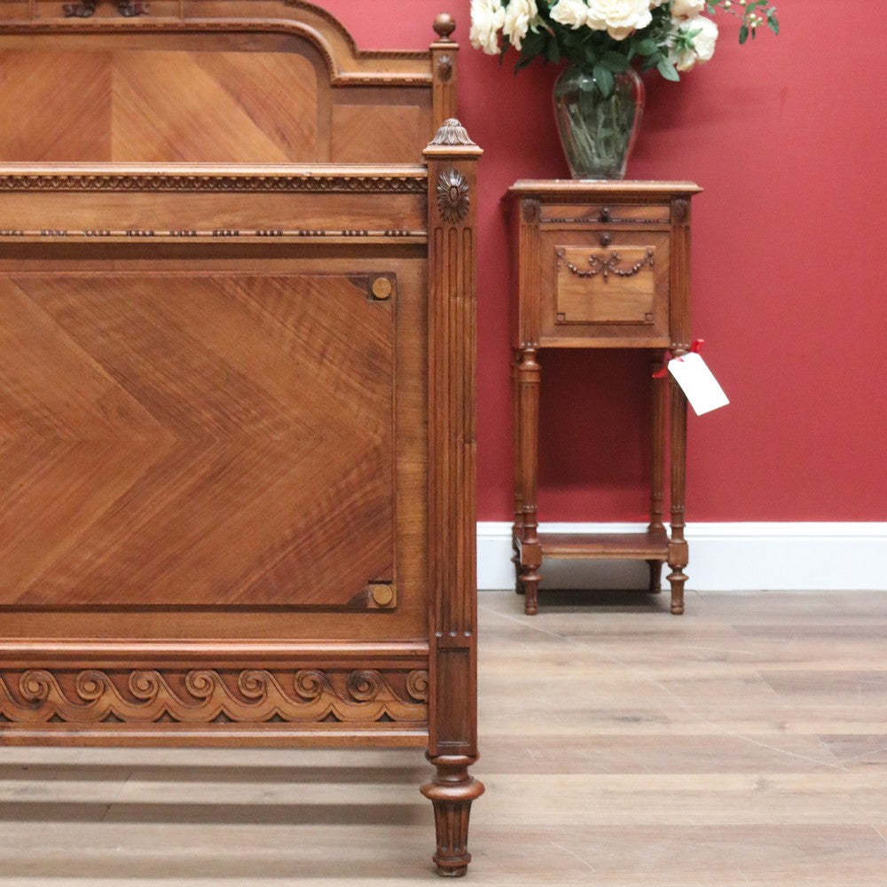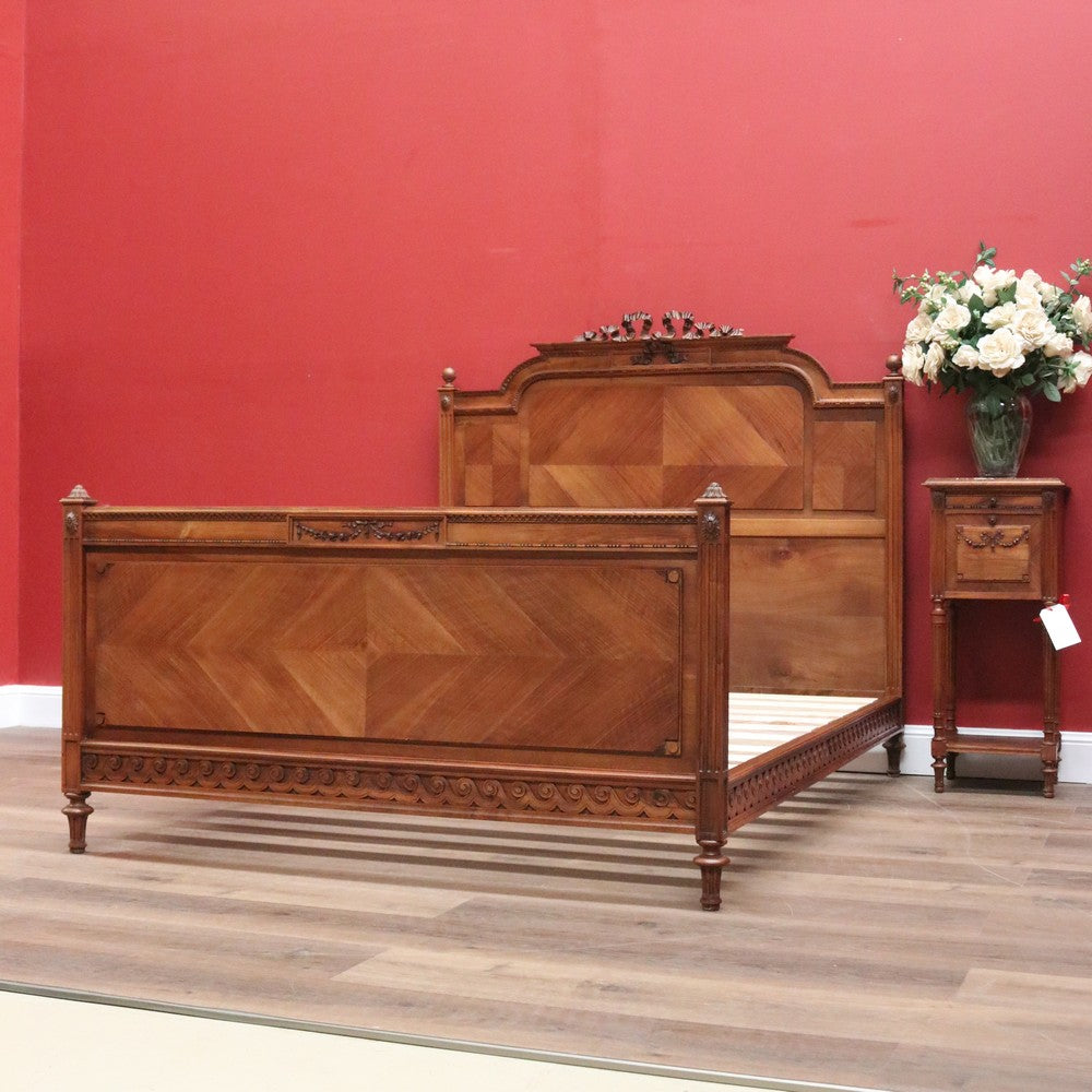 Description Just add your double mattress and your ready for a good nights sleep, this beautiful antique French bed includes slatted base. In incredible condition, carved walnut ribbon to the headboard and sea wave scrolls to the side rails.