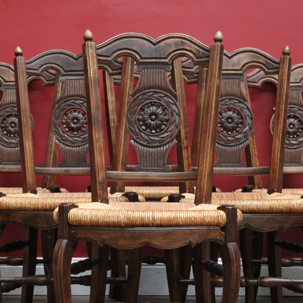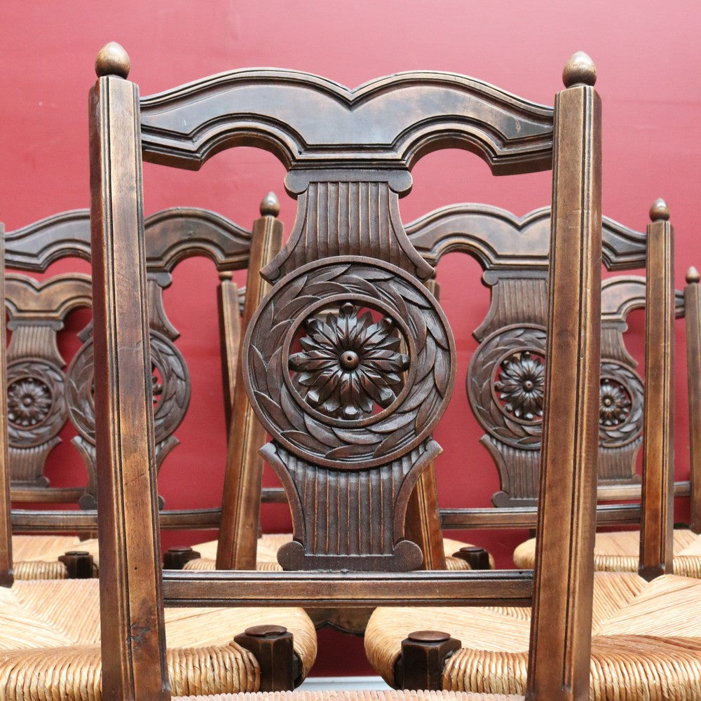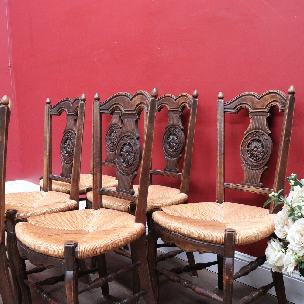 Description: A lovely set of six antique French dining or kitchen chairs, each featuring a carved top back rail and a carved floral centrepiece framed within a leaf wreath. The chairs have turned stretchers and finials, along with slightly curved backs that offer added comfort. A beautiful and inviting set, perfect for family meals or special gatherings.