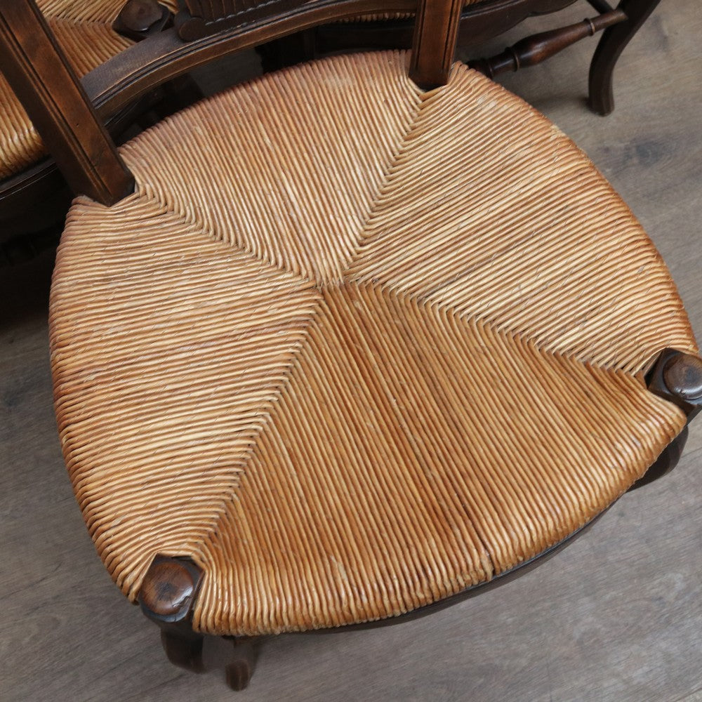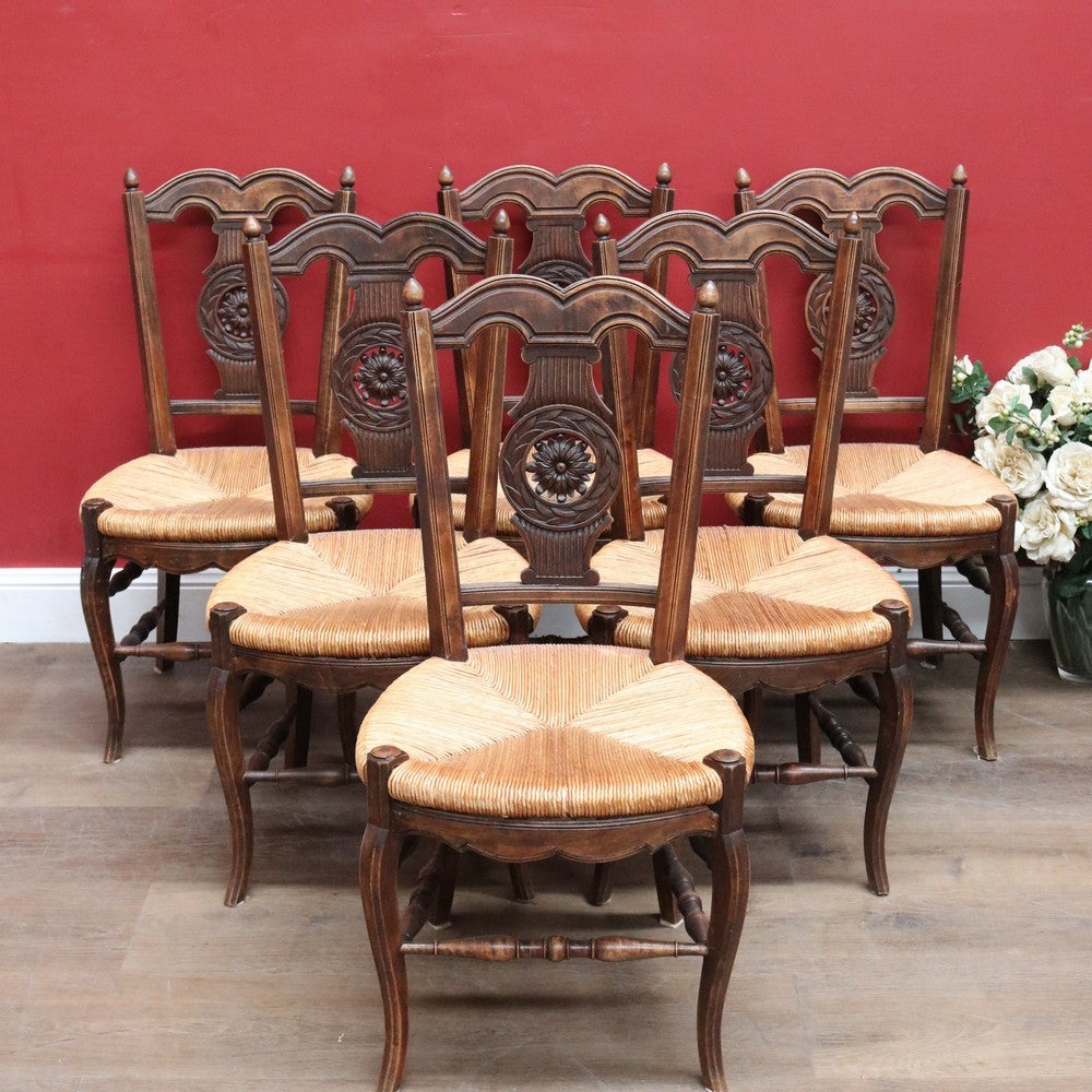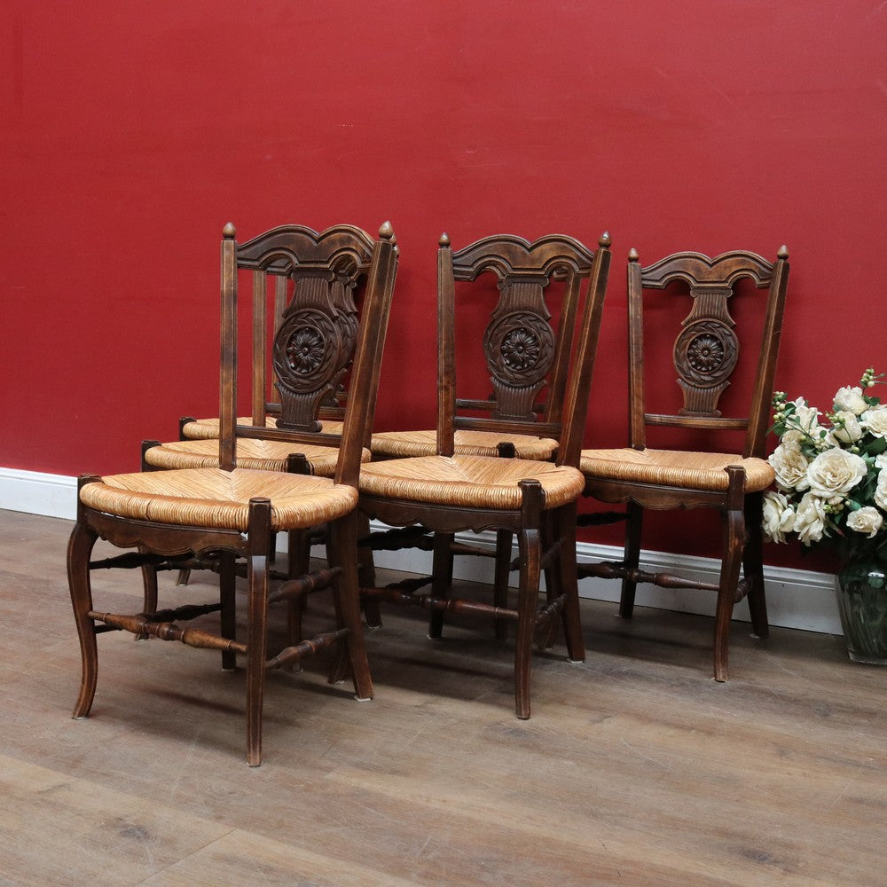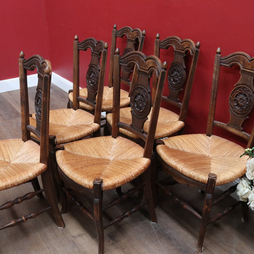 Description: A lovely set of six antique French dining or kitchen chairs, each featuring a carved top back rail and a carved floral centrepiece framed within a leaf wreath. The chairs have turned stretchers and finials, along with slightly curved backs that offer added comfort. A beautiful and inviting set, perfect for family meals or special gatherings.