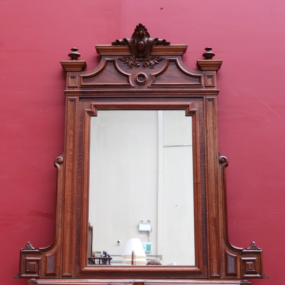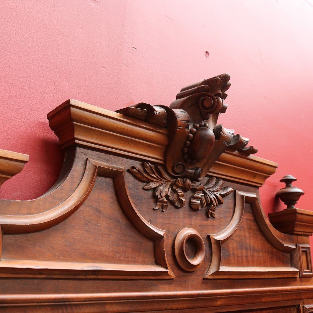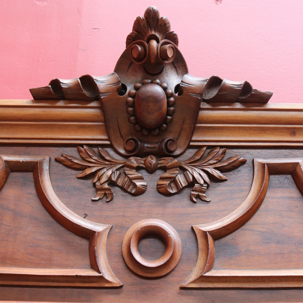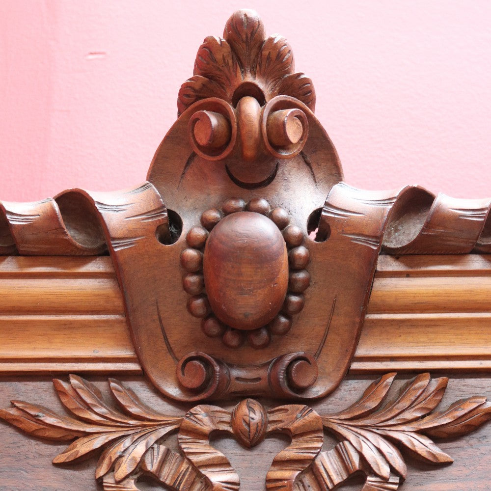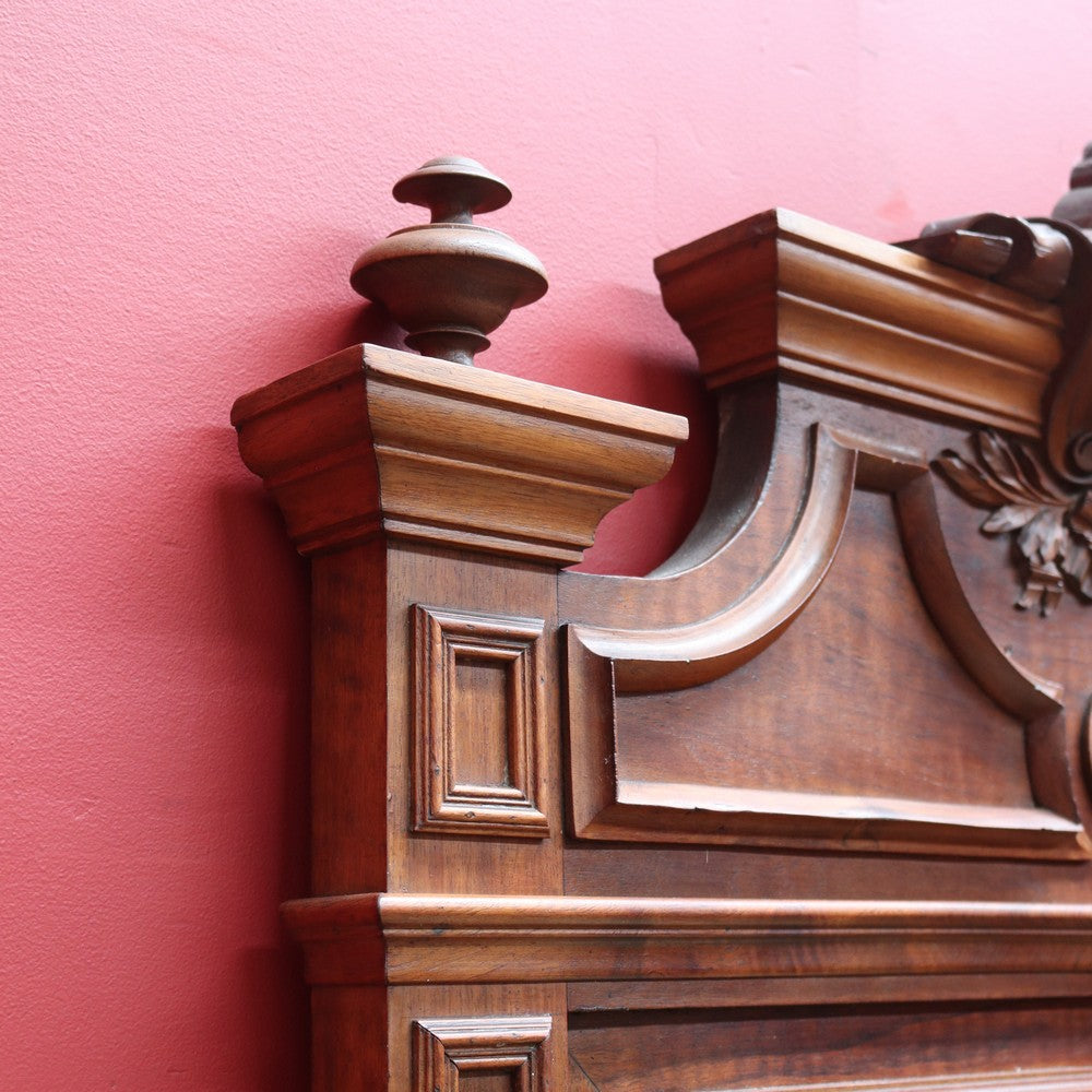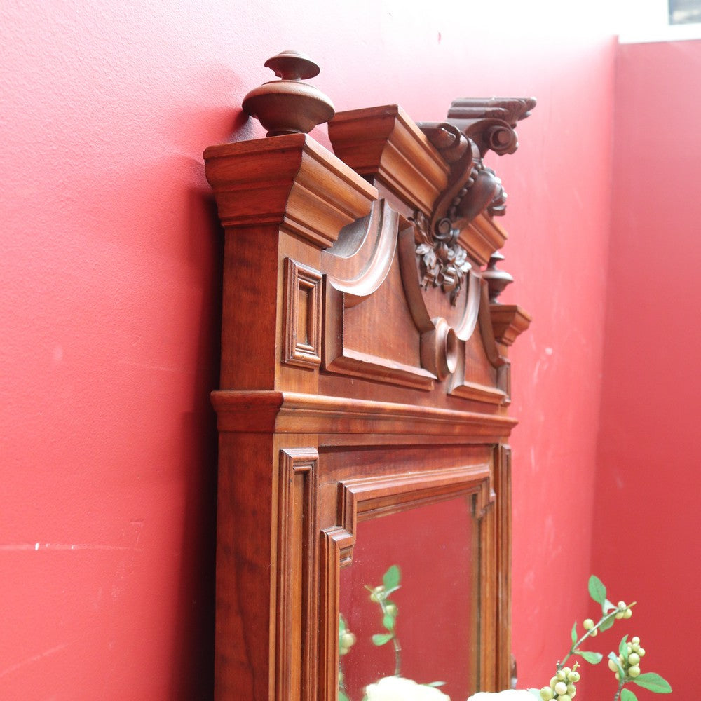 Description: Antique French walnut overmantle mirror featuring finely carved detail and a central crest. The warm walnut tones and elegant proportions make it an ideal statement piece for a living room or entrance.