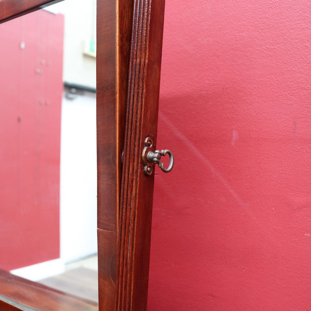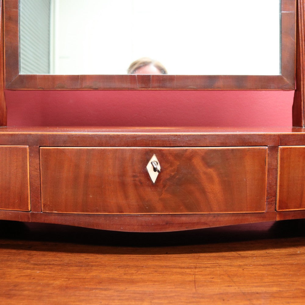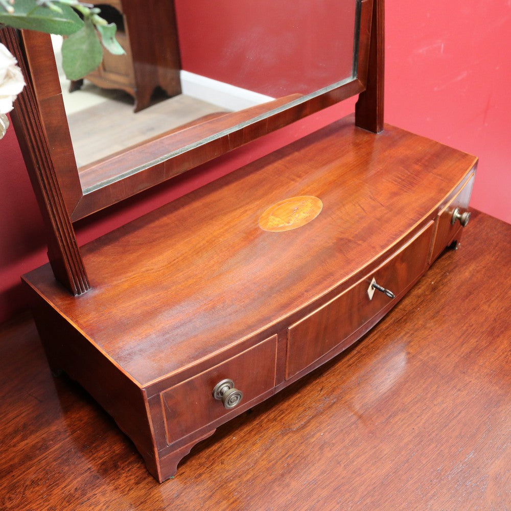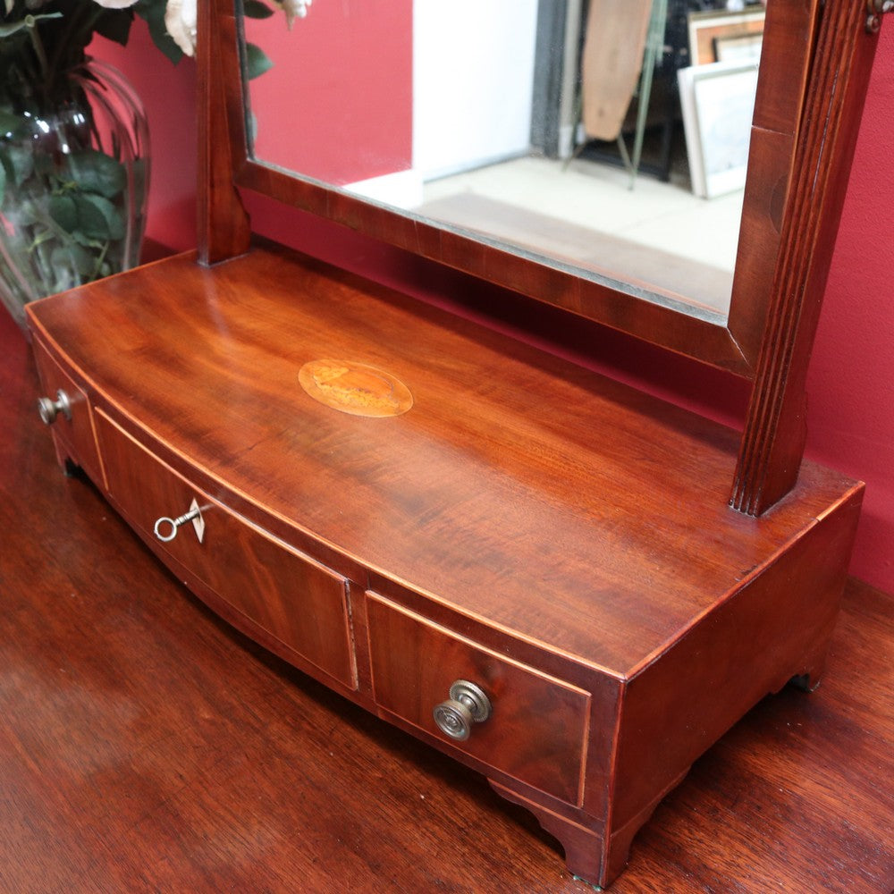 Description: An antique Georgian or Regency English bowfront mirror in mahogany, featuring three drawers with brass handles and a Mother of Pearl escutcheon. The top features a shell-inlay motif, and the piece comes with a key. The swivel mirror is supported by reeded uprights and finished with brass acorn finials. A finely crafted and beautifully detailed example, ideal for a dressing table or as a feature on a sideboard.