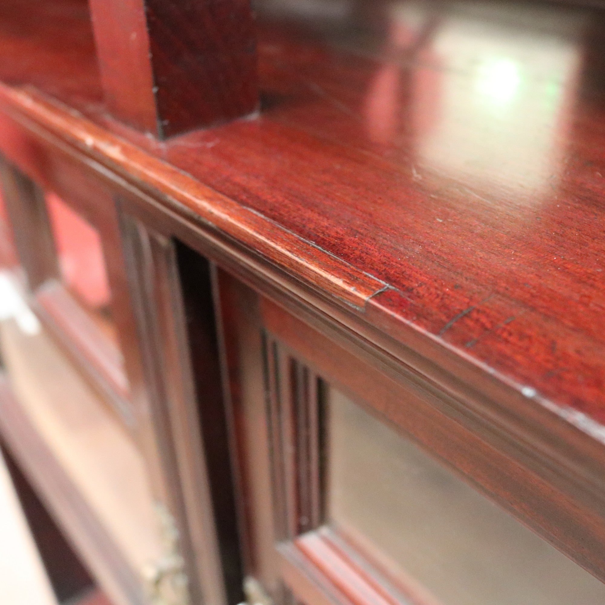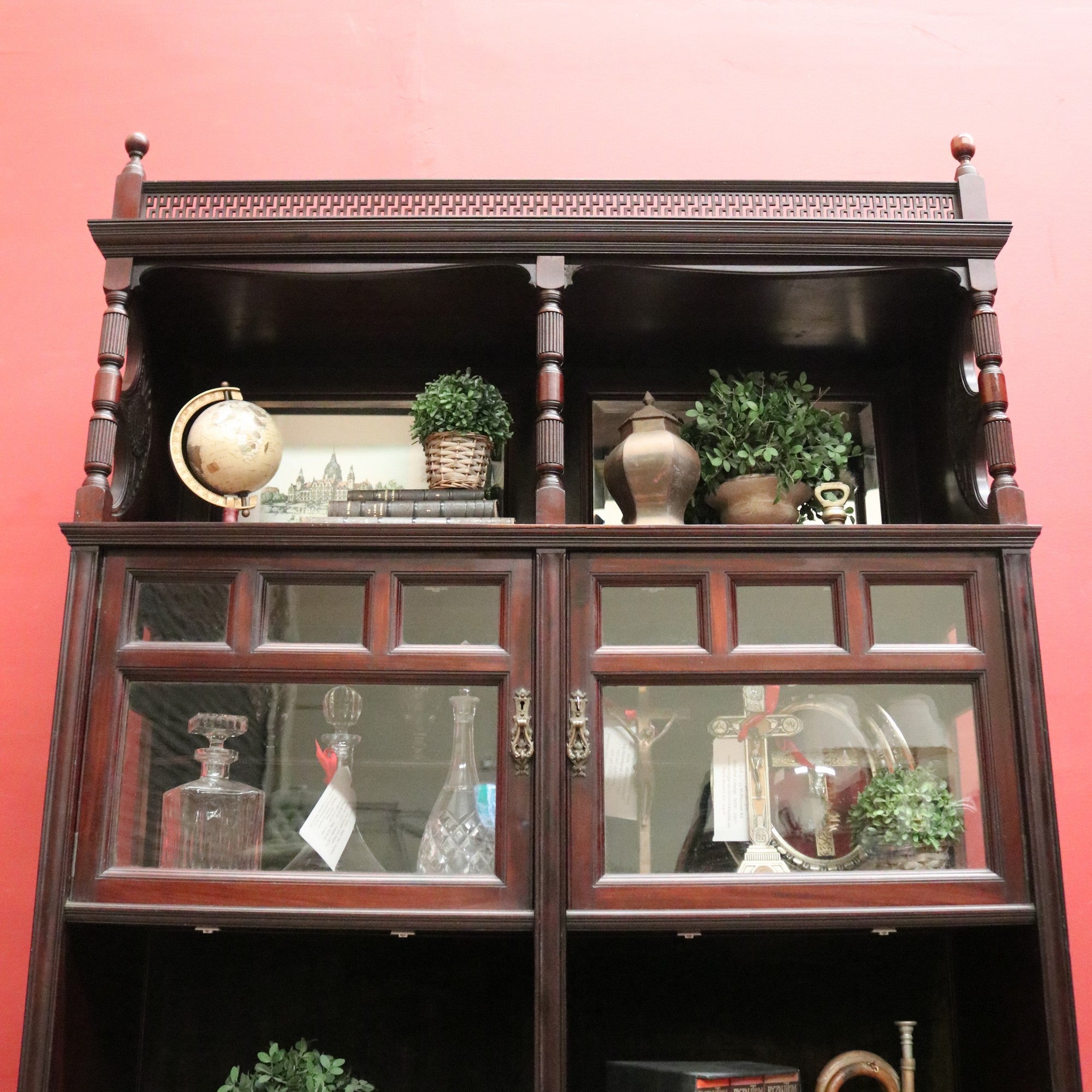 Description: An elegant antique mahogany display cabinet offering both beauty and function. The cabinet features two lower drawers with brass handles. Above, the glazed central doors—also lockable—are flanked by glass side panels, allowing excellent visibility of displayed treasures.