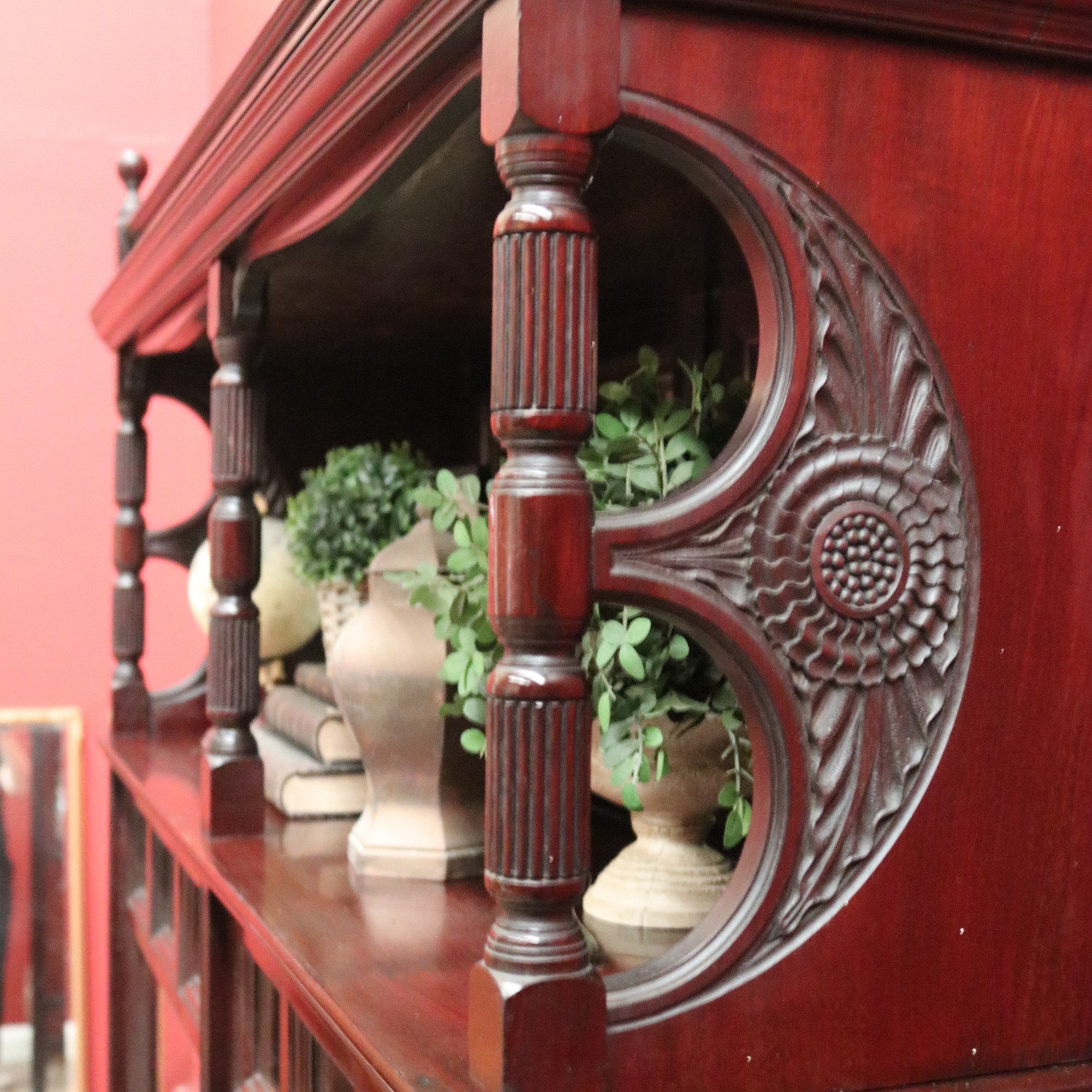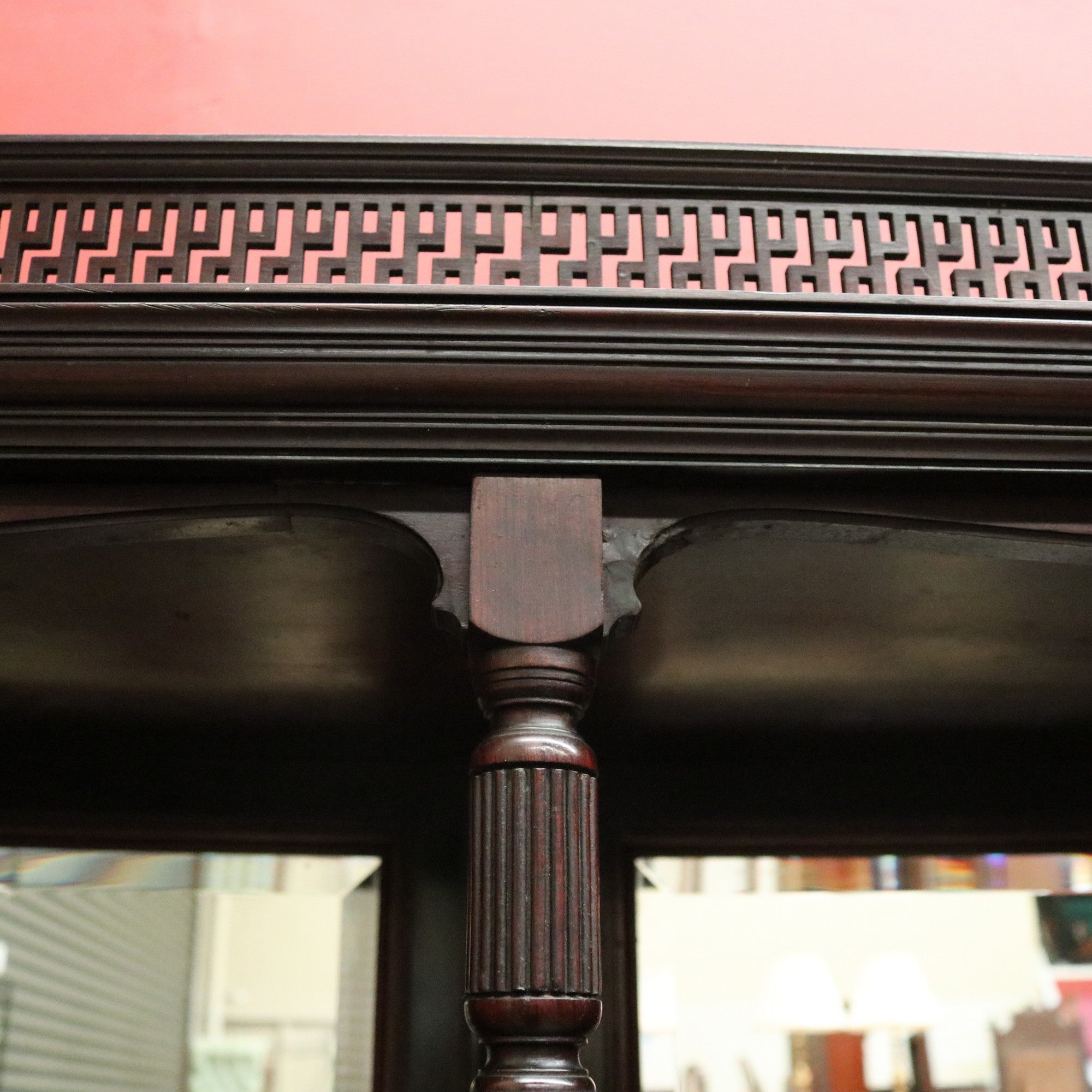 The upper section features a bevelled mirrored back that enhances light and depth, framed with delicate, carved details. Atop, intricate fretwork capping crowns the piece, adding a striking decorative flourish.