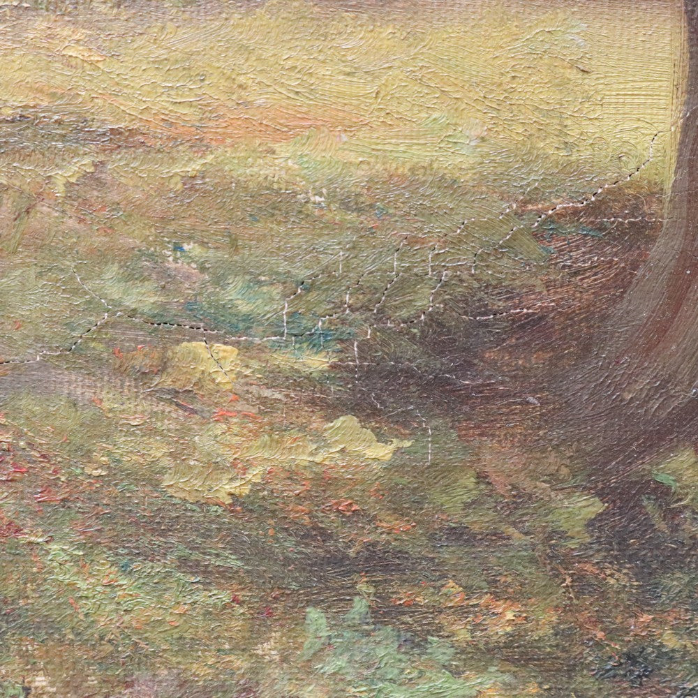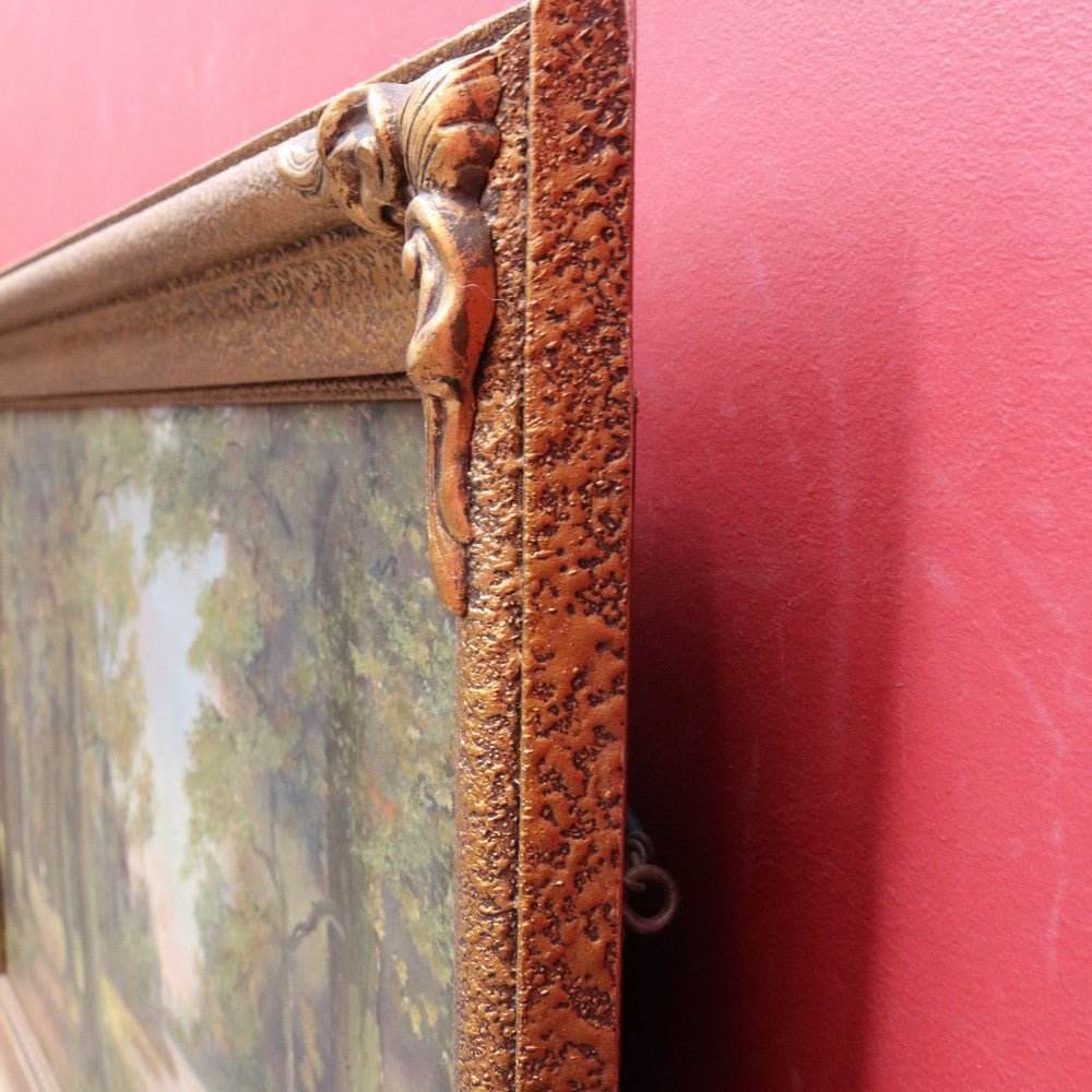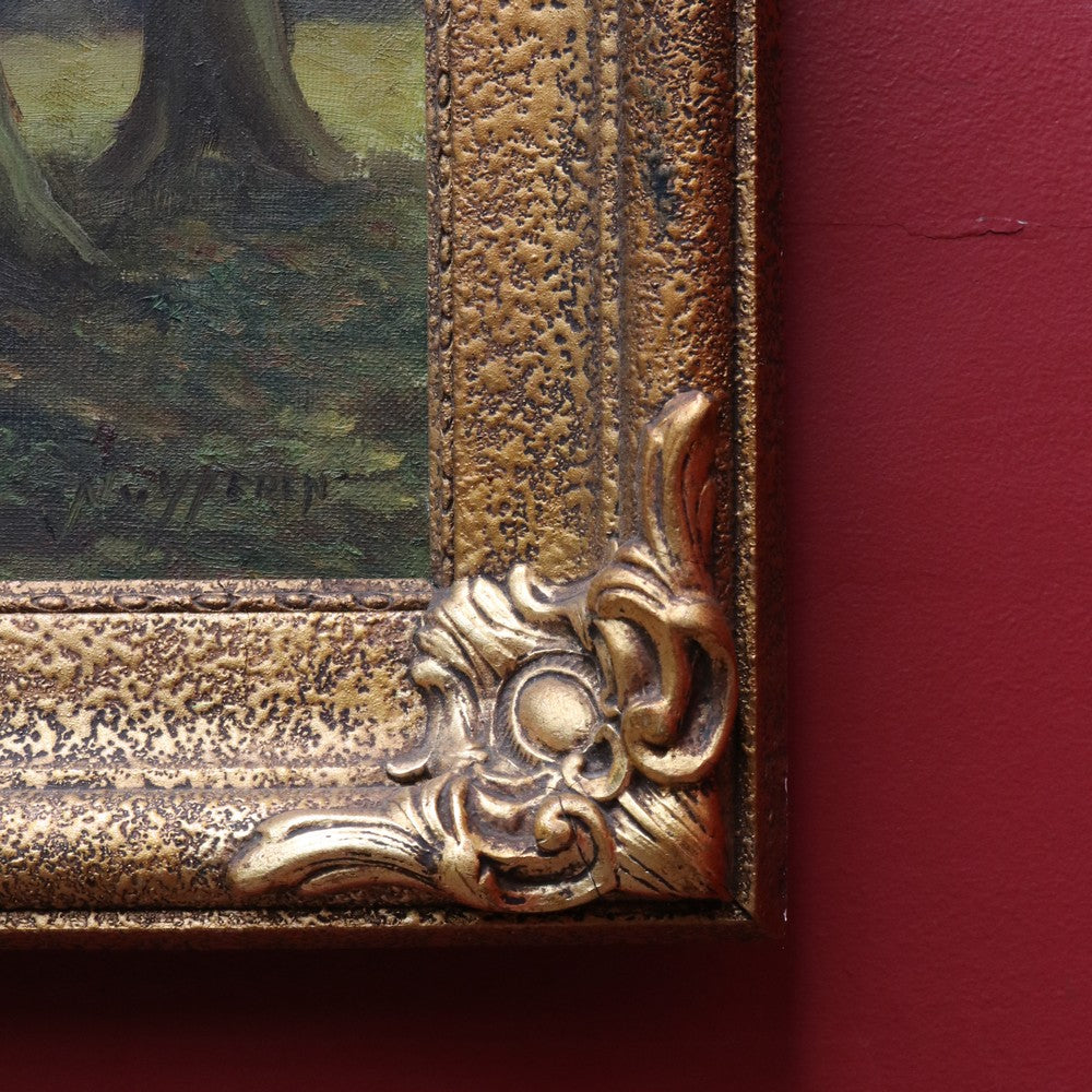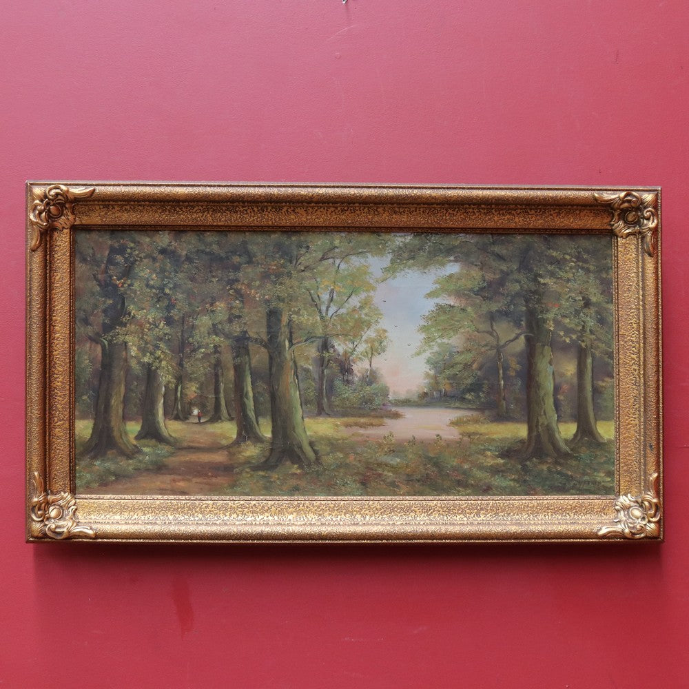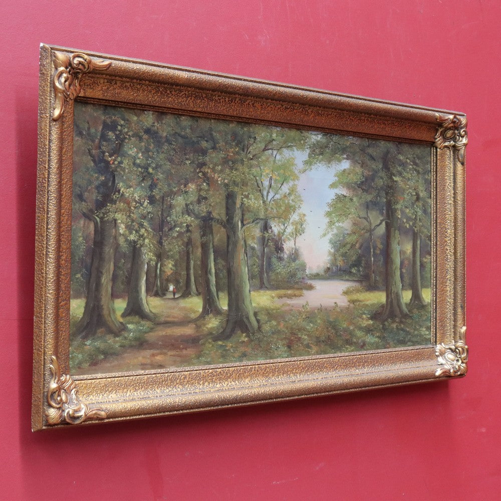Description: An antique gilt-framed oil on canvas depicting a peaceful country scene, signed to the lower right (appears to read “Nuyperen”). The artwork features a forest landscape with a winding path, sunlit trees and soft tonal detail. Possibly Flemish in origin. A calming and atmospheric piece, beautifully presented in its gilt frame.