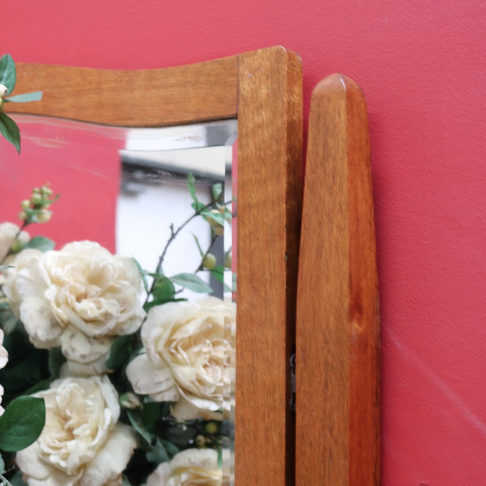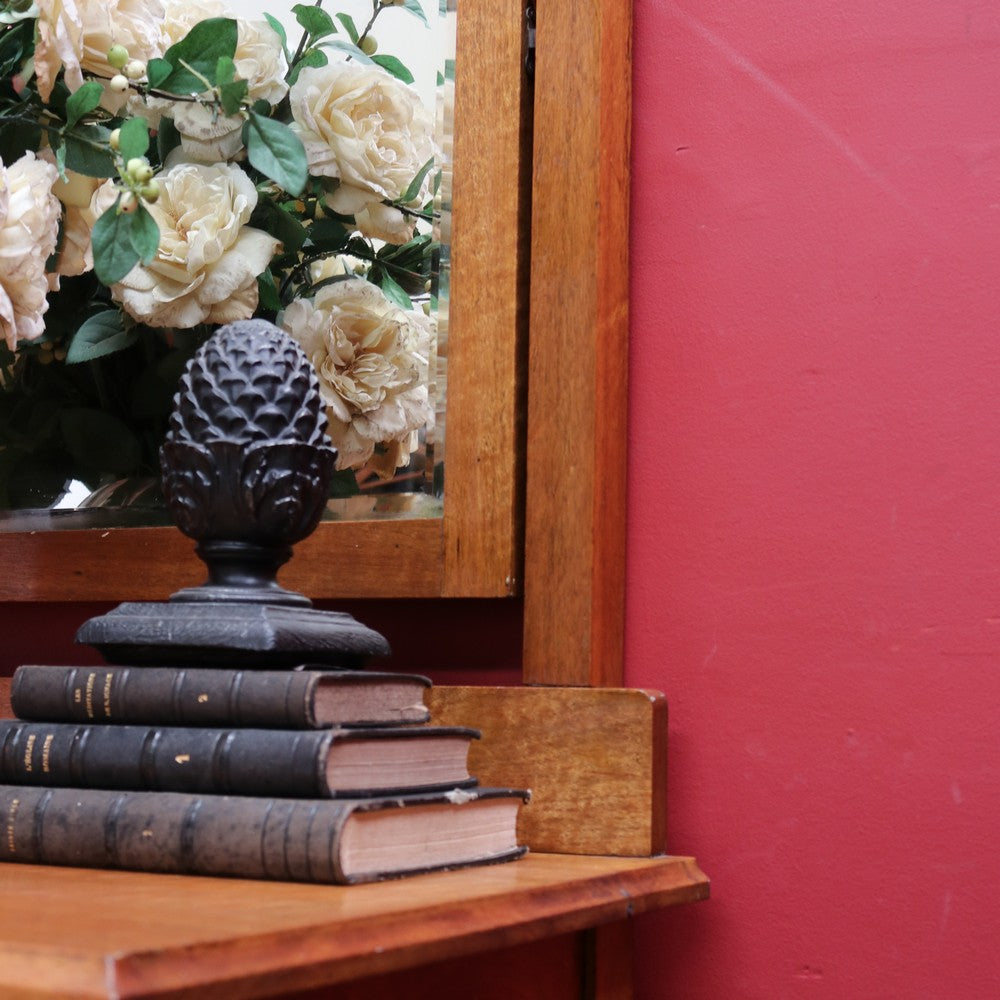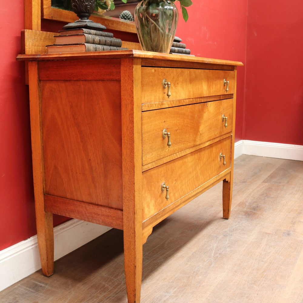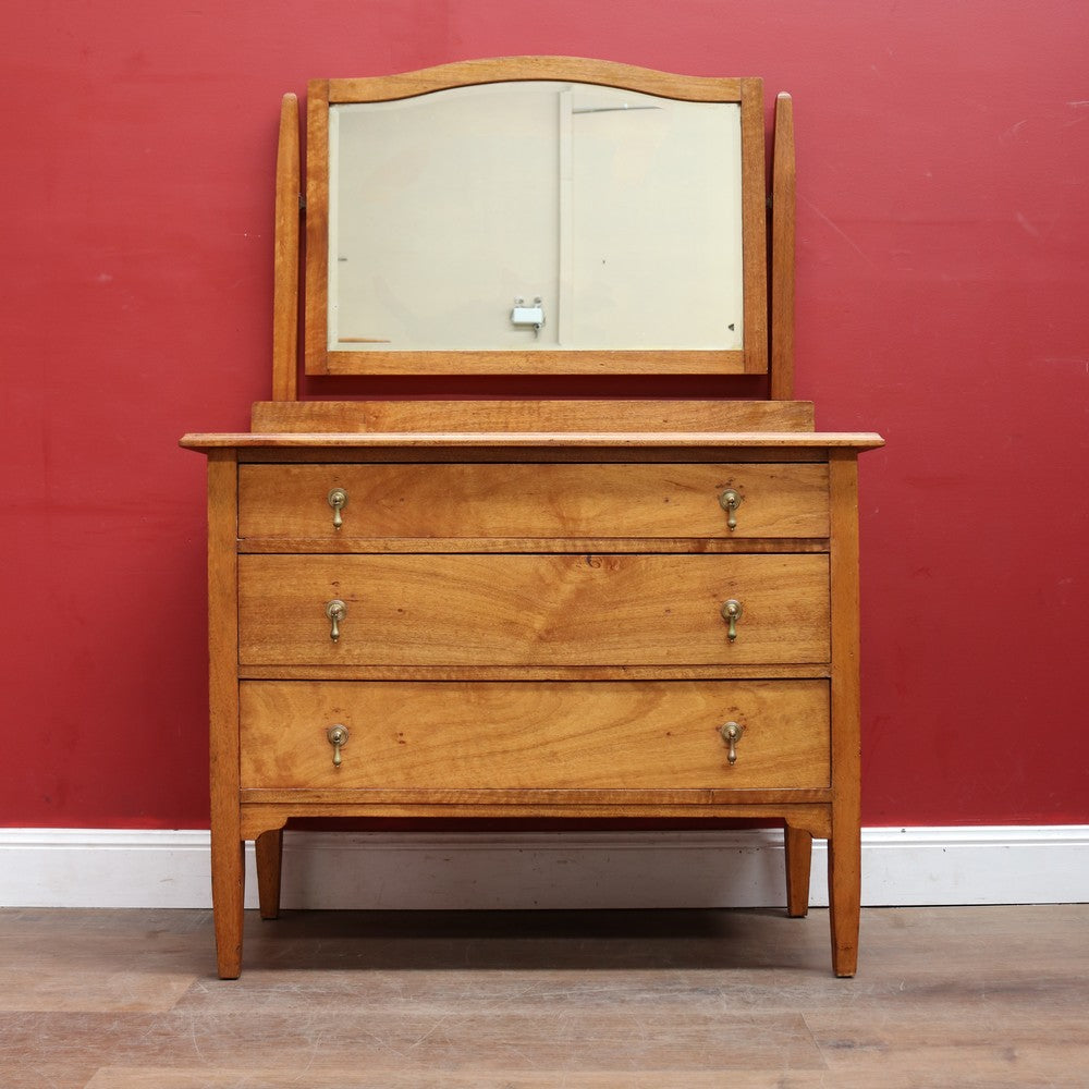 Description: Australian maple dressing table featuring three drawers with brass handles and an adjustable mirror above. Crafted from warm-toned maple, the piece has a gentle sheen and elegant simplicity typical of Australian design.