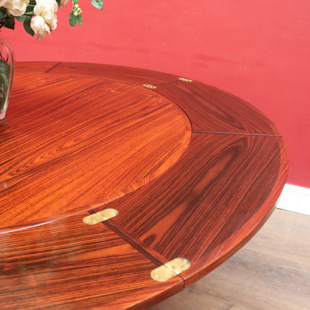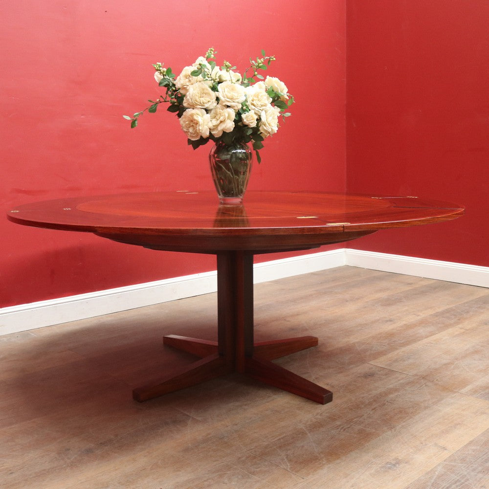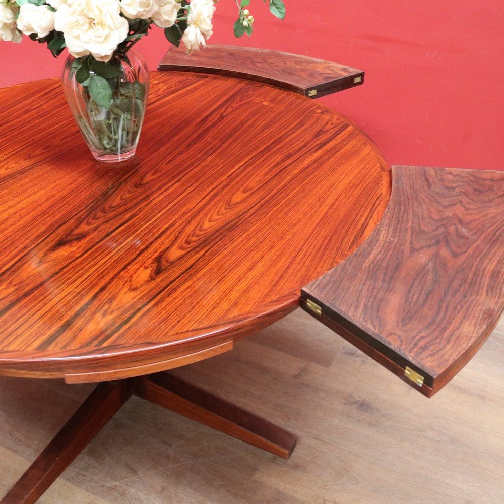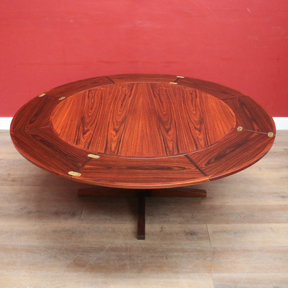 Description: A beautifully crafted expanding dining table by Dyrlund, Made in Denmark. The top is round with a removable pedestal base and four foldable extension leaves hidden beneath the tabletop. In the stored position, the leaves fold and slide under the top, offering a compact diameter of ~130 cm. When extended, the table opens out to ~180 cm across, comfortably seating a larger number of family or guests.