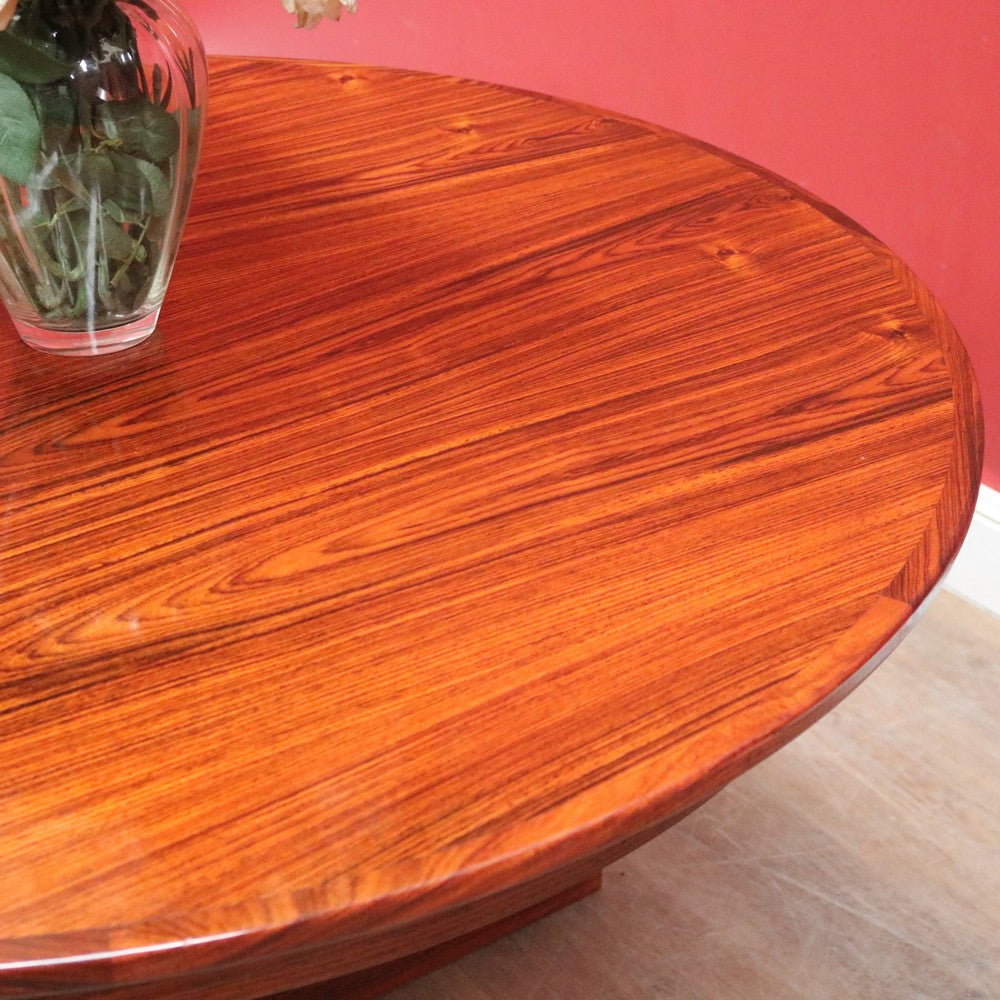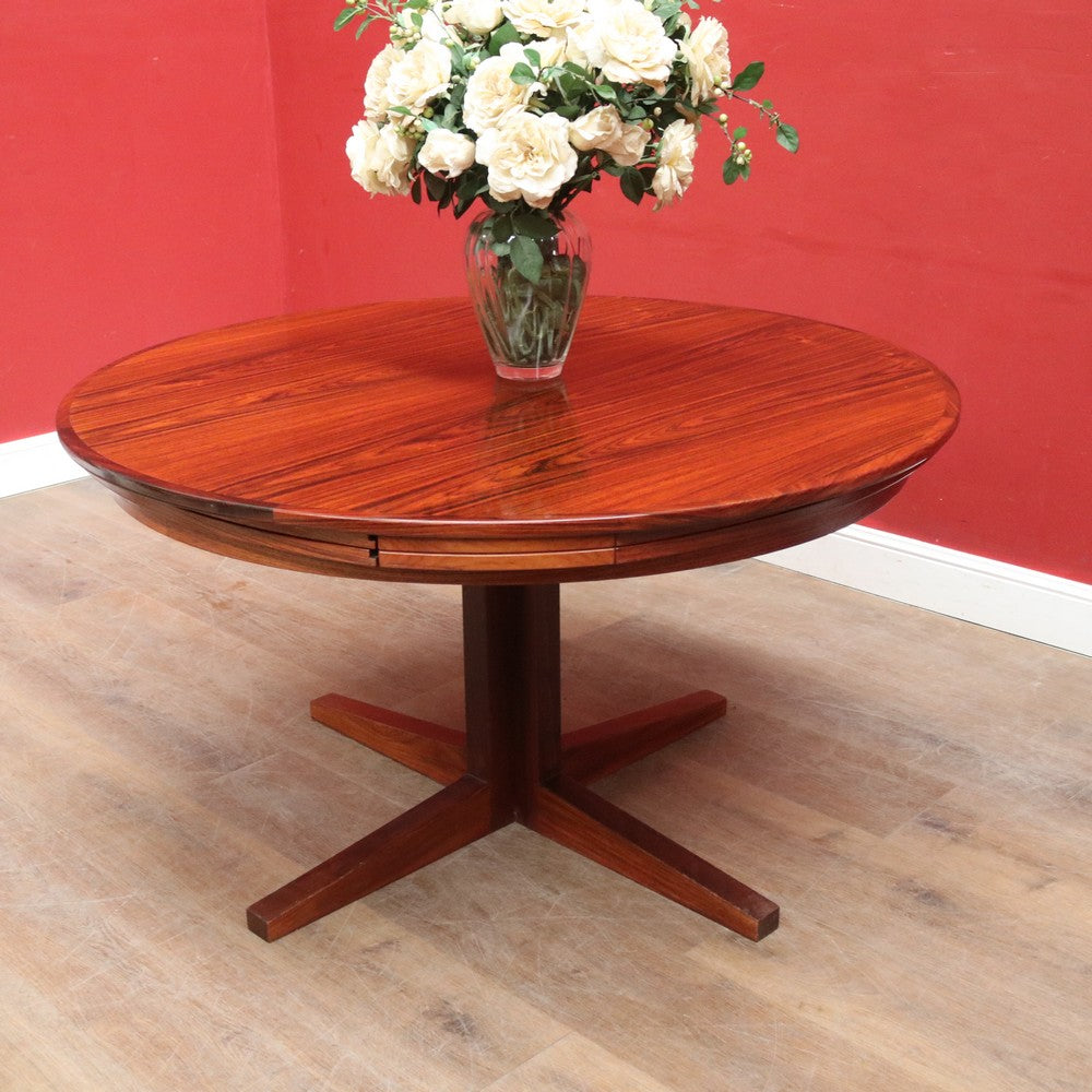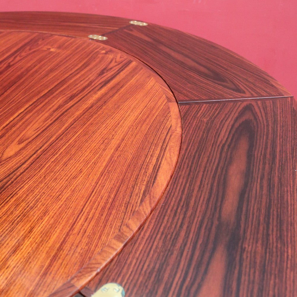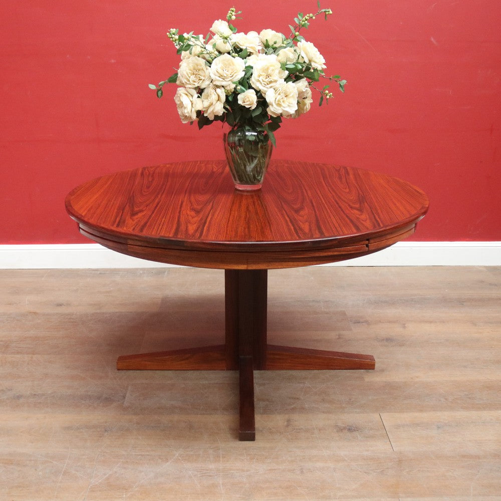Description: A beautifully crafted expanding dining table by Dyrlund, Made in Denmark. The top is round with a removable pedestal base and four foldable extension leaves hidden beneath the tabletop. In the stored position, the leaves fold and slide under the top, offering a compact diameter of ~130 cm. When extended, the table opens out to ~180 cm across, comfortably seating a larger number of family or guests.